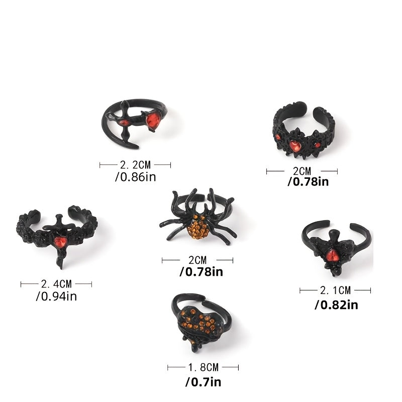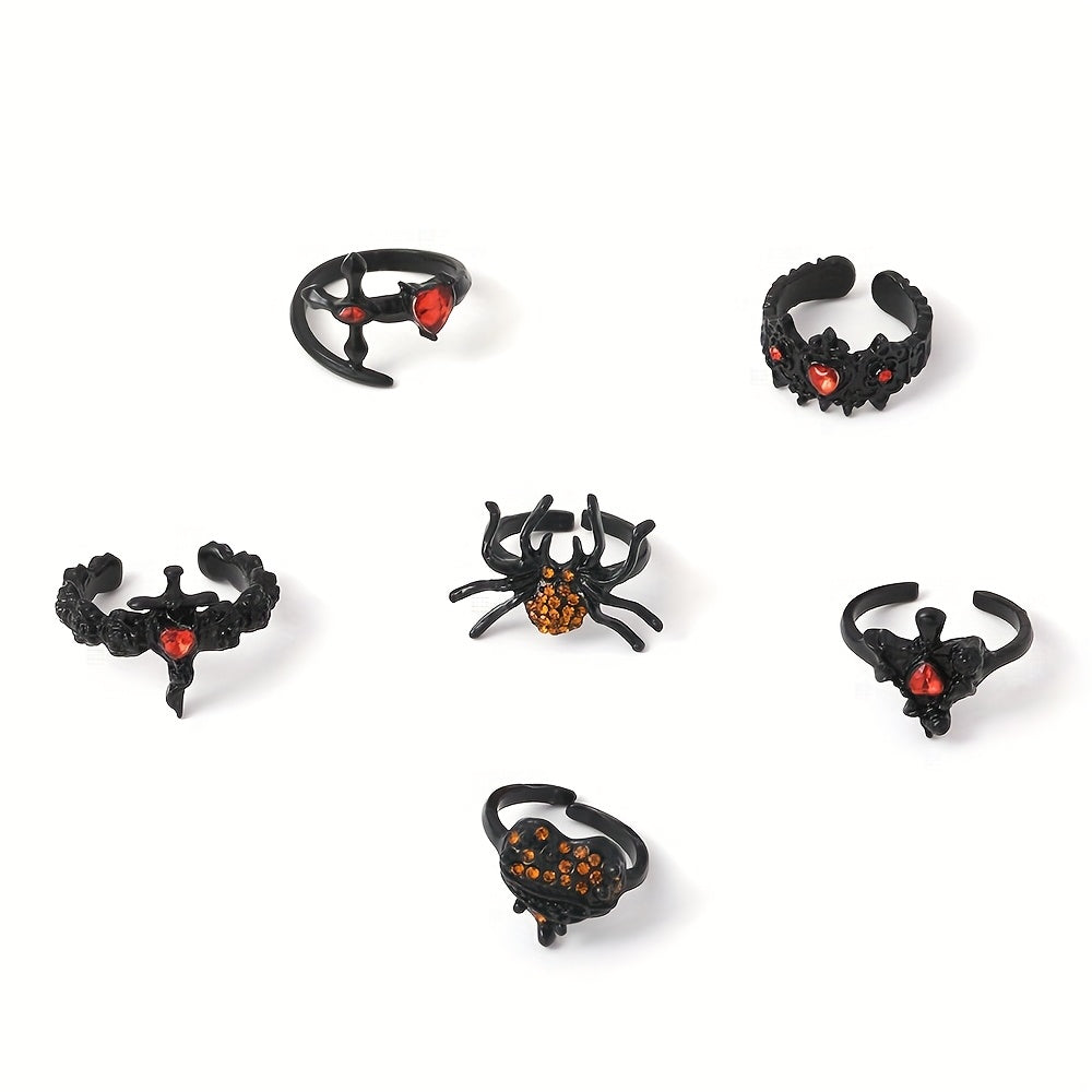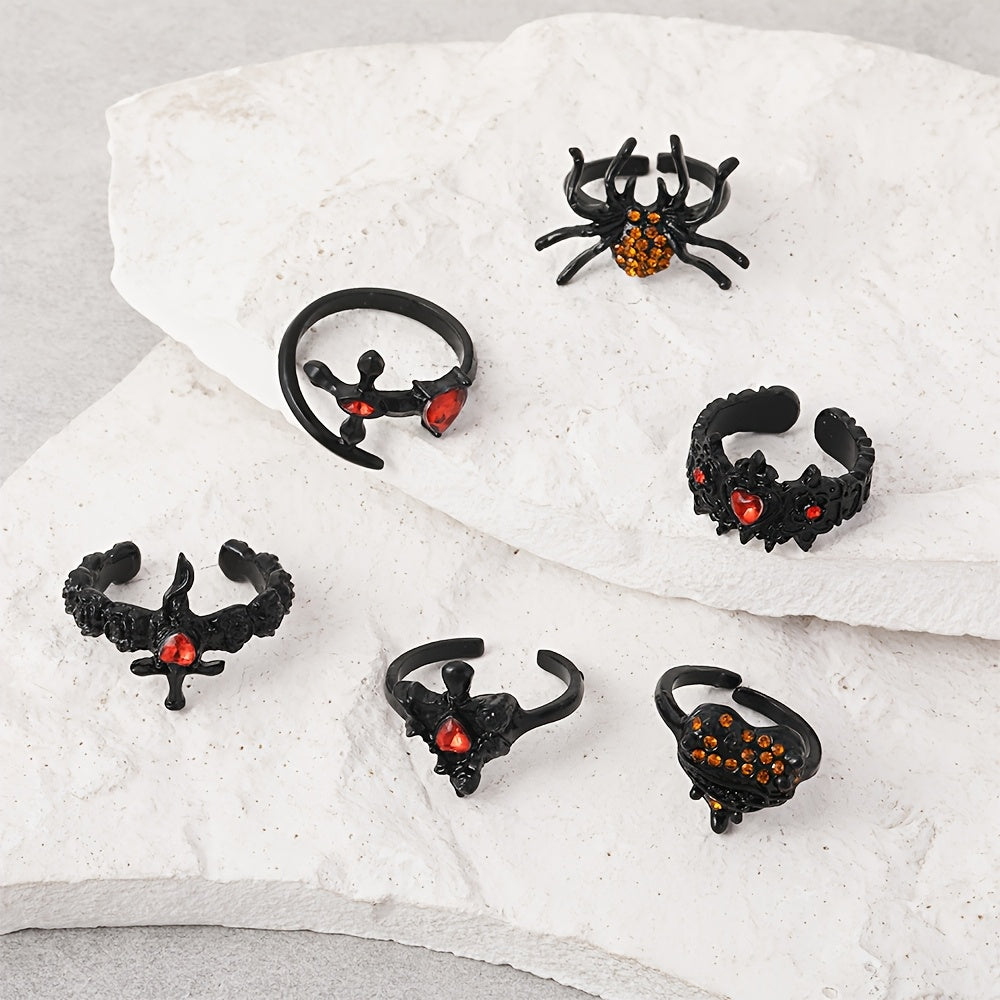 6 ta Gotik Qora Gul Xochi Moslashuvchan Halqalar to'plami, Qizil Xoch dizayni va porloq rhinestone'lar bilan, Ayollar uchun zamonaviy qotishma halqalar - Har kuni yoki maxsus tadbirlar uchun ideal