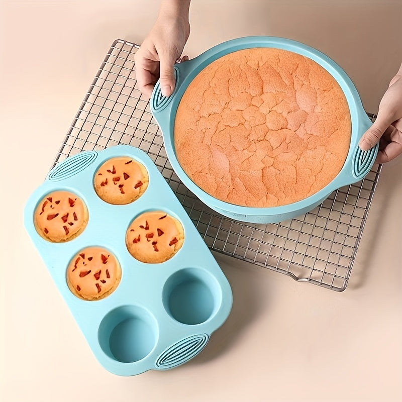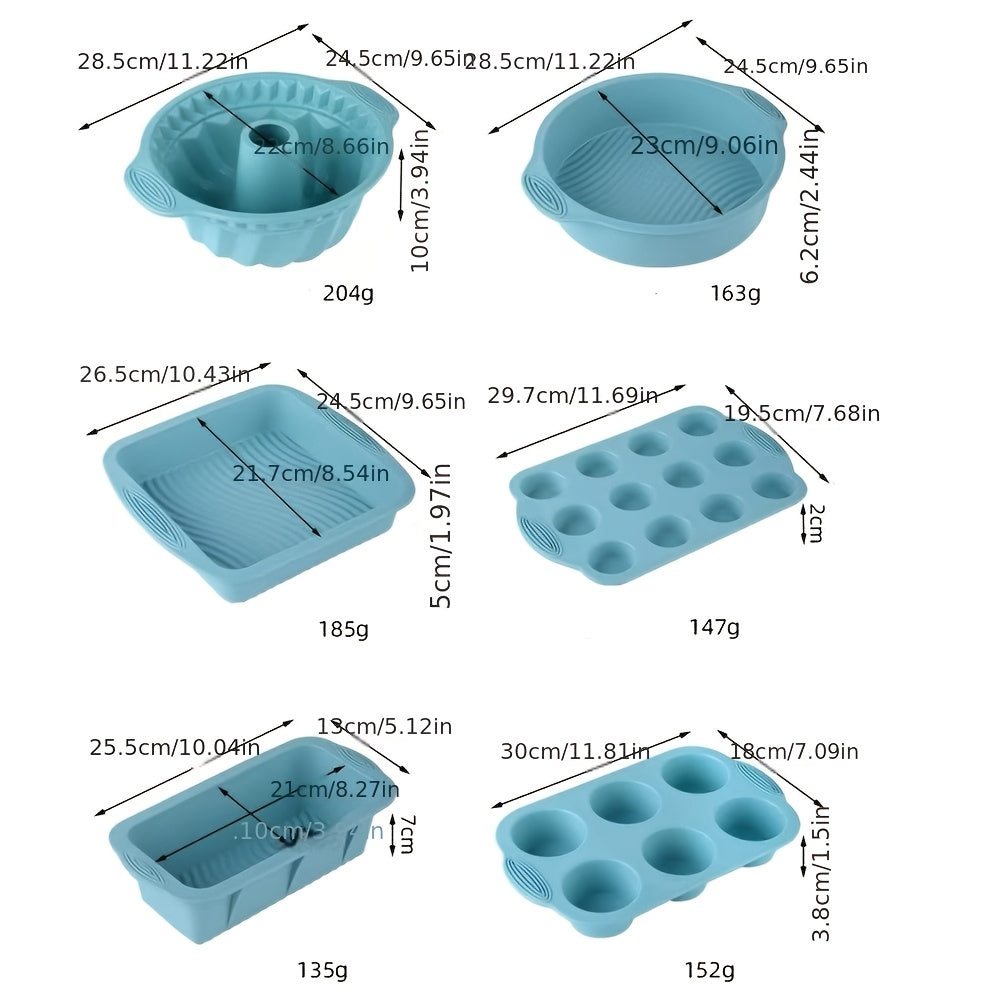 6 ta silikon oshxona pishirish uchun to'plam, unga yopishmaydigan pishirish panasi, tort qolip, donat qolip, muffin qolip va tort qolipi kiradi.