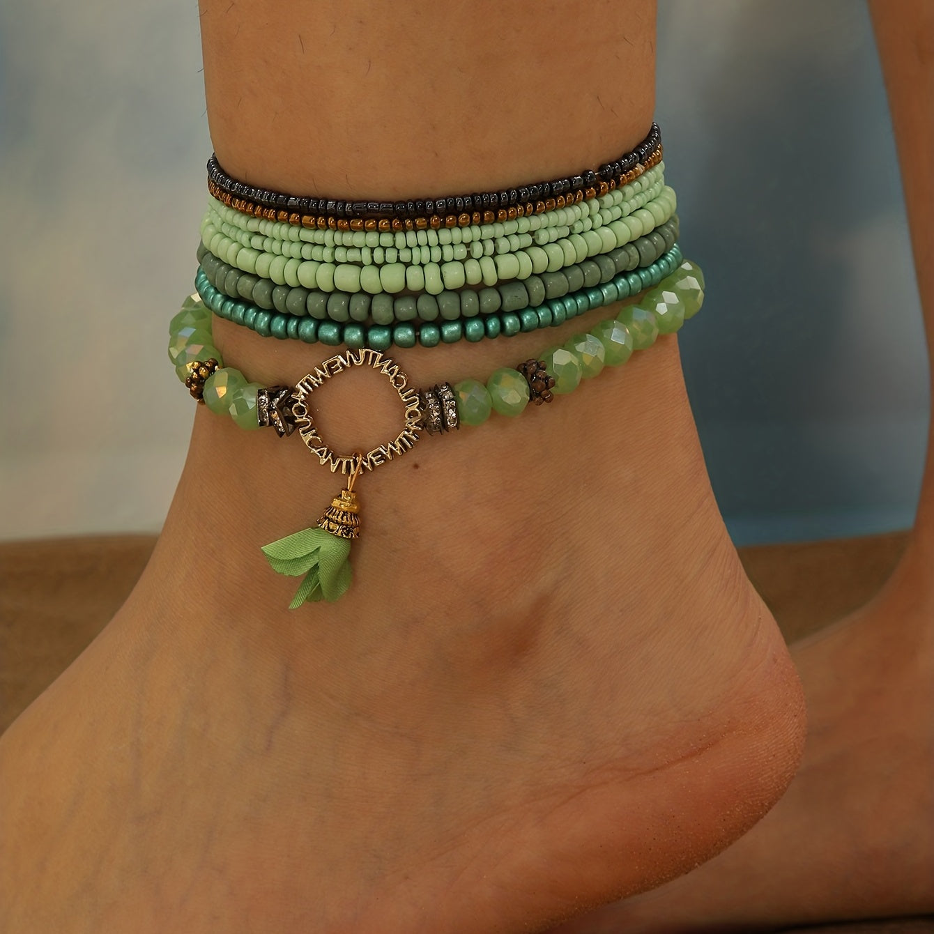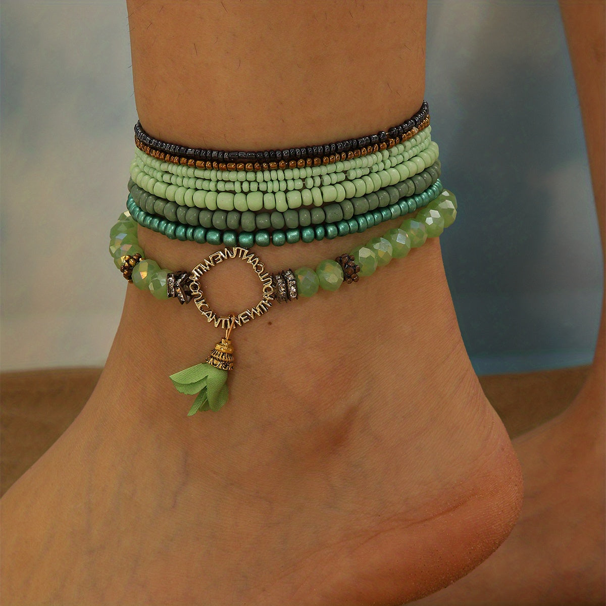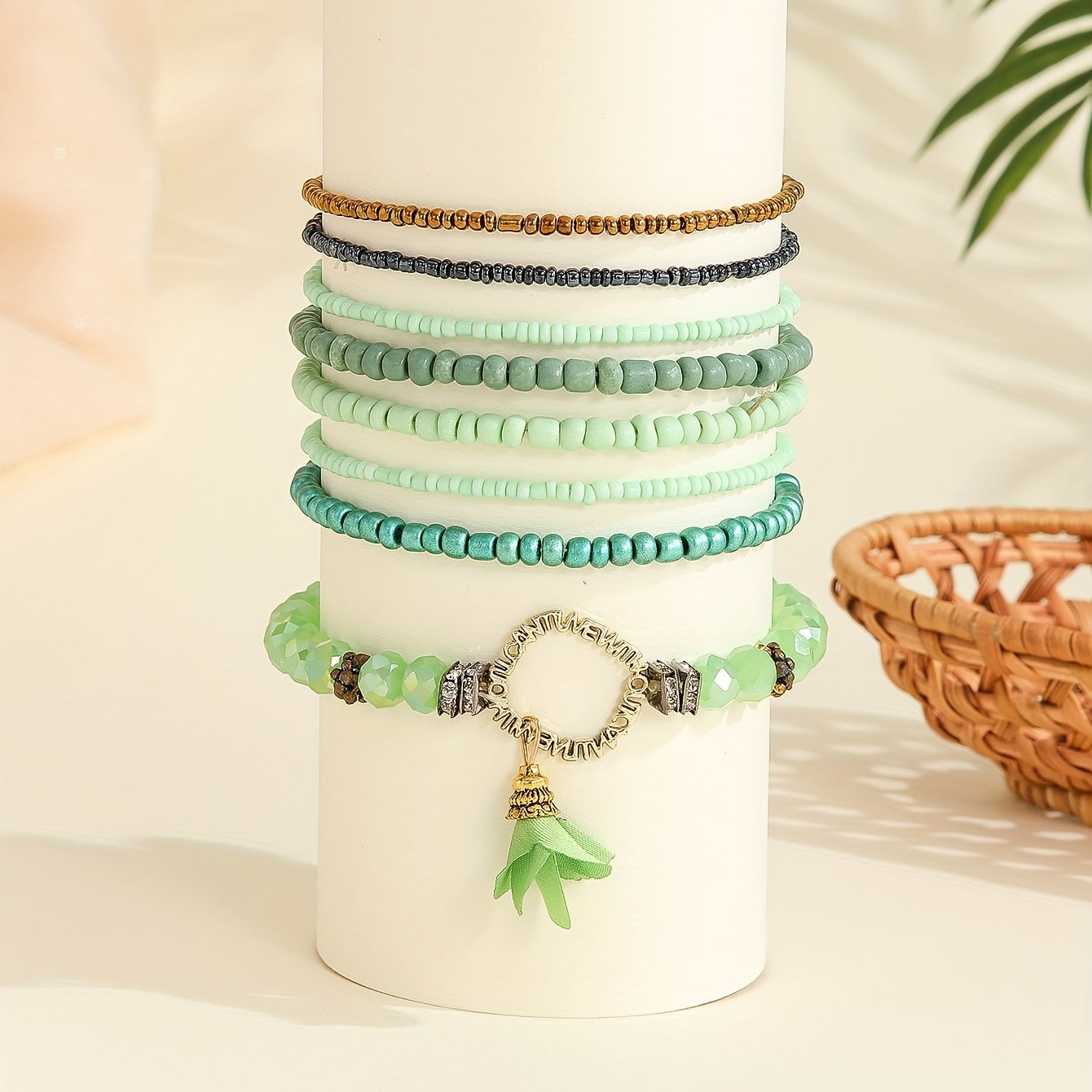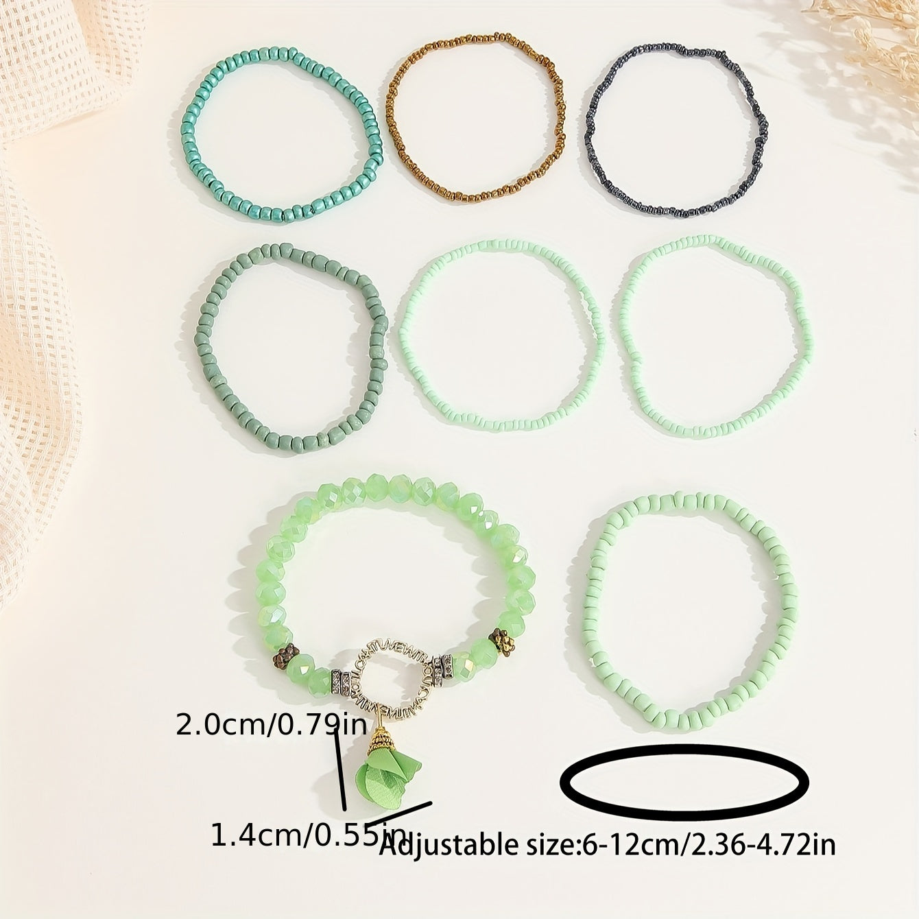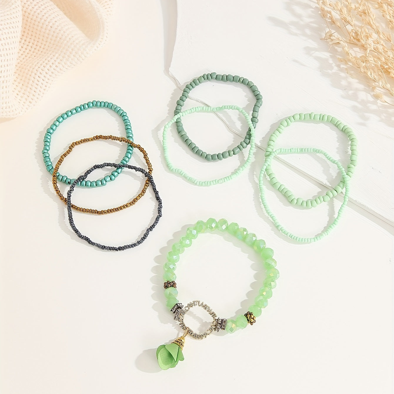 8 ta yashil guruch marjonli ayollar uchun marjonlar to'plami, har kuni kiyish uchun mukammal va bilak marjonlari sifatida birga kiyilishi mumkin.