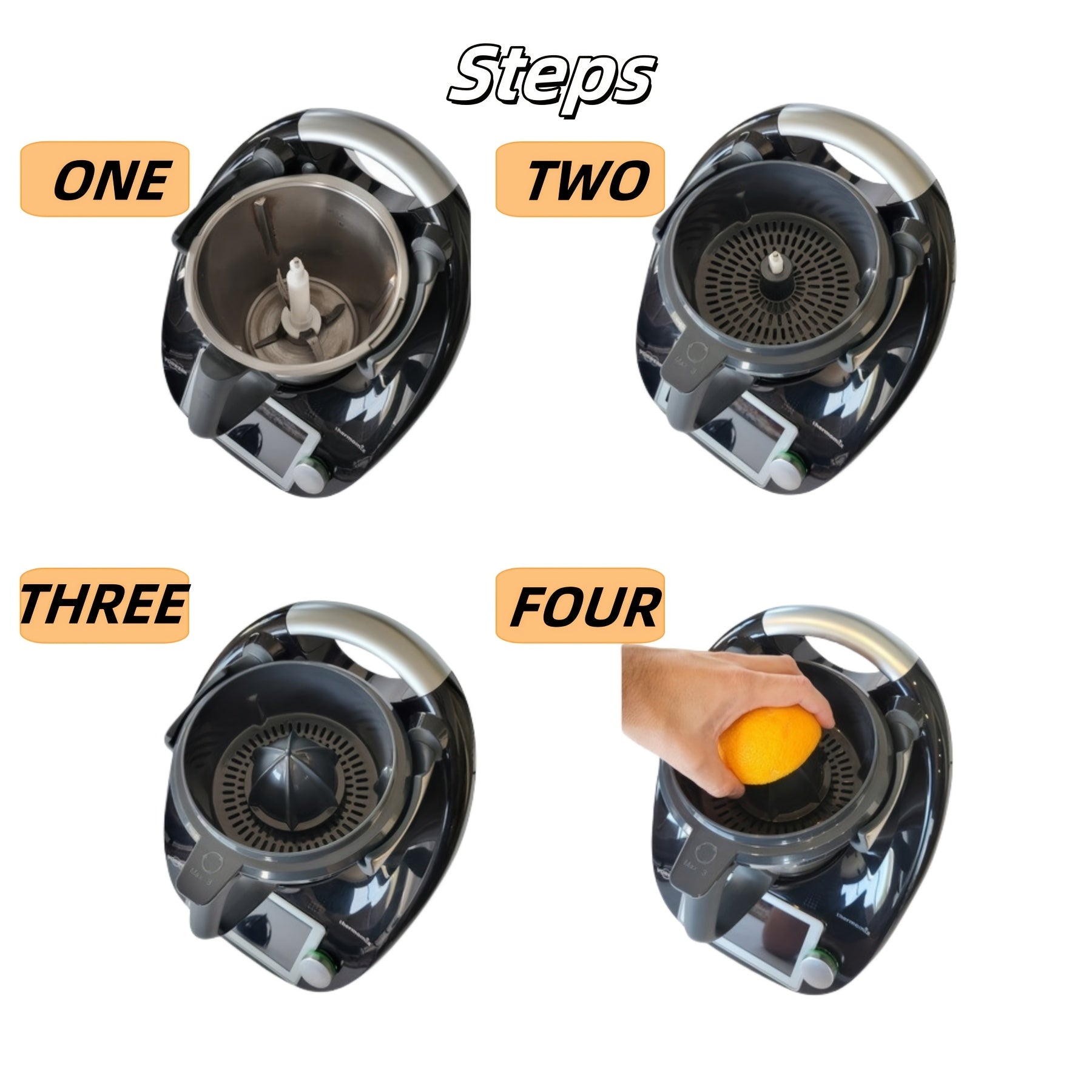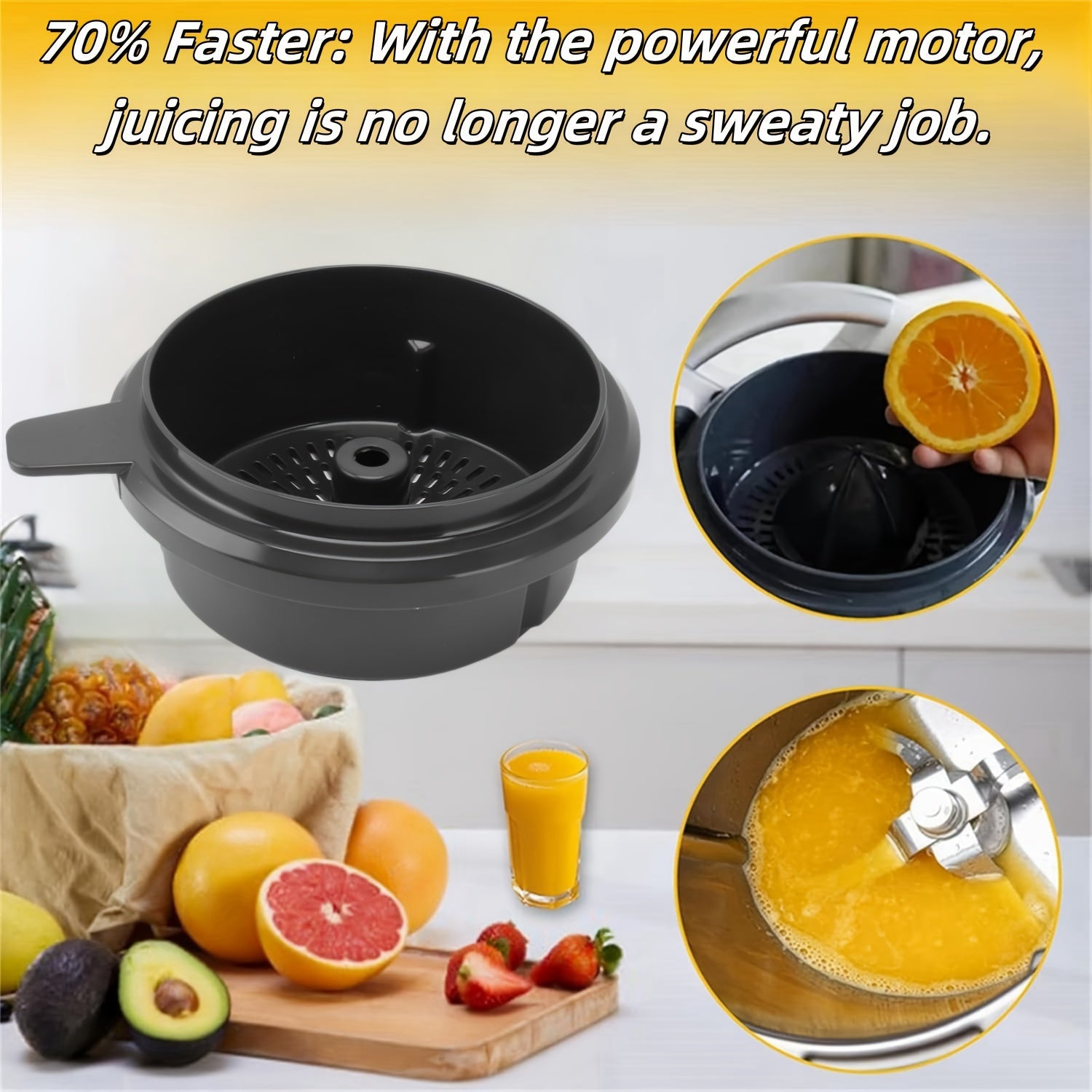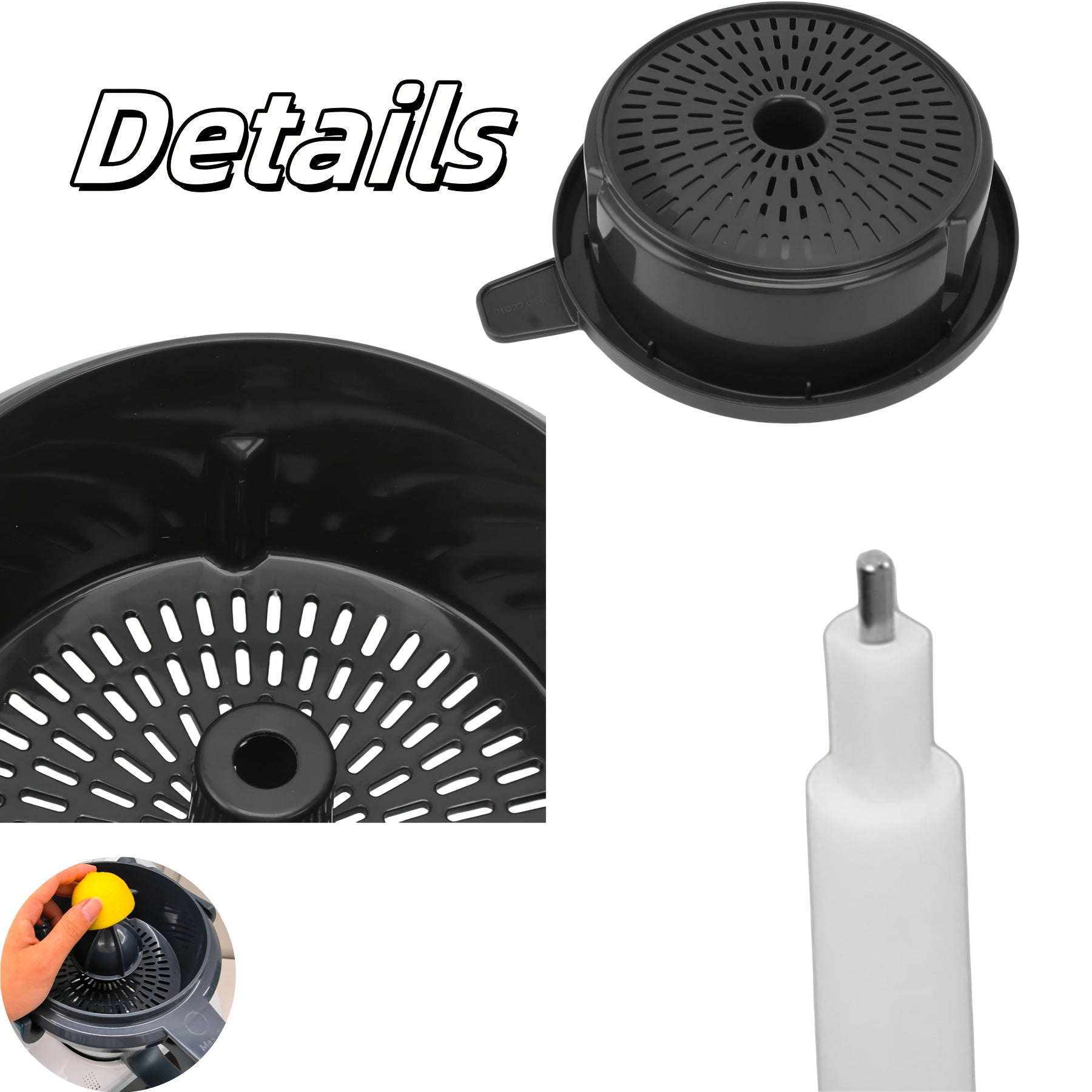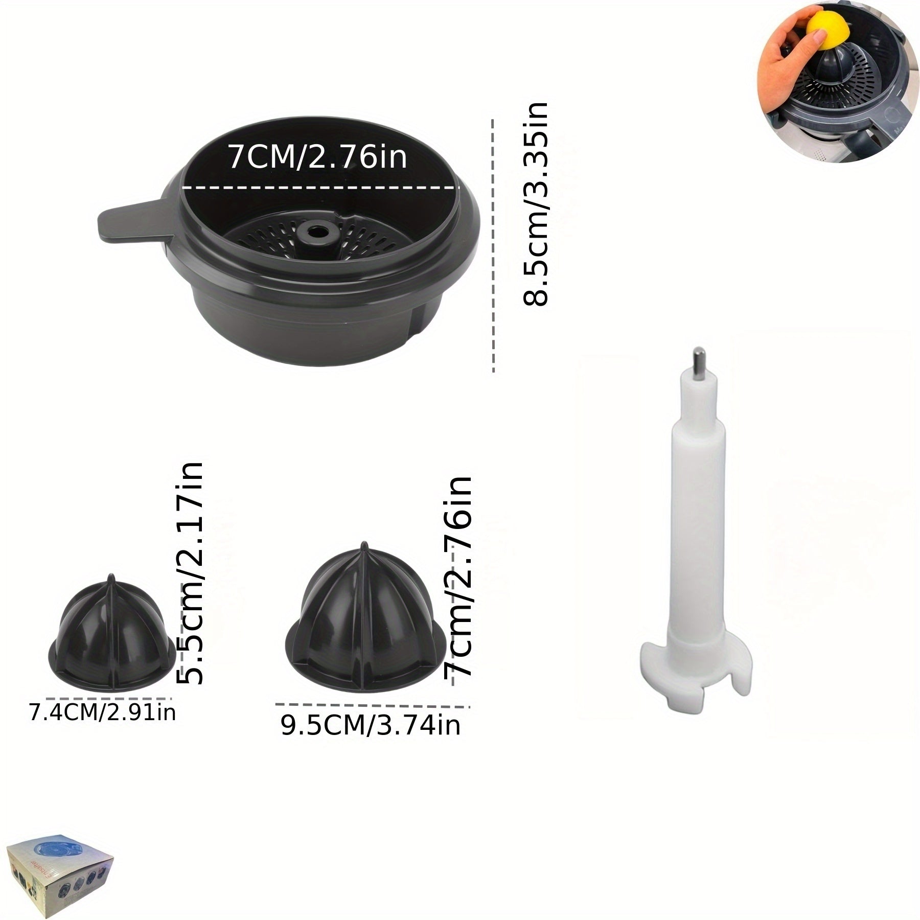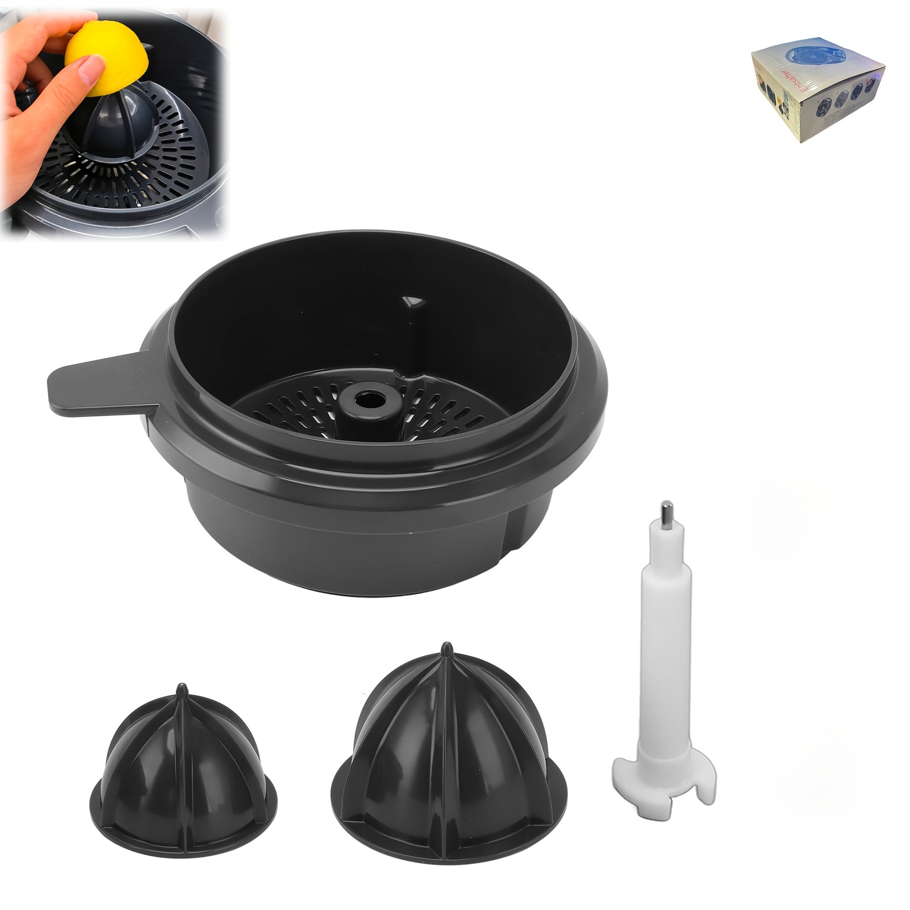 Plastikdan yasalgan, sitrus sharbatini xavfsiz chiqarish uchun ajratiladigan konus va tutqichga ega qo'l bilan limon siqish uchun aksessuarlar to'plami. Standart siqish mashinalari bilan mos keladi.