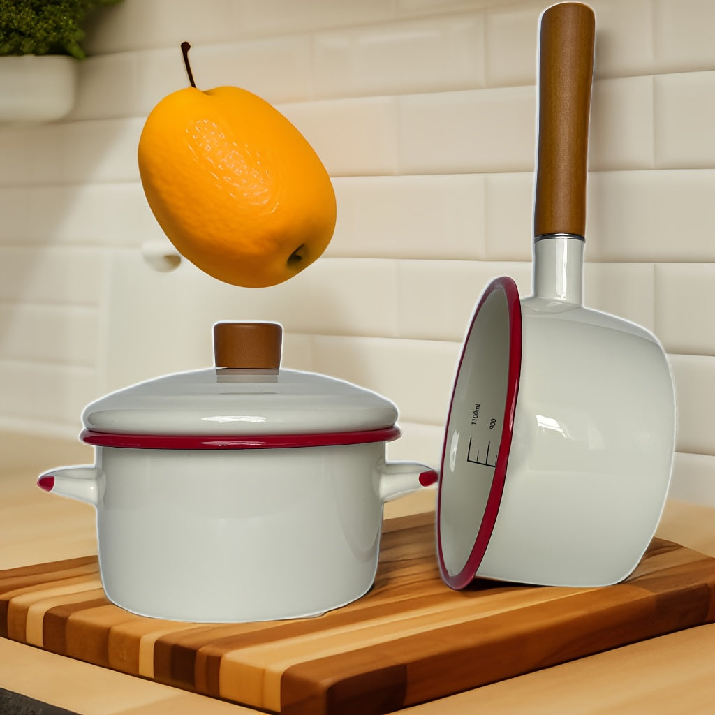 Qalin qoplamali, bir xil rangdagi emal sho'rva qozonlari to'plami, gaz pechida va induksion pechda ishlatish uchun mos. Ushbu oshxona va ovqatlanish uchun zarur bo'lgan buyumlar sog'liq uchun xavfsiz qoplamaga ega va 1.5L va 2.5L o'lchamlarida mavjud.