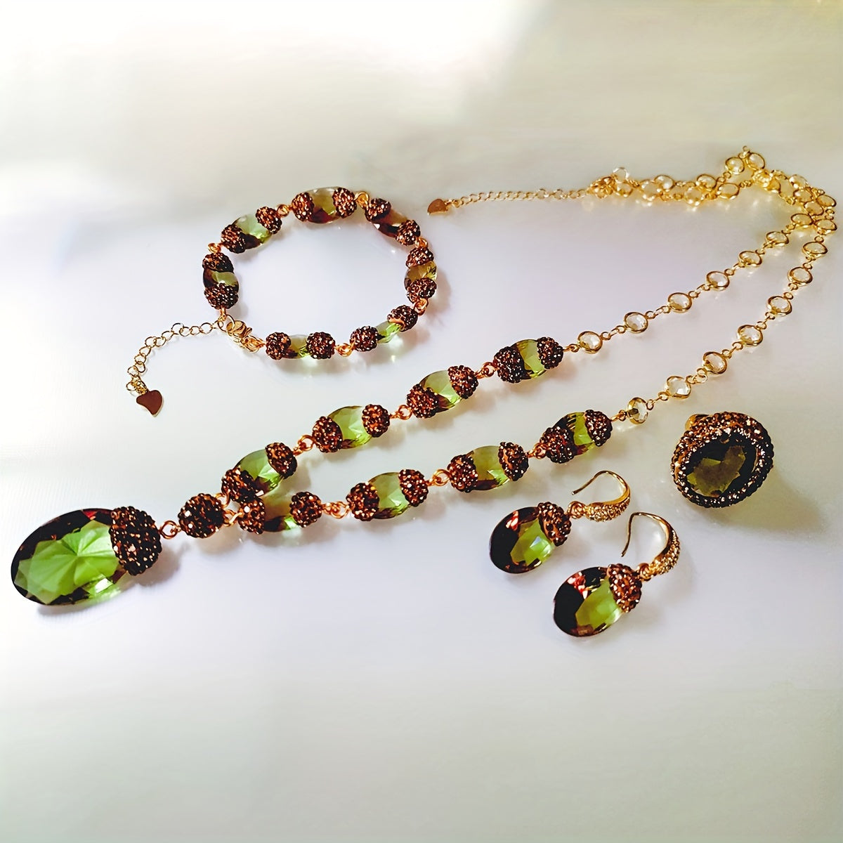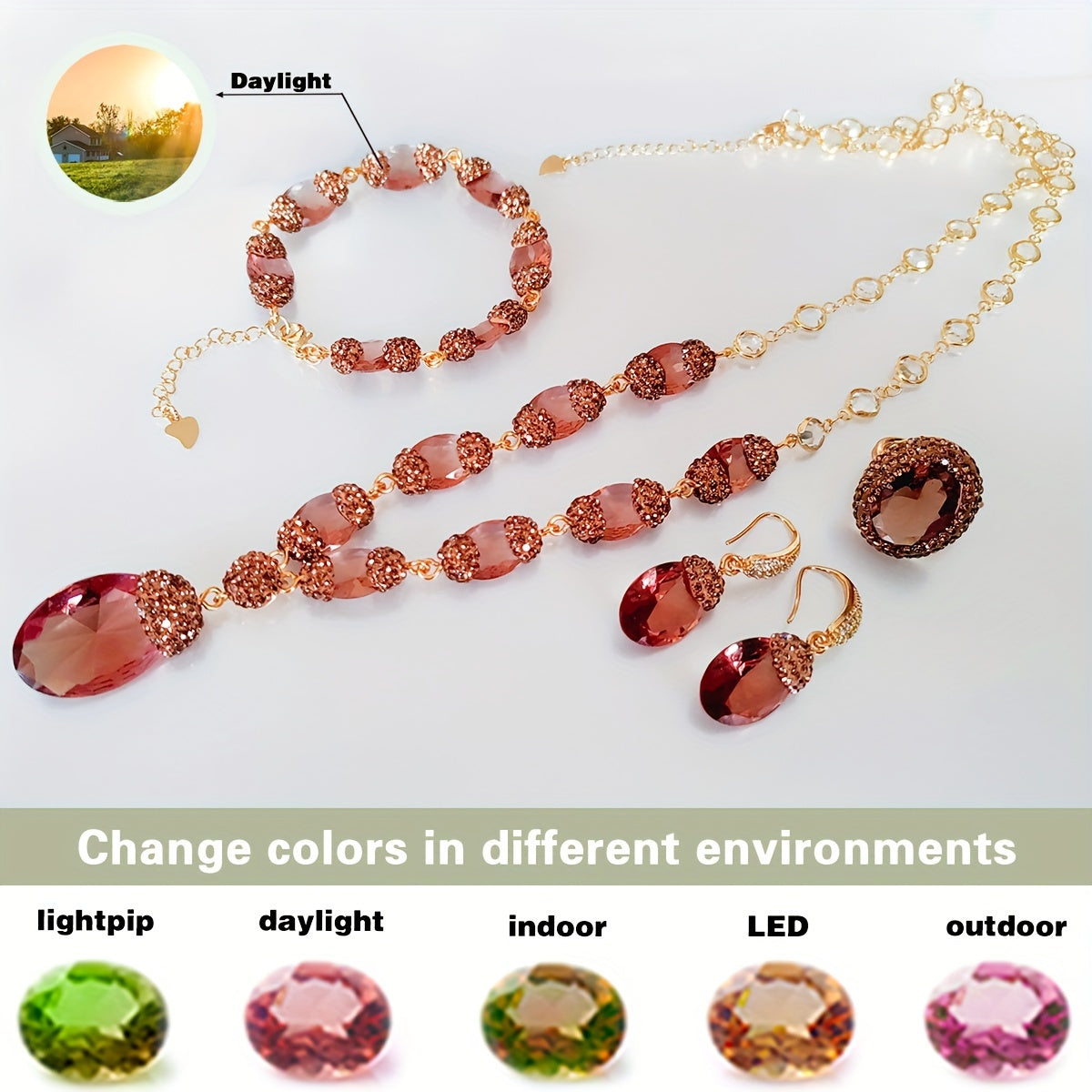 To'rt go'zal mis zargarlik buyumlari to'plami, rang o'zgaruvchi sultanite diaspore, sun'iy qimmatbaho toshlar - zanjir, bilaguzuk, sirg'a va uzukni o'z ichiga oladi - ayollar uchun har kuni va maxsus tadbirlarda kiyish uchun mukammal.