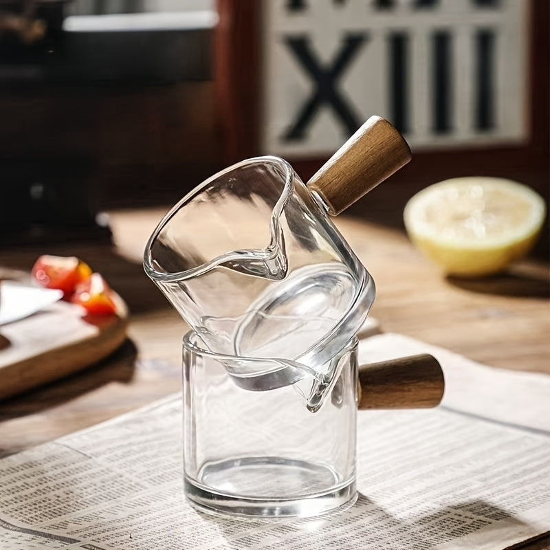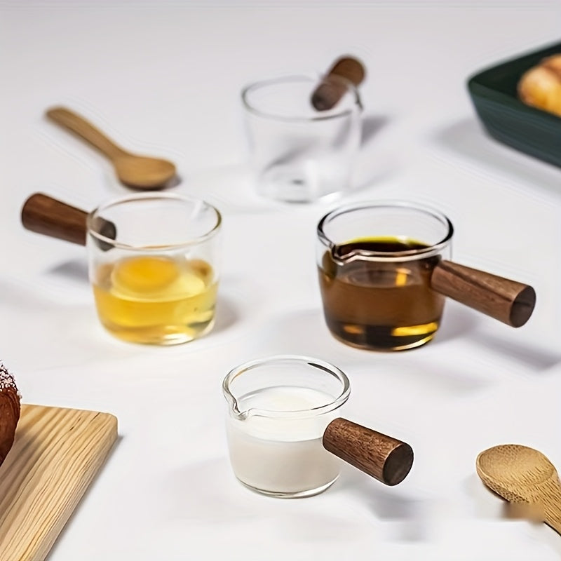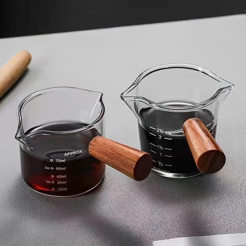Shisha va yog'ochdan yasalgan to'rt mini sut stakanlari, har biri 3.38oz sig'imga ega. Uyda yoki ofisda qahva kremi o'lchash uchun ideal, bu stakanlar qulay foydalanish uchun tutqichlar bilan birga keladi.