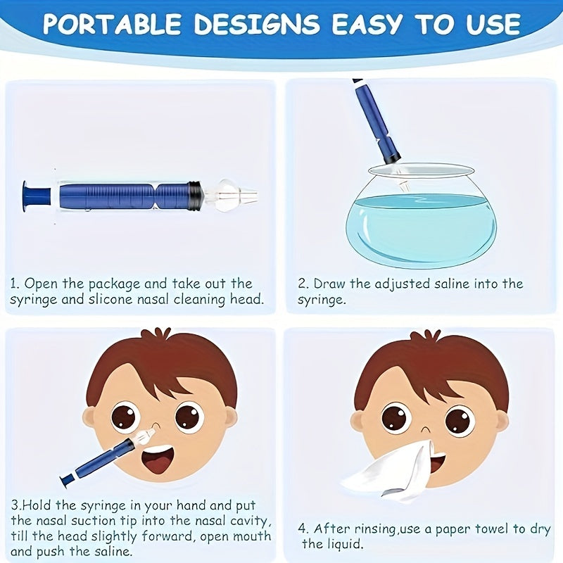 0-3 yoshdagi chaqaloqlar uchun to'rt dona burun aspiratorlari, BPA dan ozod plastikdan tayyorlangan. Xavfsiz so'rish shpritslari ko'k, shaffof va pushti ranglarda - yumshoq burun tozalash uchun ideal.