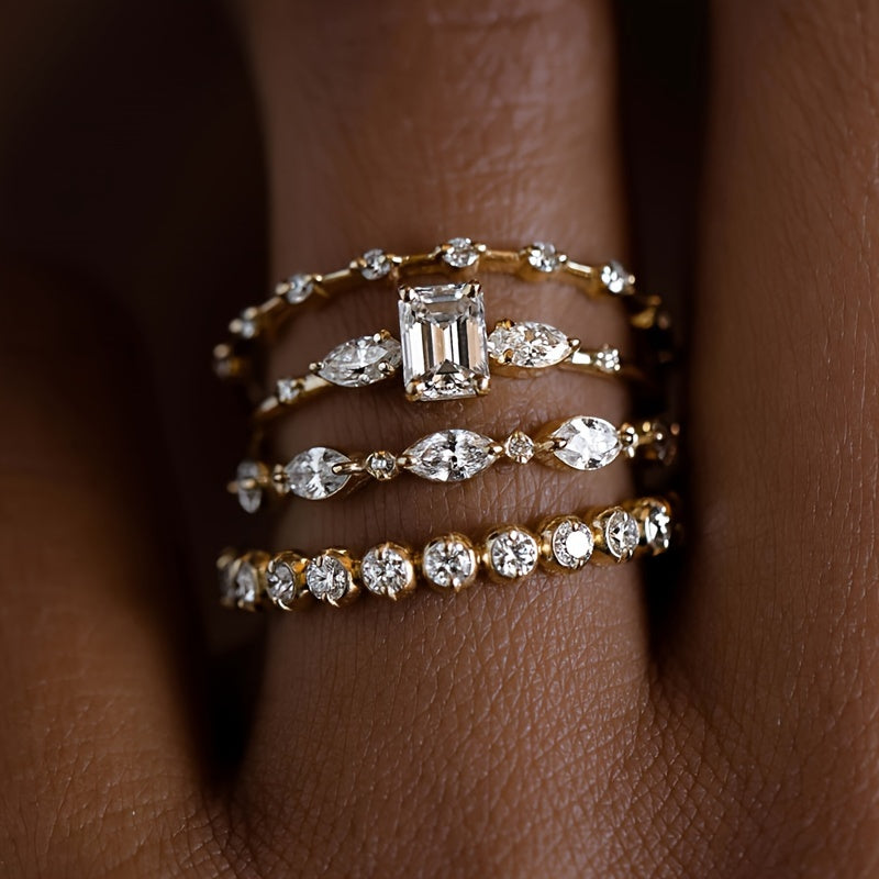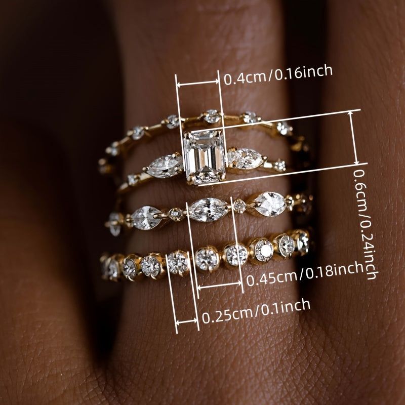 Ayollar uchun mo'ljallangan to'rt ta'sirli oltin kubik zirkoniy stacking uzuklar to'plami, nafis va hashamatli uslubni taklif etadi. Ular to'y, yubileylar va kundalik yoki bayram kiyimlari uchun mukammaldir.