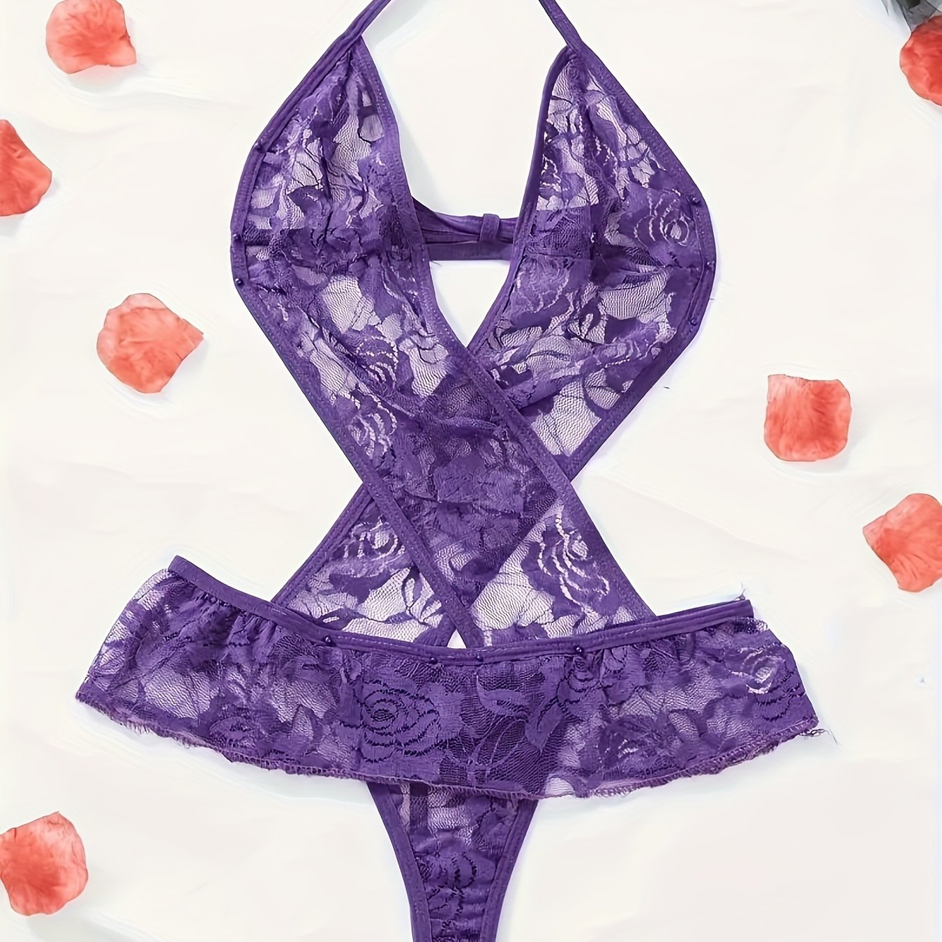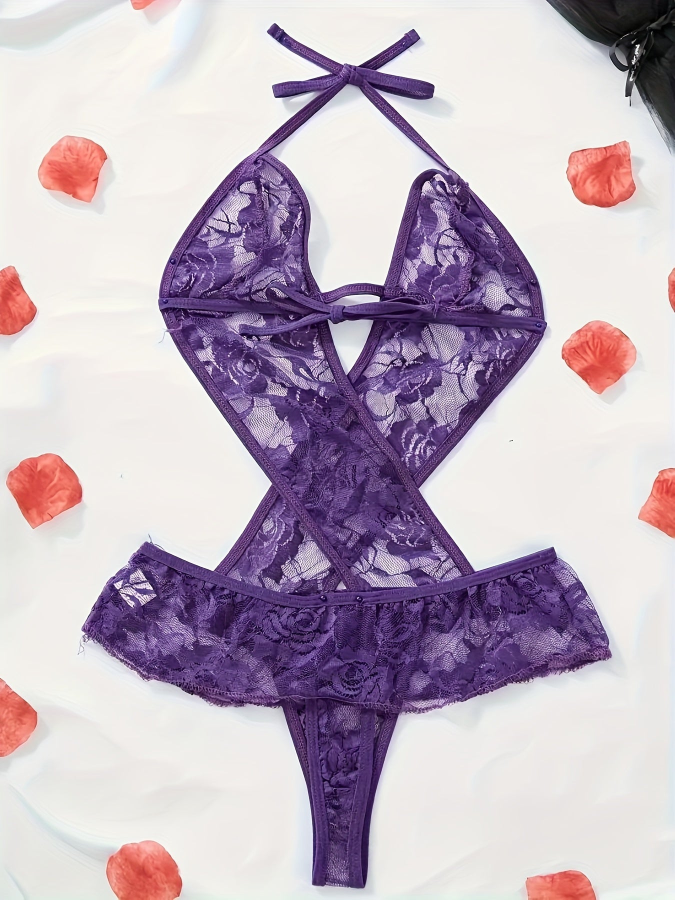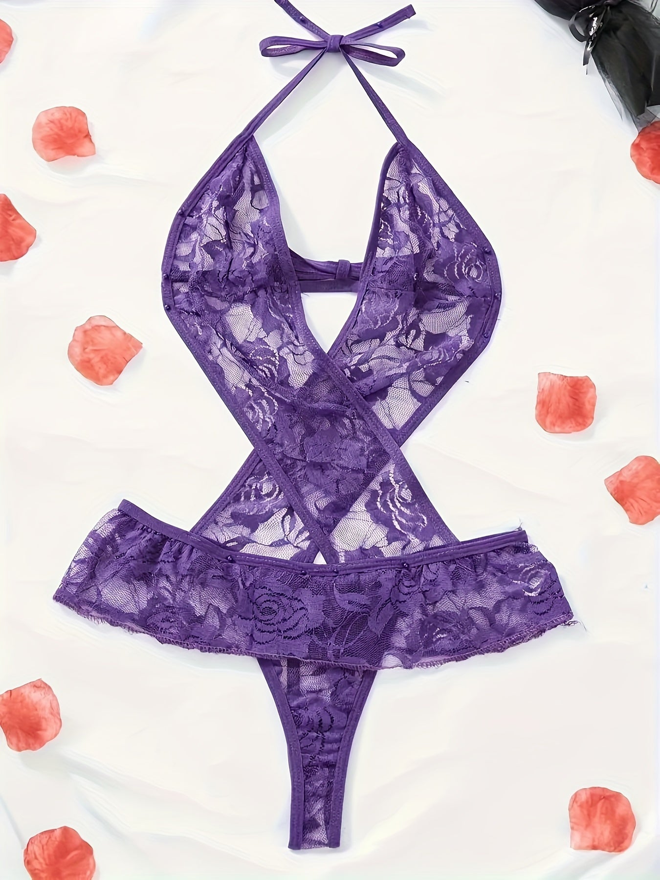 Juda chiroyli, ko'rinadigan dizayni va bo'yin tasmasi bilan sexy dantel bodysuit