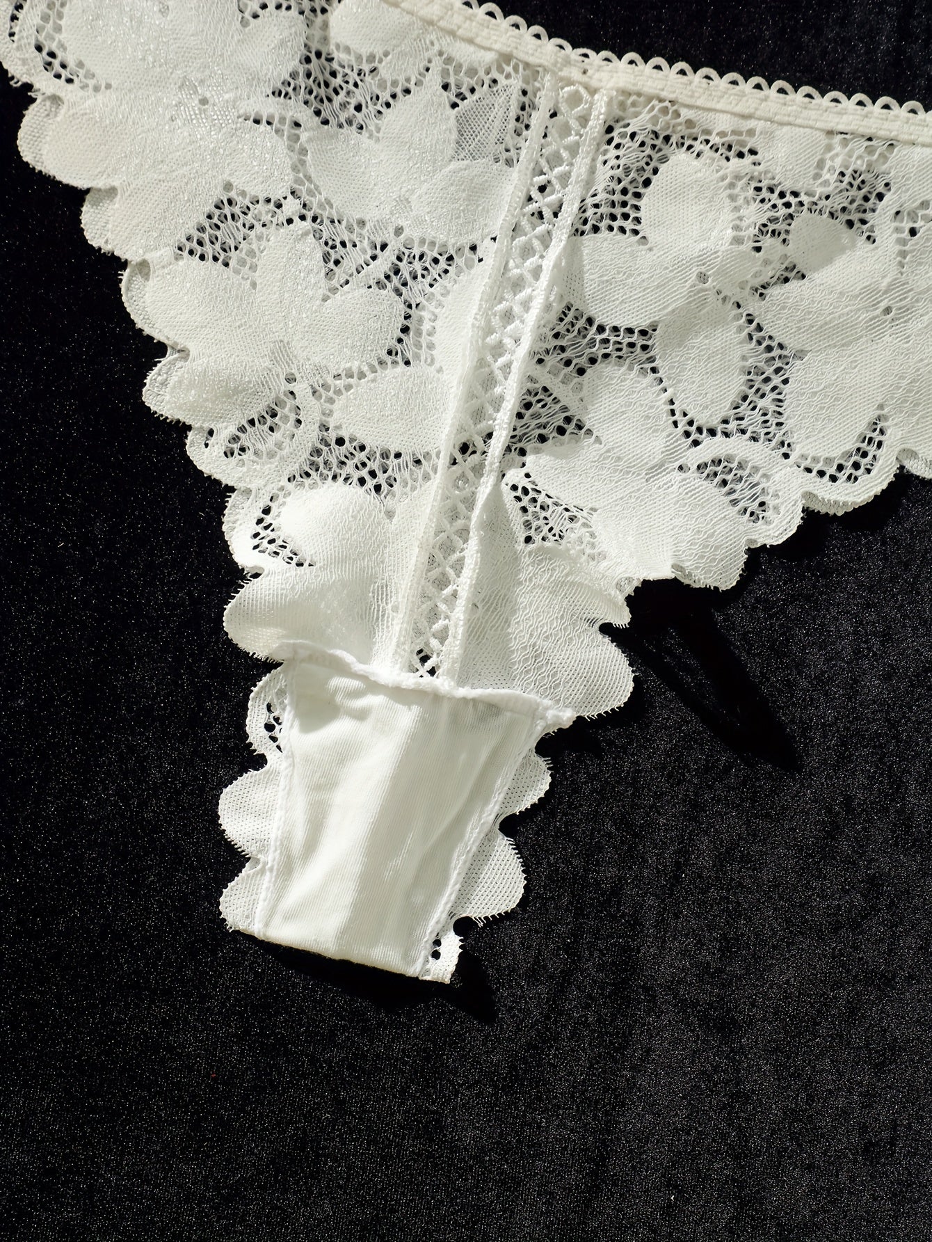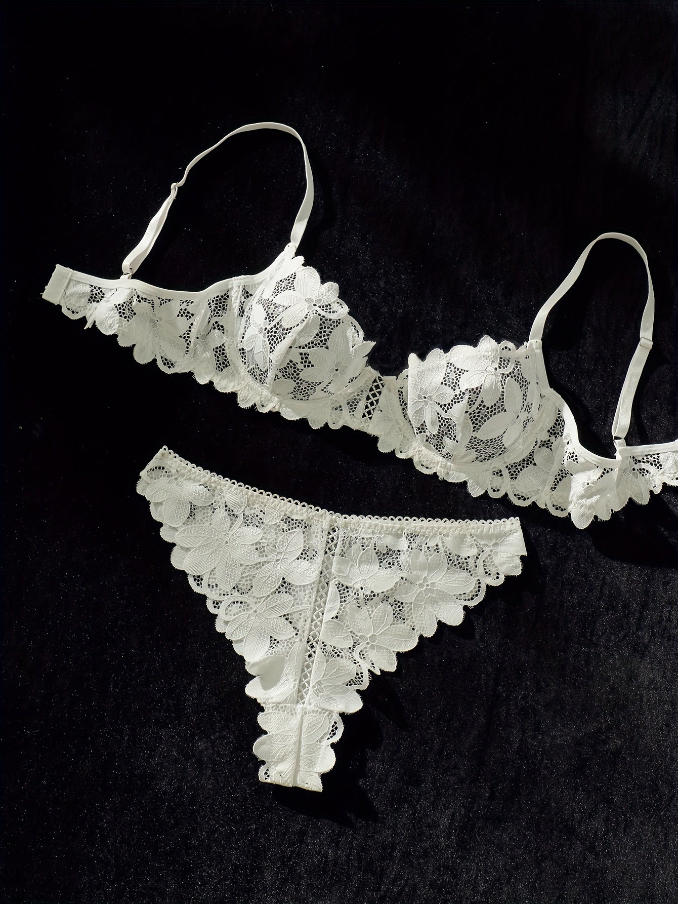 Gul naqshli, ipli yengli, mos keladigan brassier va ichki kiyimdan iborat sexy dantel ichki kiyim to'plami.