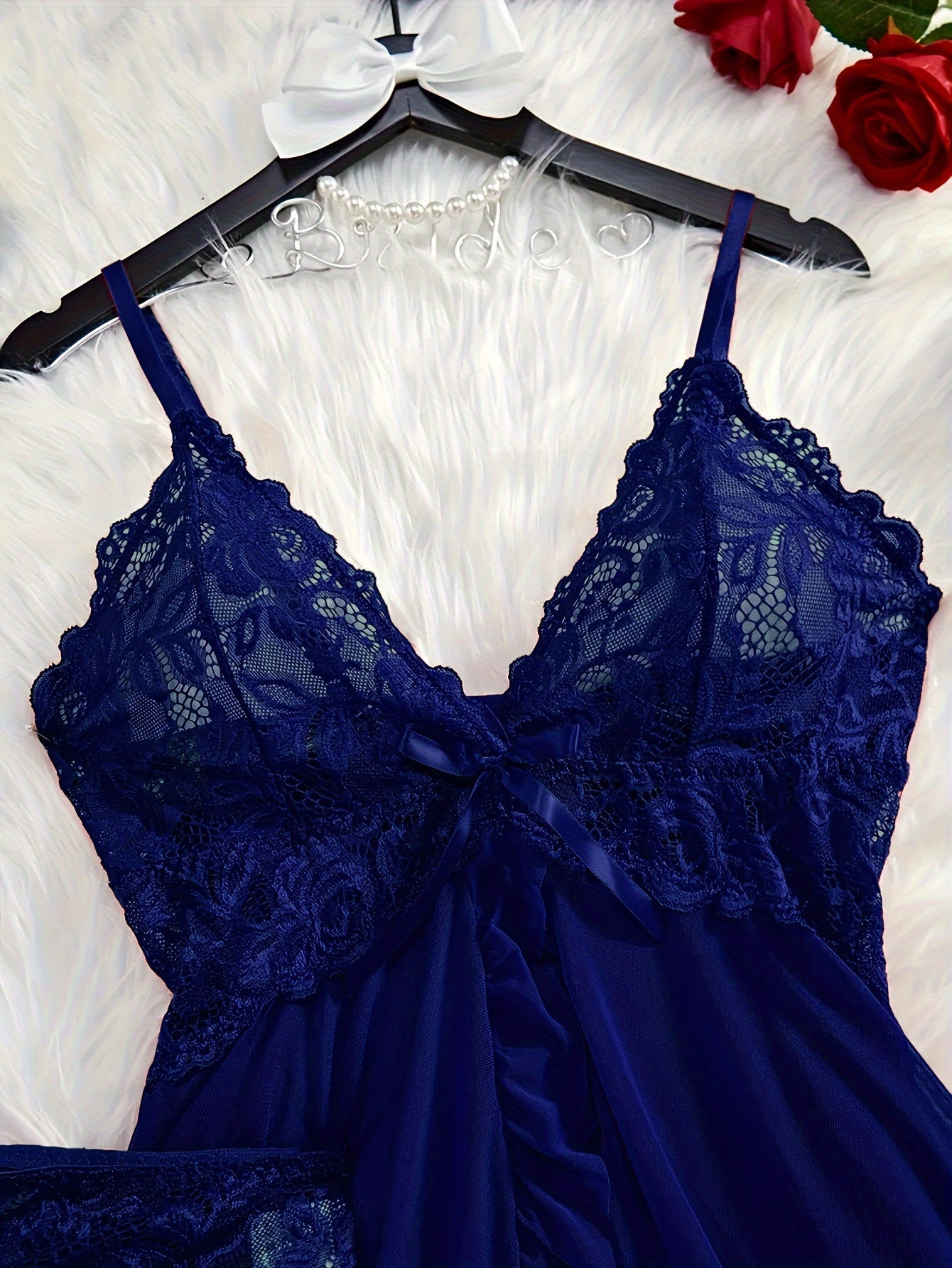 Gul to'quv tafsilotlari, chuqur V bog'ich, qirqilgan chetli qisqa yubka va ichki kiyim bilan sexy ichki kiyim to'plami.