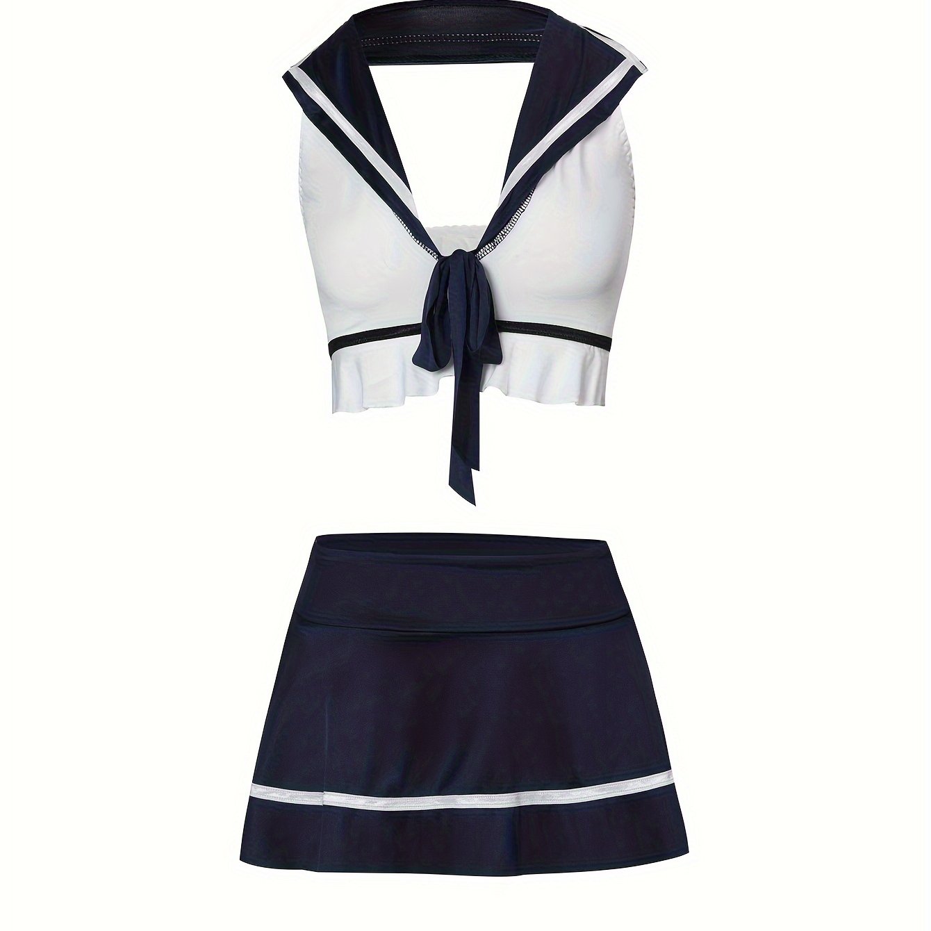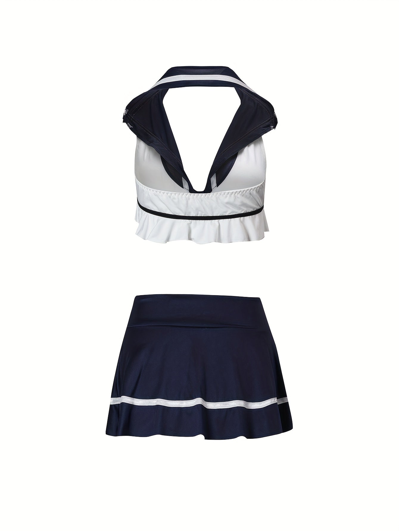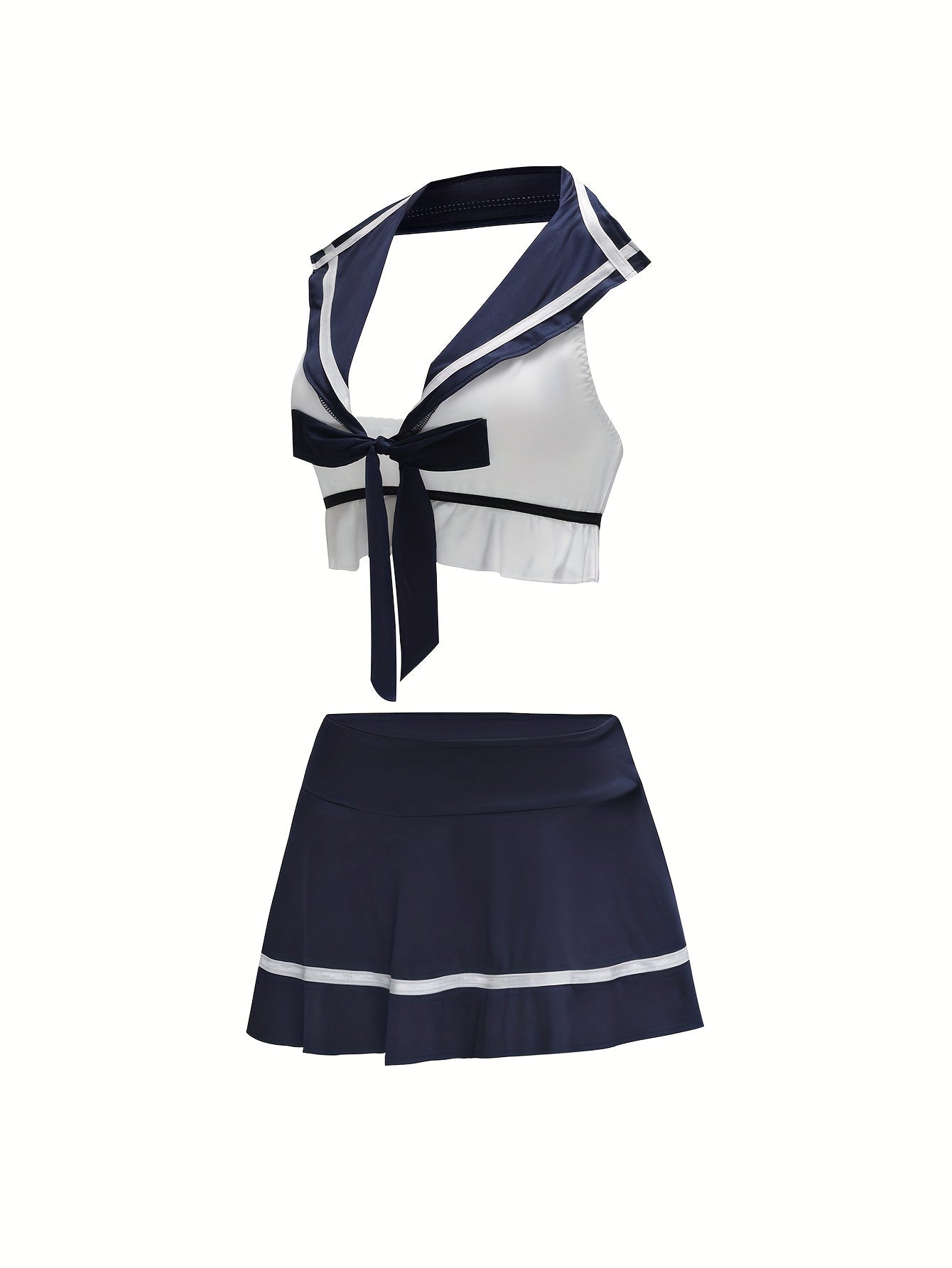 Jozibali ichki kiyim to'plami, yovvoyi rol o'ynash kostyumi, bo'yinbog'li ipli brassier va mini yubka.