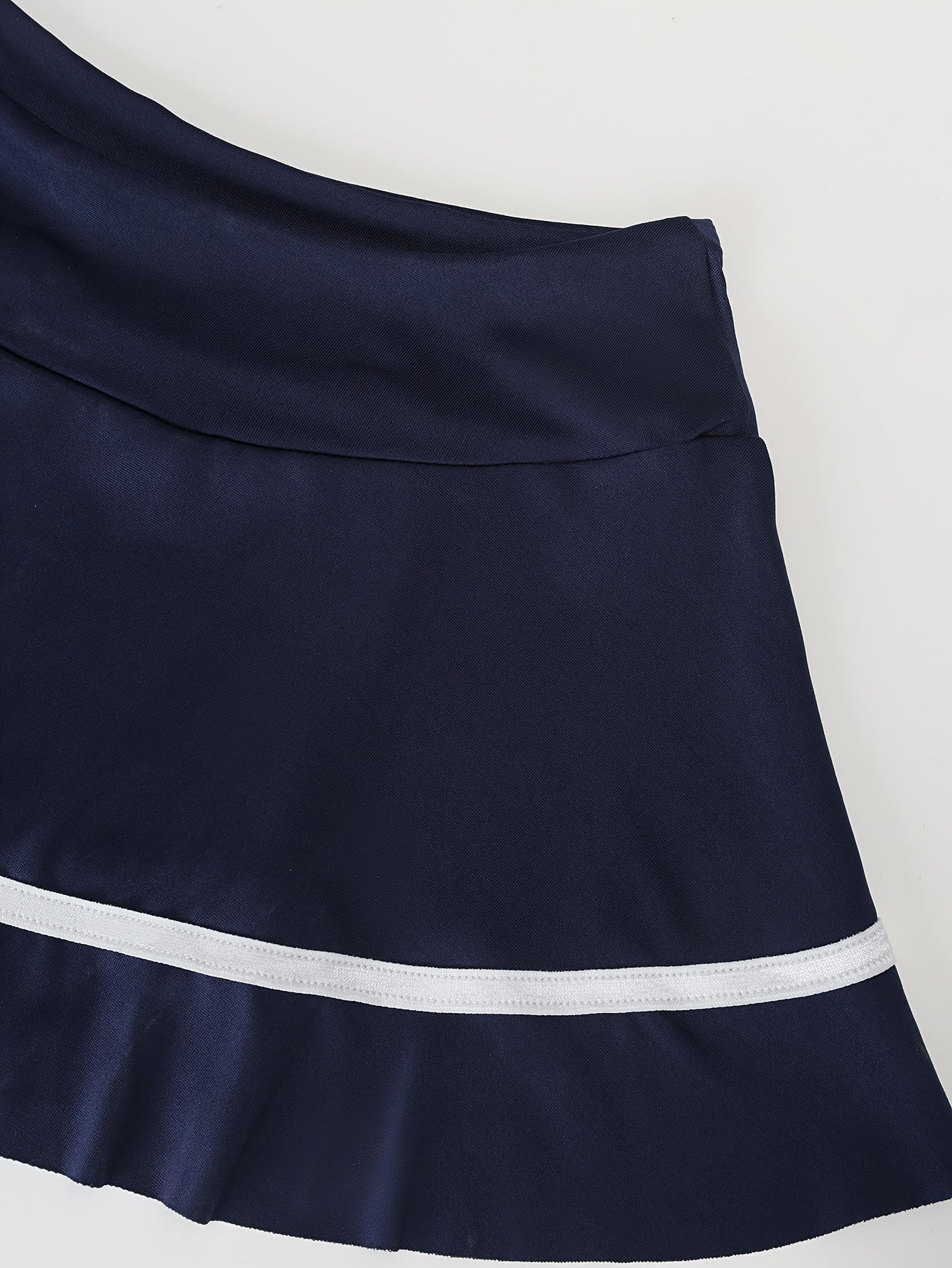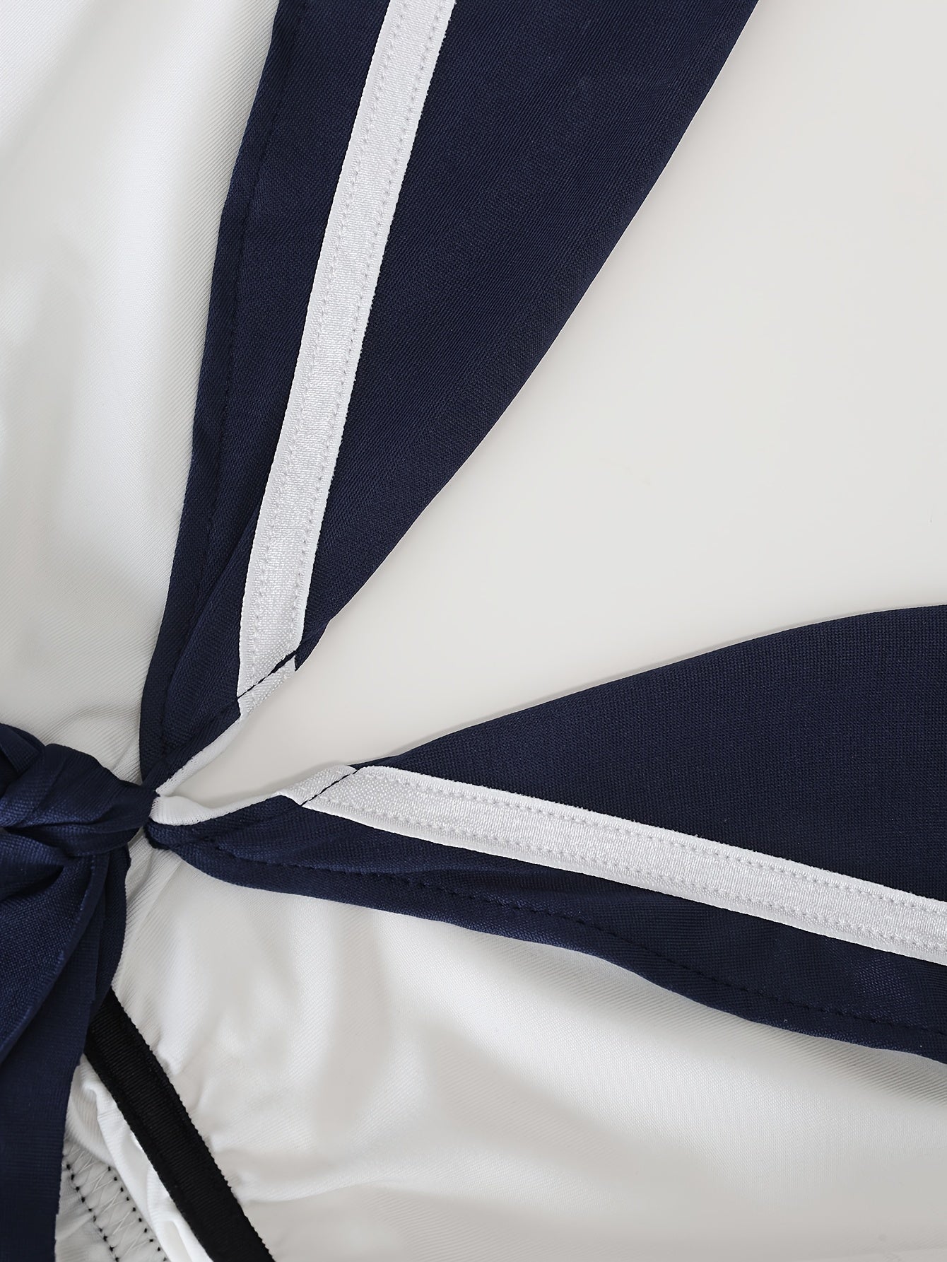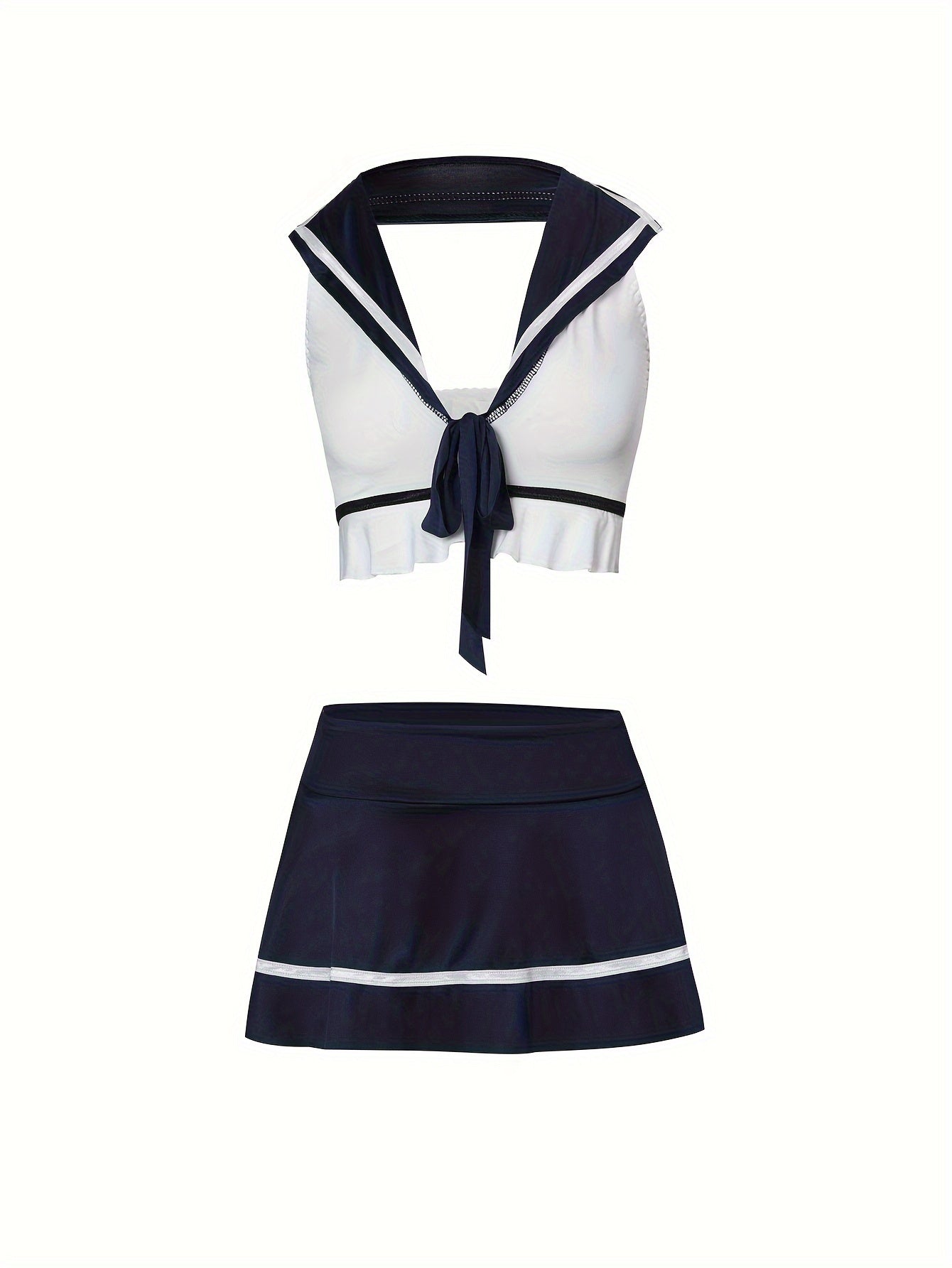 Jozibali ichki kiyim to'plami, yovvoyi rol o'ynash kostyumi, bo'yinbog'li ipli brassier va mini yubka.