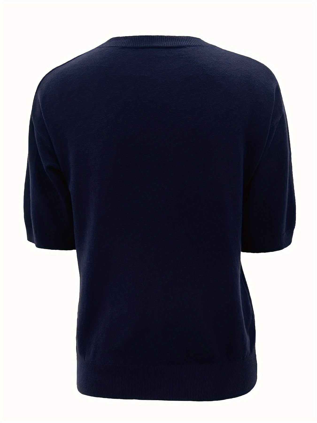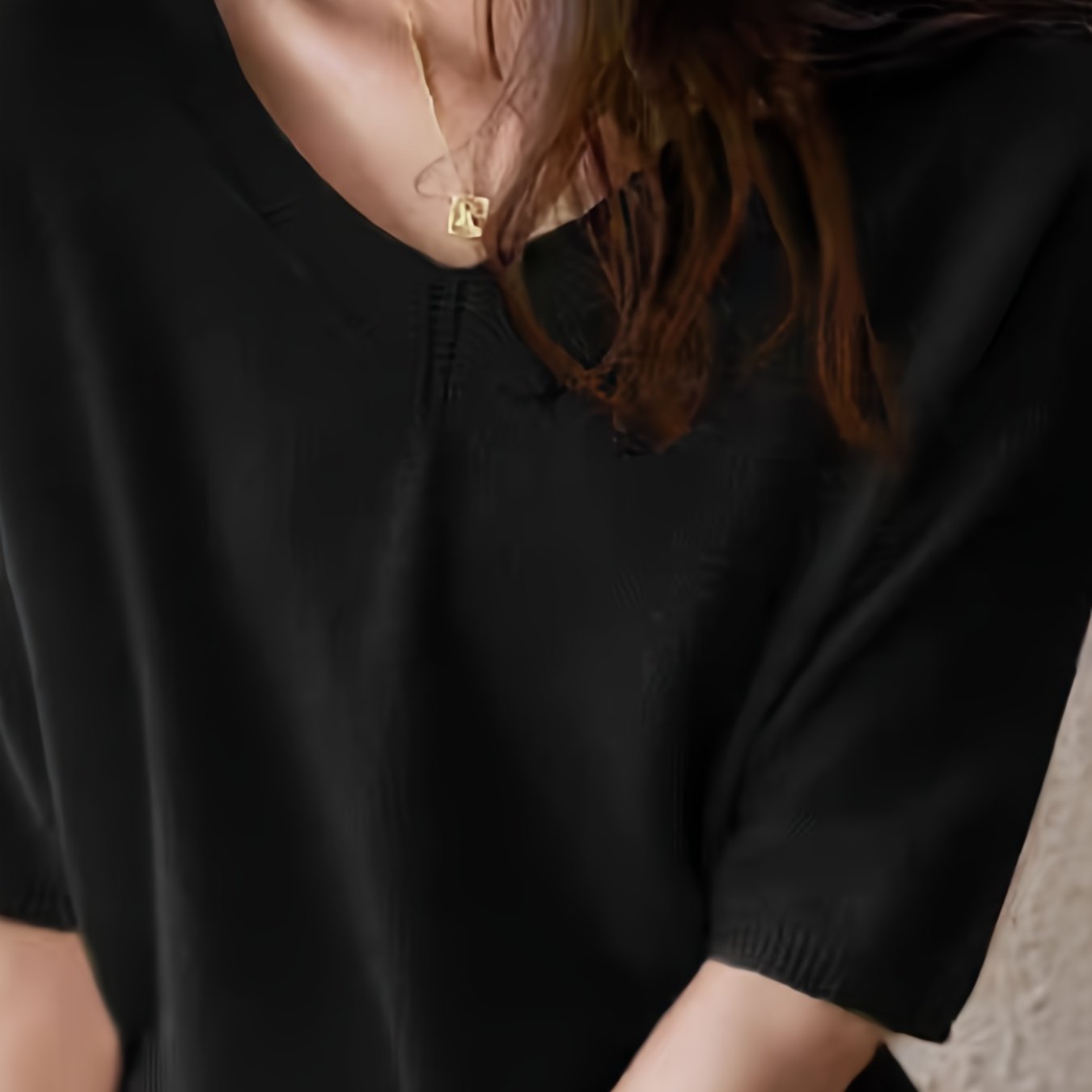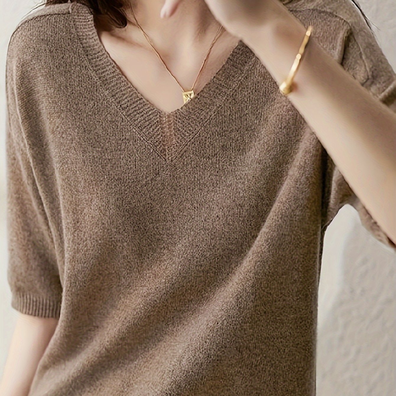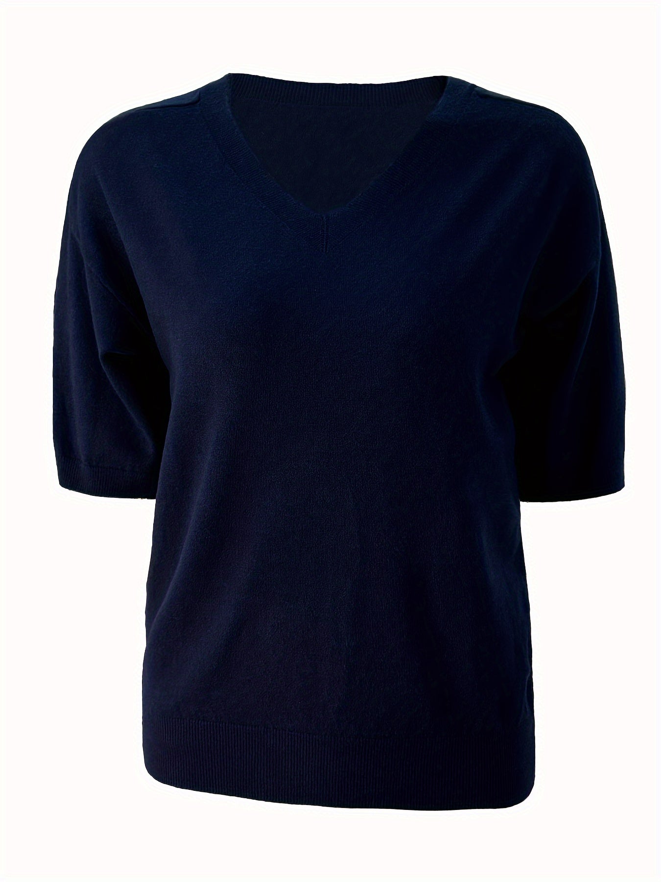 Yoz va bahor uchun bir rangli qisqa qo'lqonli V-yuqori sviter. Ayollar uchun tasodifiy kiyimlar.