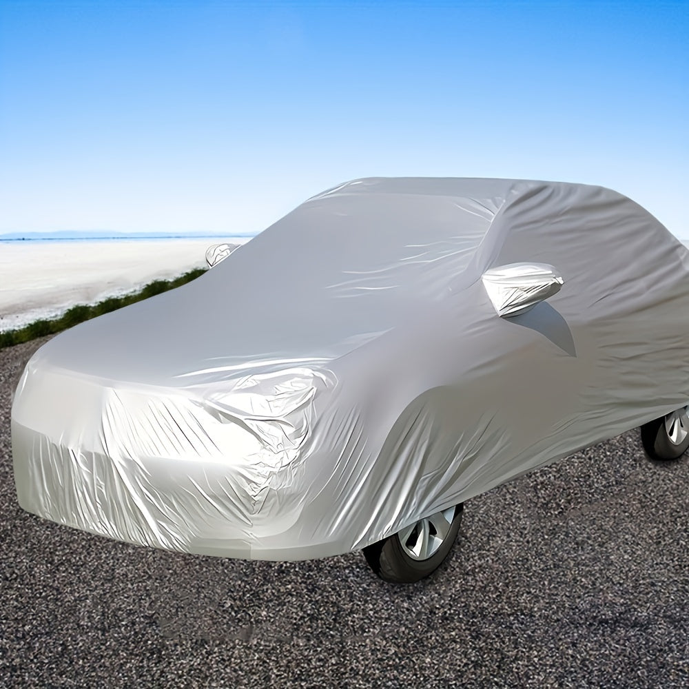 Kumush avtomobil qoplamasi UV himoyasi, issiqlik izolyatsiyasi va suv o'tkazmaydigan xususiyatlarga ega bo'lib, to'liq quyoshdan himoya va chang qoplamasi uchun metall tuzilishga ega.