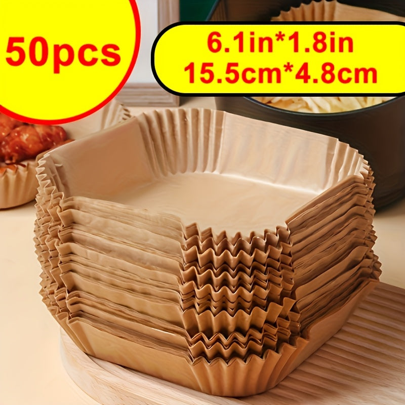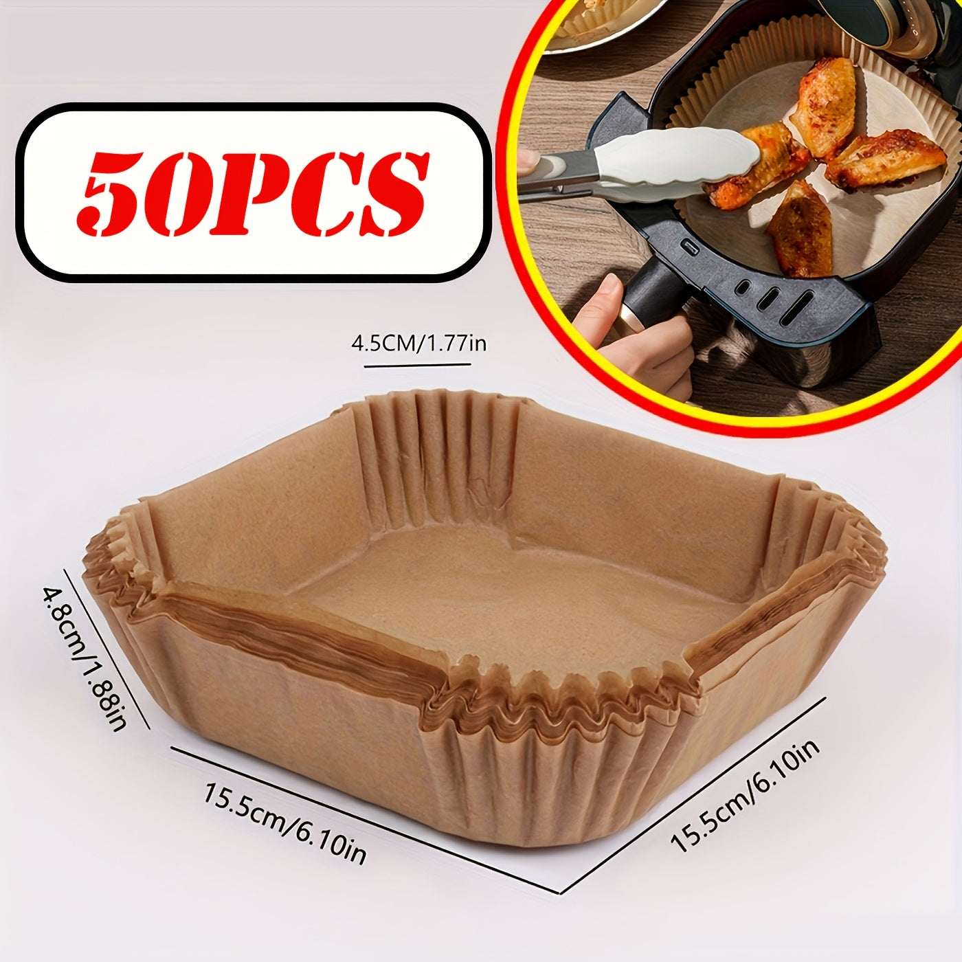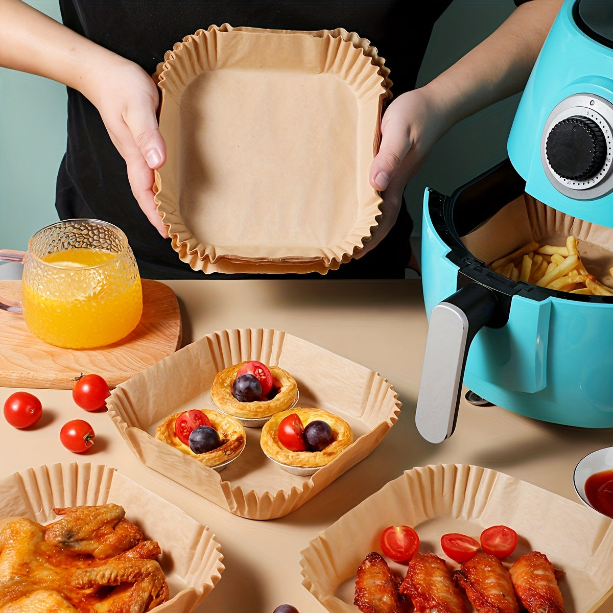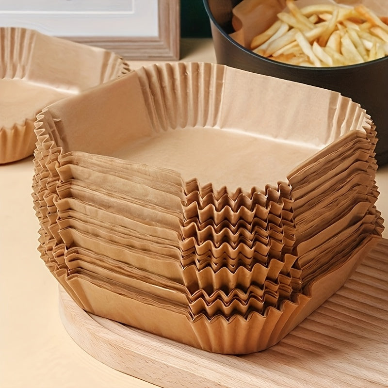 Havo fritözlari uchun bir martalik parcha qog'oz qoplamalari, kvadrat shaklida, yog' va suvga chidamli, yopishmaydigan savatlar uchun mo'ljallangan.