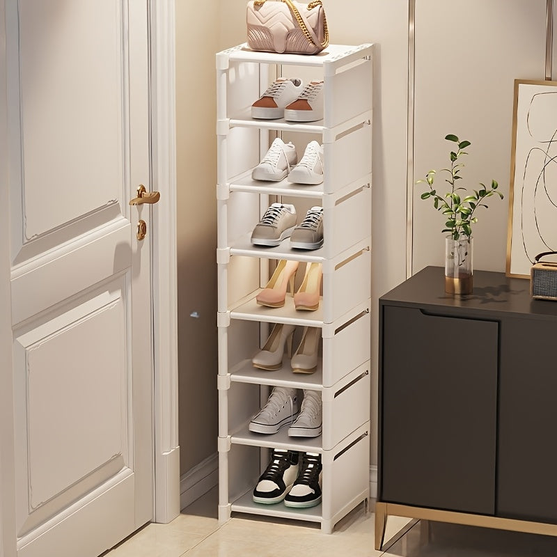 7 qatlamli yupqa oyoq kiyim shkaf tashkilotchisi, metall va plastmassadan tayyorlangan, chang yopadigan mustaqil dizayn. 4-7 juft oyoq kiyim va botinkalar uchun katta sig'imli saqlash imkonini beradi. Kirish joylari, shkaflar, uylar va yotoqxonalarga mos.