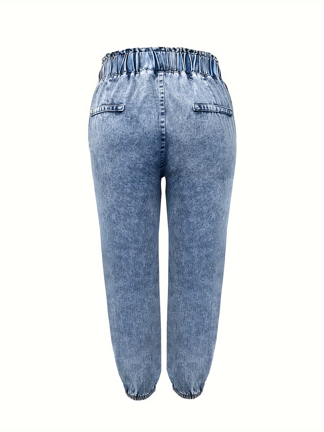 Katta o'lchamdagi ayollar uchun polyester aralashmasi bilan to'qilgan, cho'zilmaydigan matodan tayyorlangan, qorda naqshli denim jinsi.