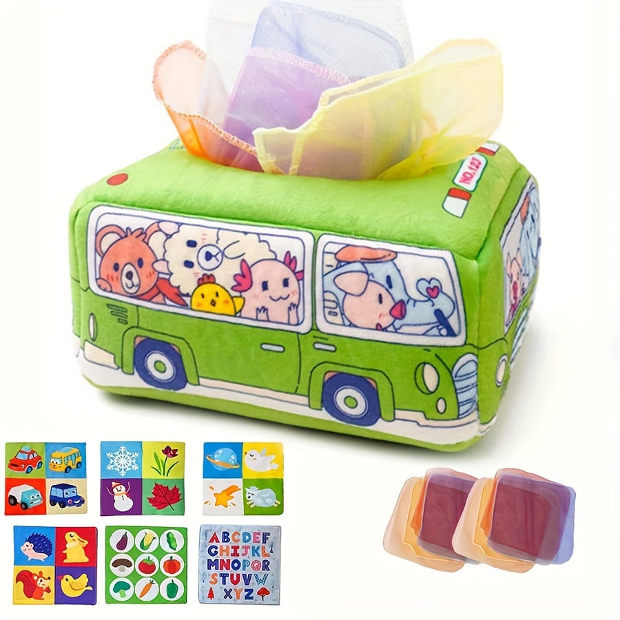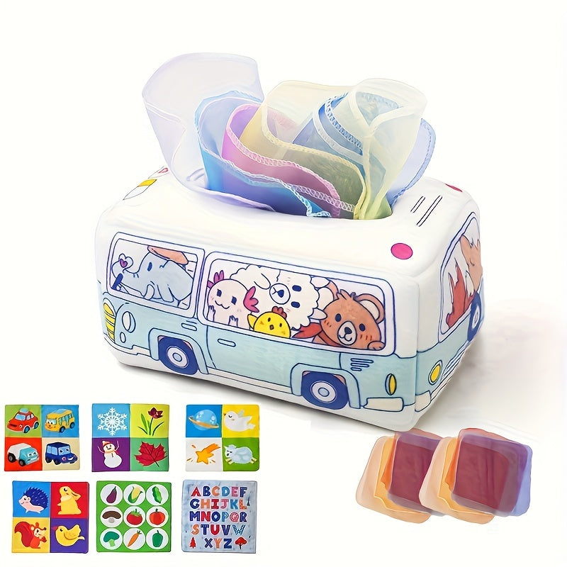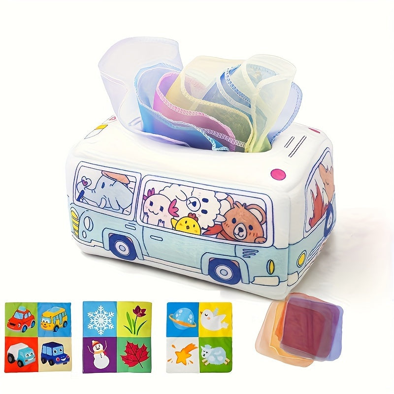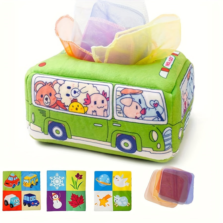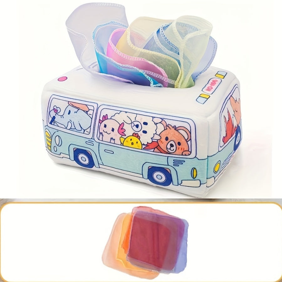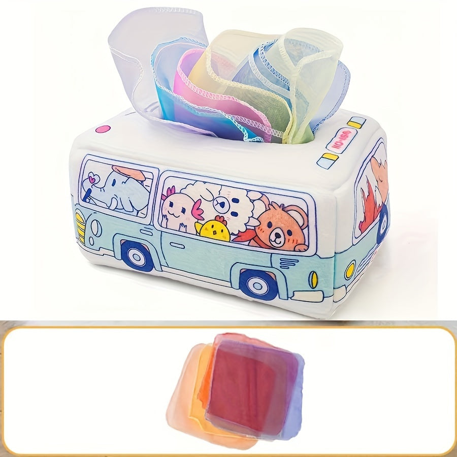 Yumshoq mato bolalar uchun tissue qutisi o'yinchoq, sezgirlik o'yini uchun, krinkli ovozli, ko'p rangli transport vositasi, 0-3 yosh