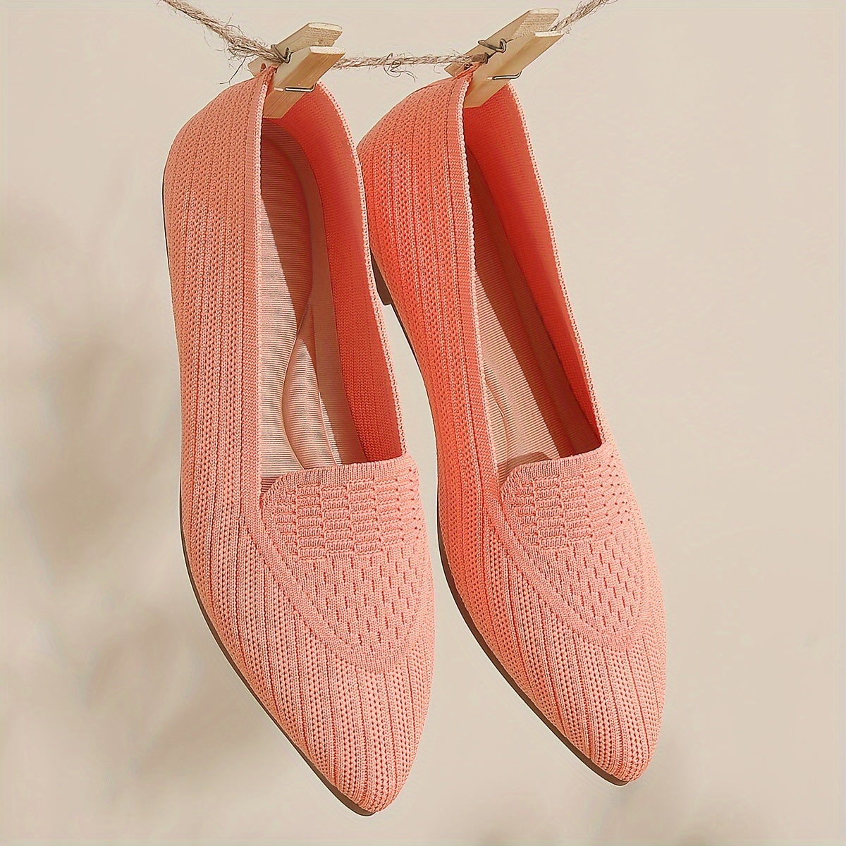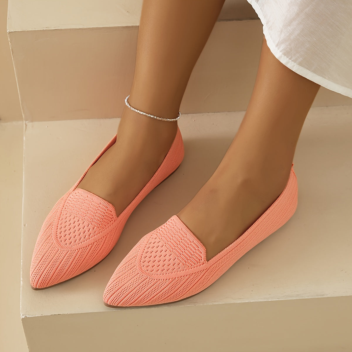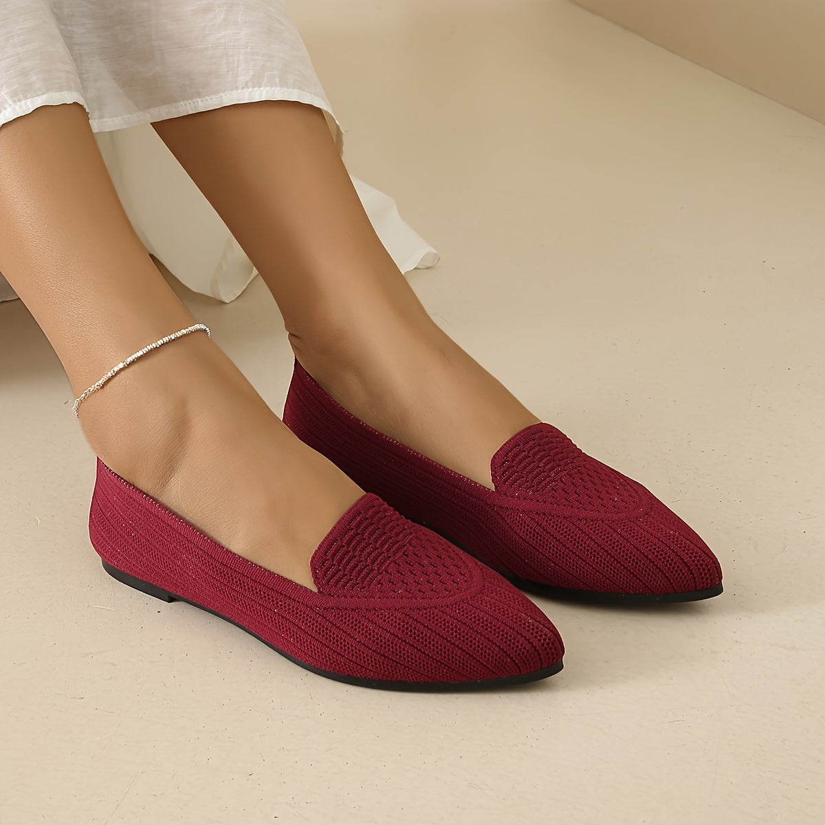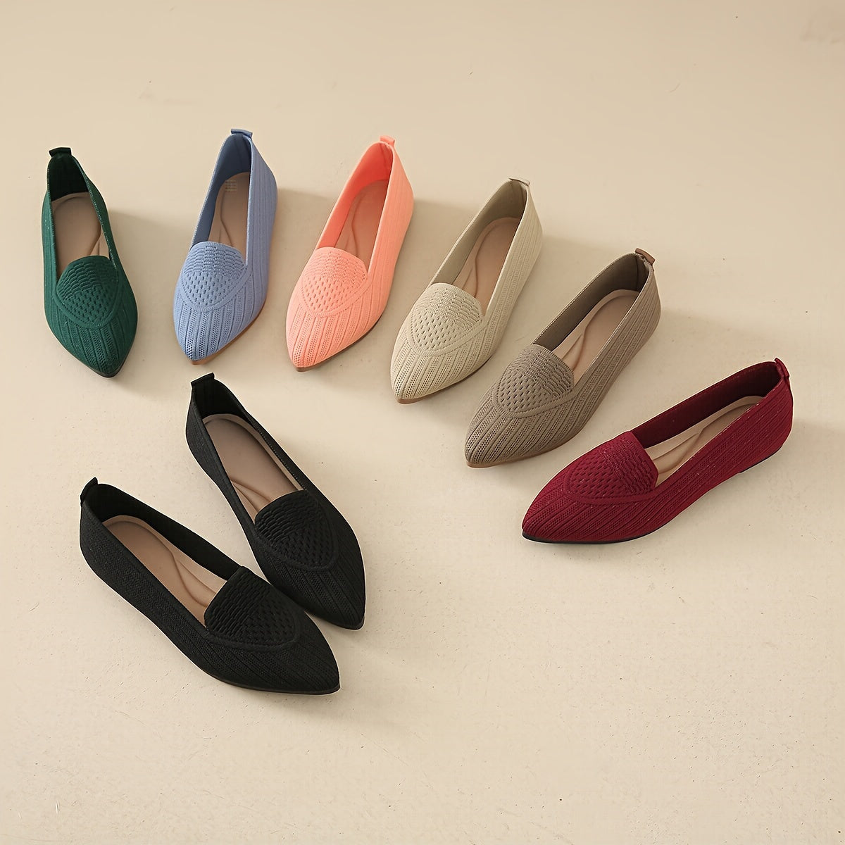 Ayollar uchun mustahkam ranglarda yumshoq, engil to'qilgan tekis poyabzal, nuqtali barmoq va havo o'tkazuvchi dizayn bilan.