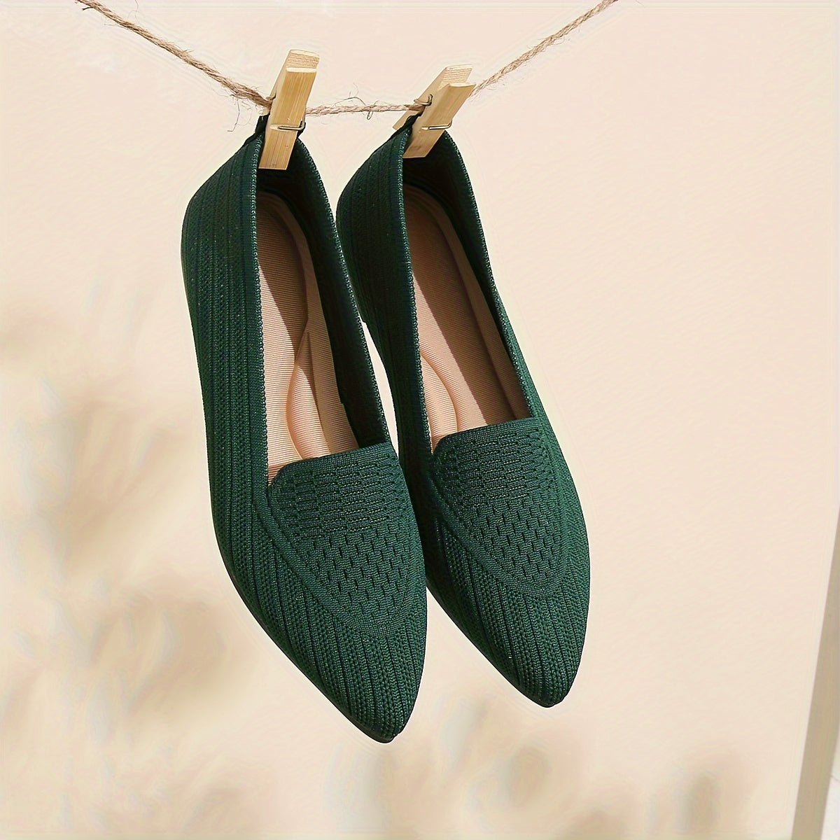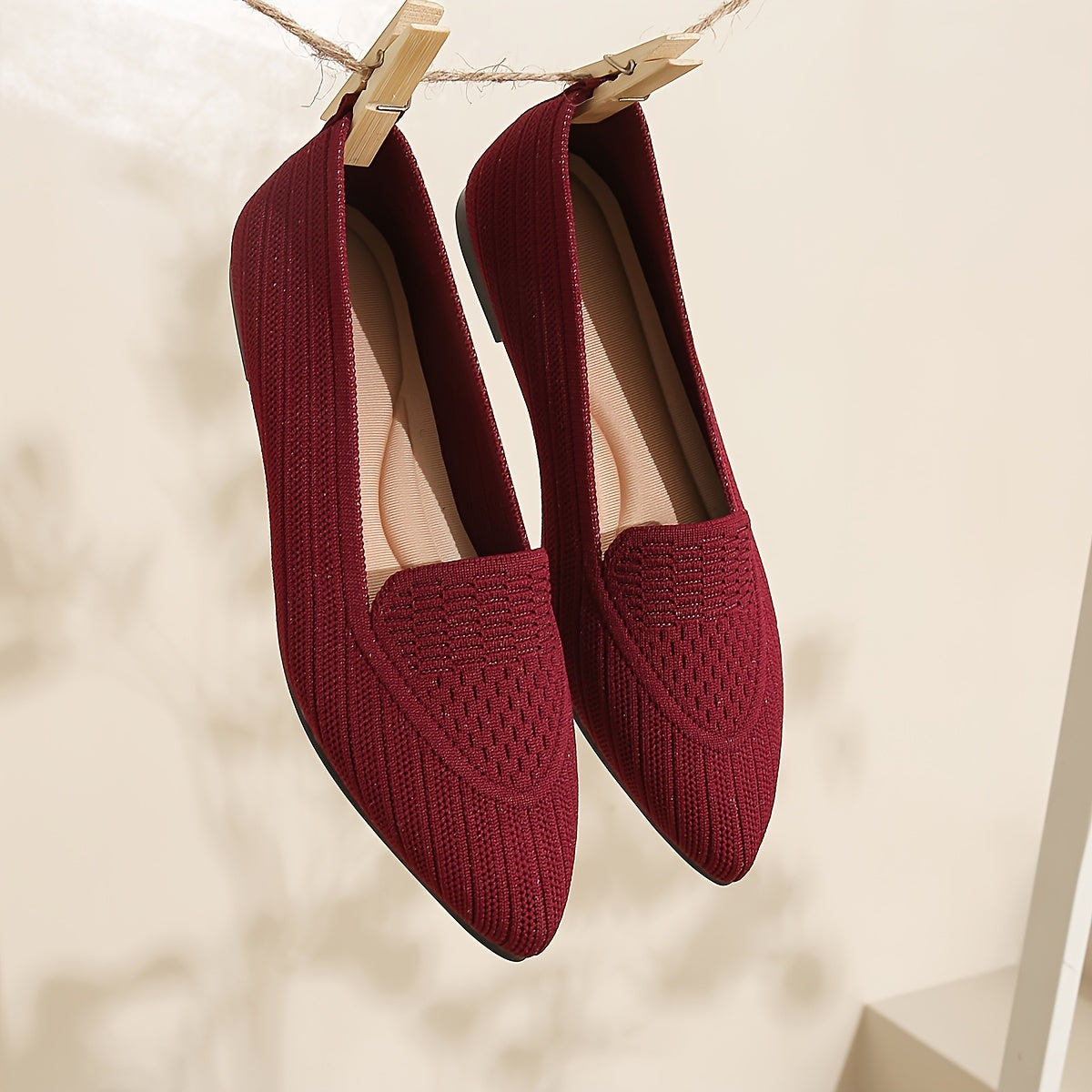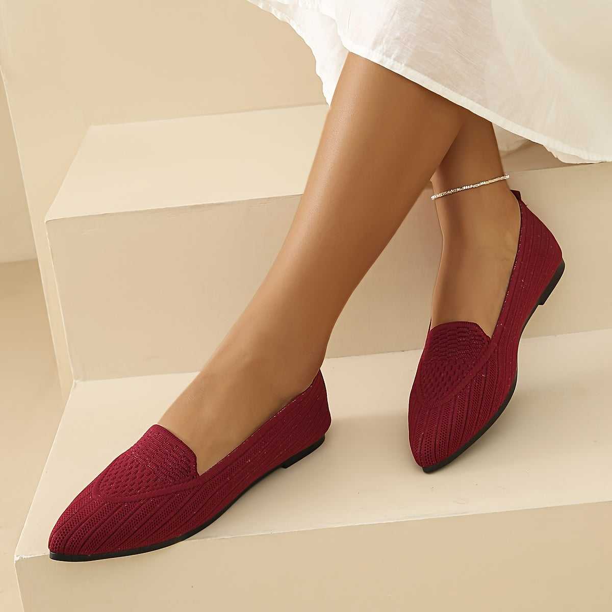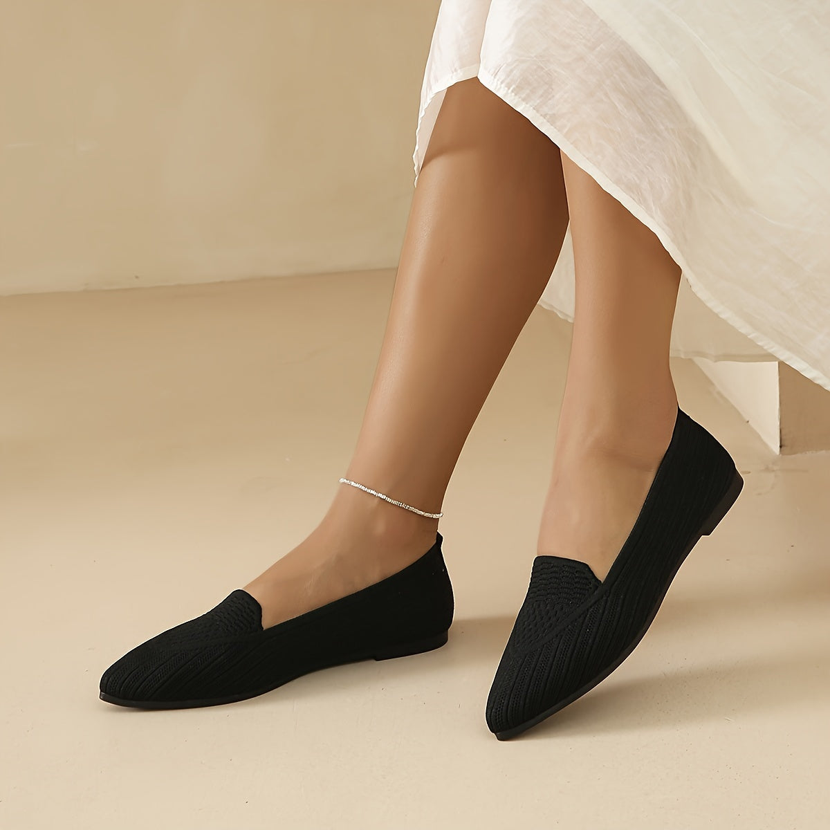 Ayollar uchun mustahkam ranglarda yumshoq, engil to'qilgan tekis poyabzal, nuqtali barmoq va havo o'tkazuvchi dizayn bilan.