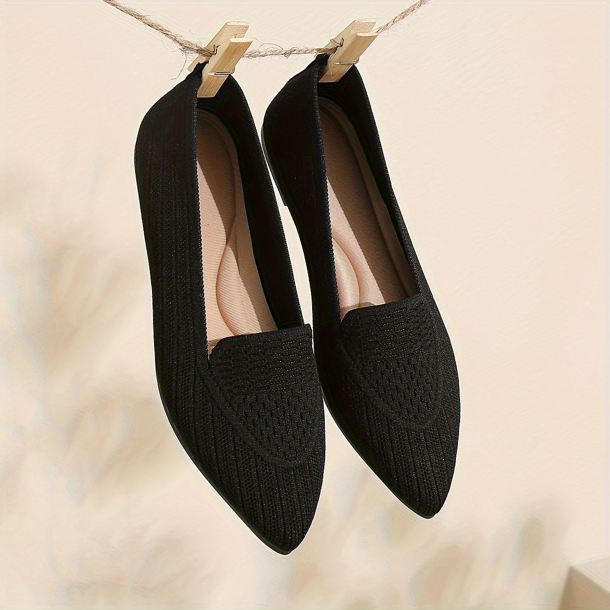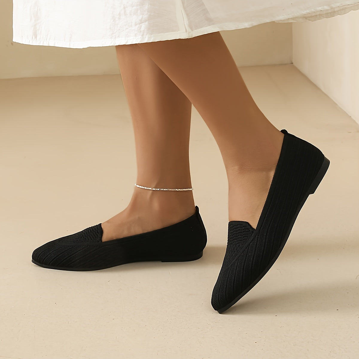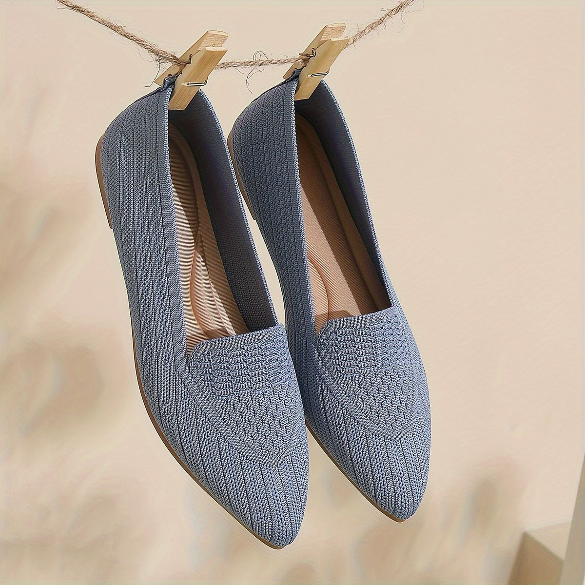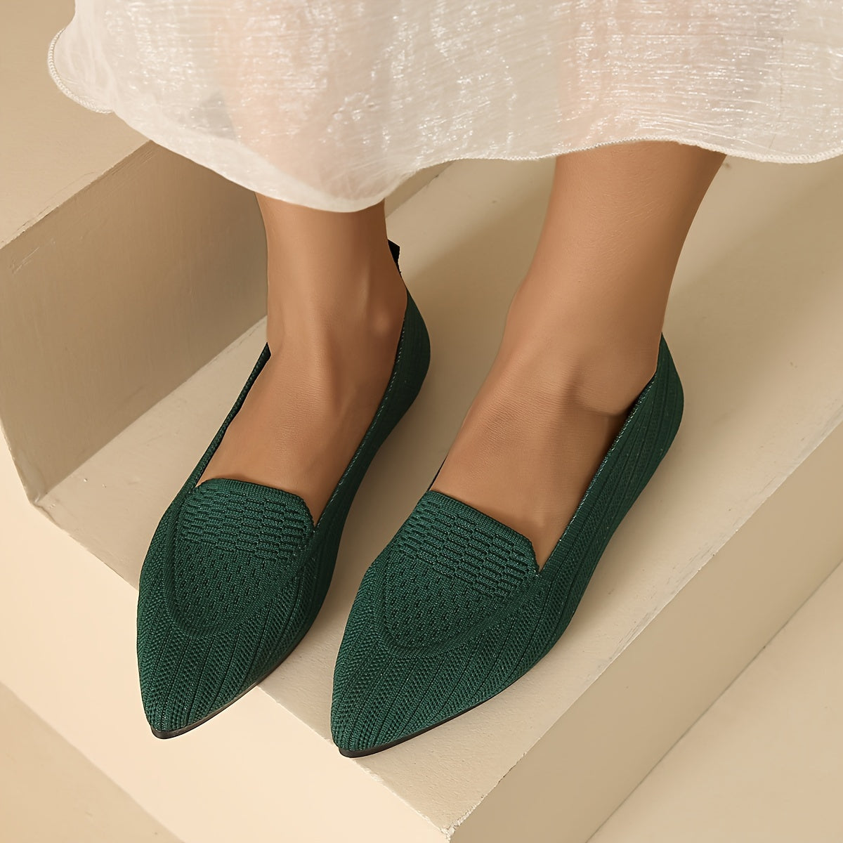 Ayollar uchun mustahkam ranglarda yumshoq, engil to'qilgan tekis poyabzal, nuqtali barmoq va havo o'tkazuvchi dizayn bilan.