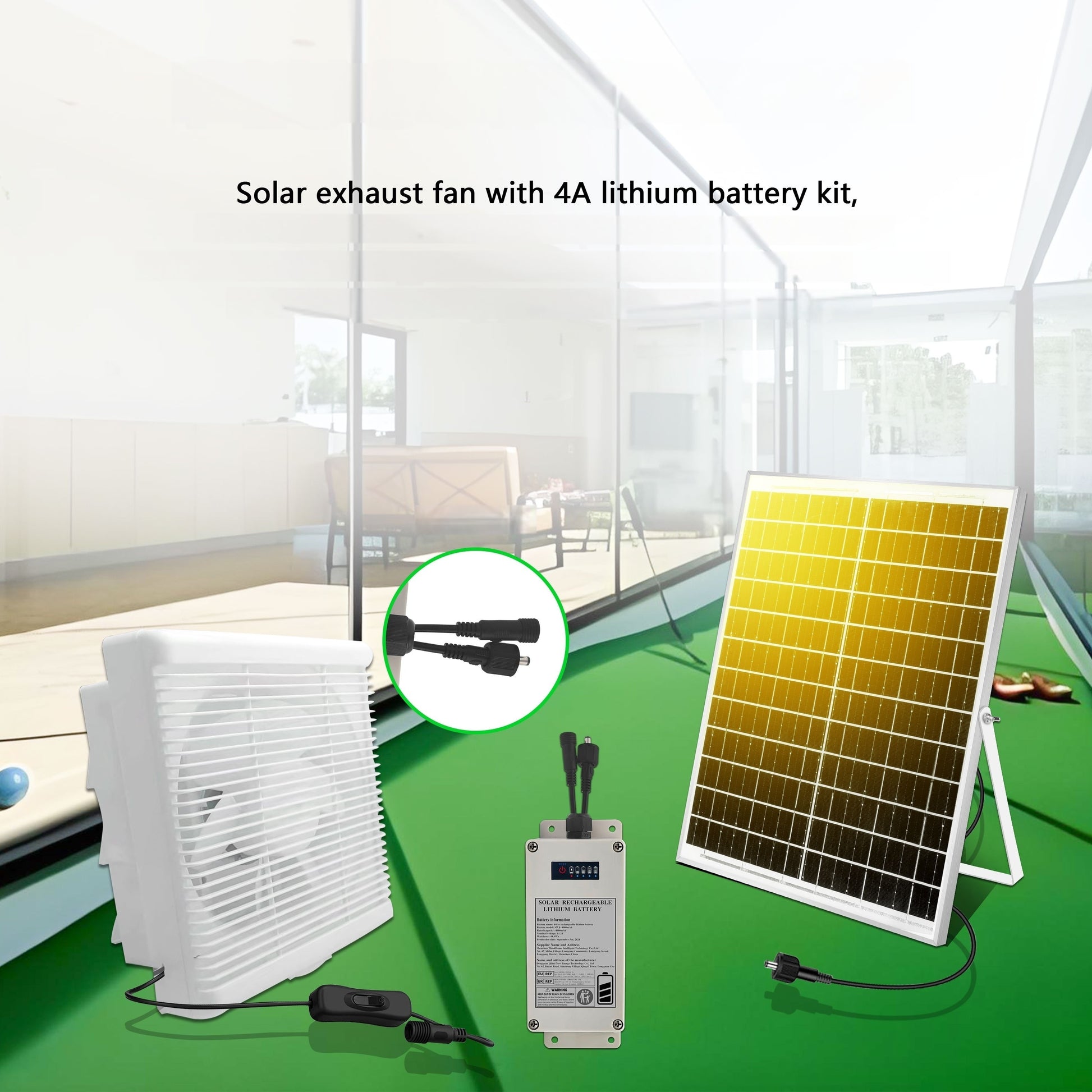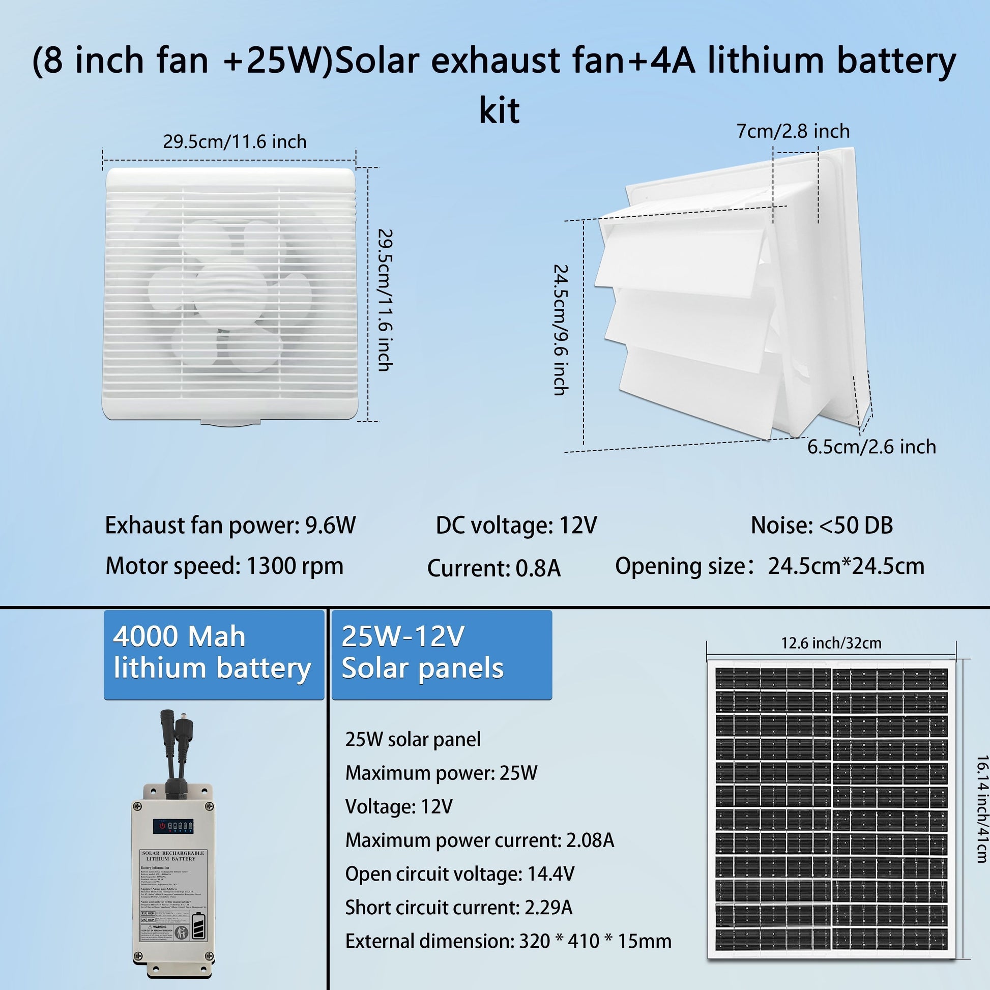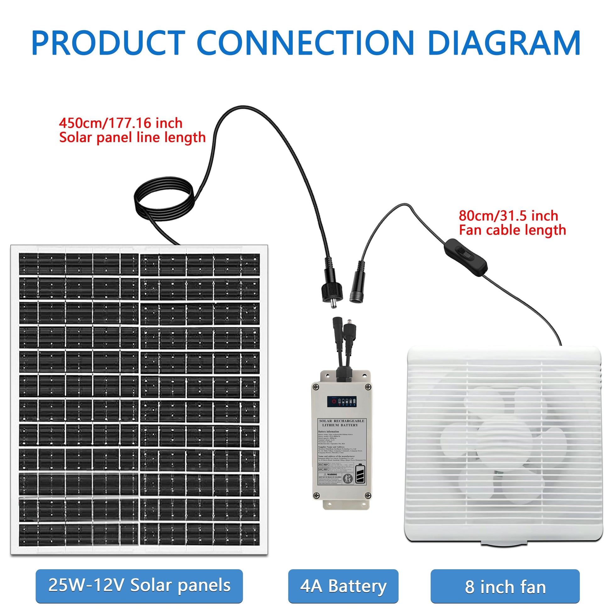 Qayta tiklanadigan batareyali quyoshli ventilyator, 25W quyoshli ventilyator to'plami va 8 dyuymli ventilyator bilan ishlaydi, issiqxona, ichki joylar va kichik binolar uchun mos.