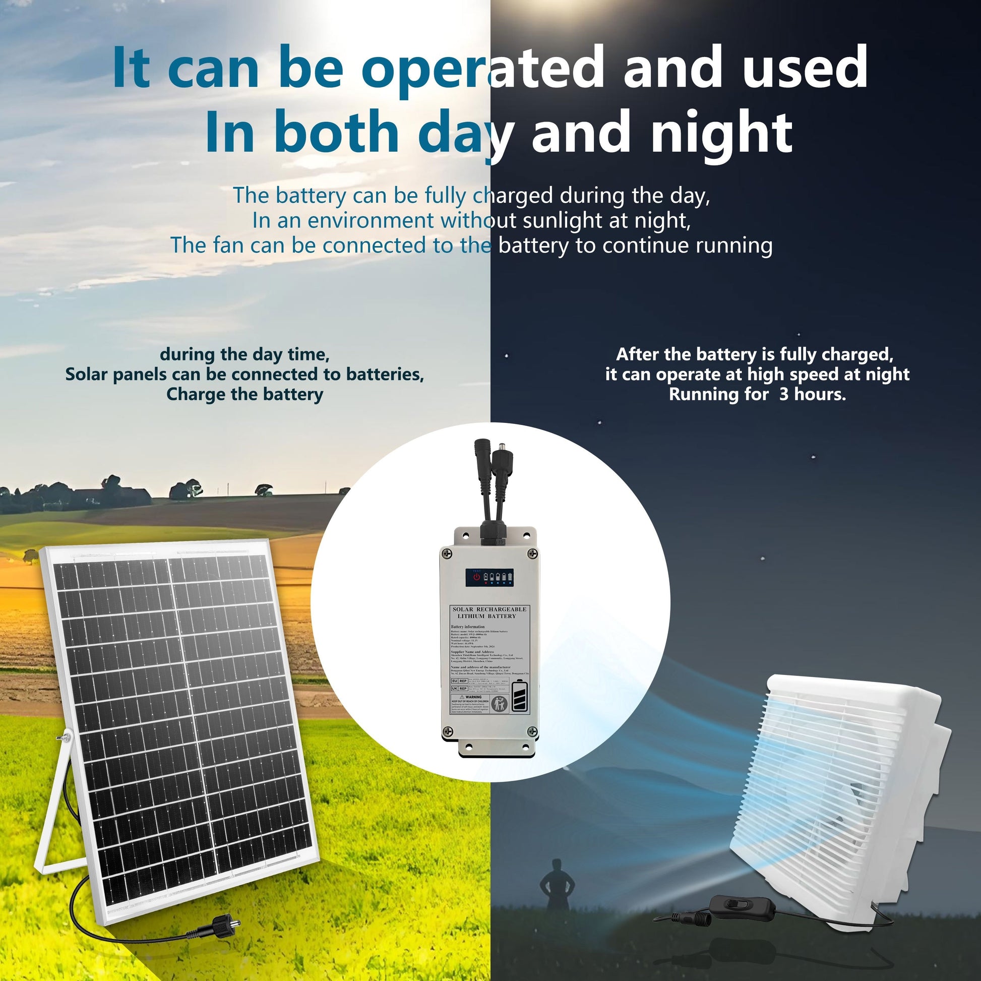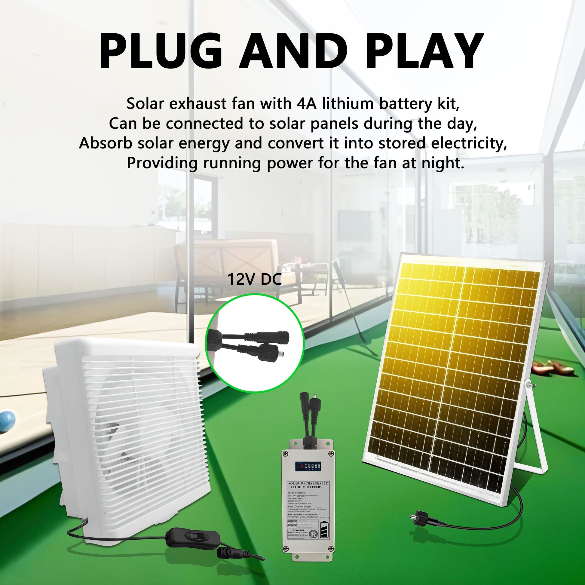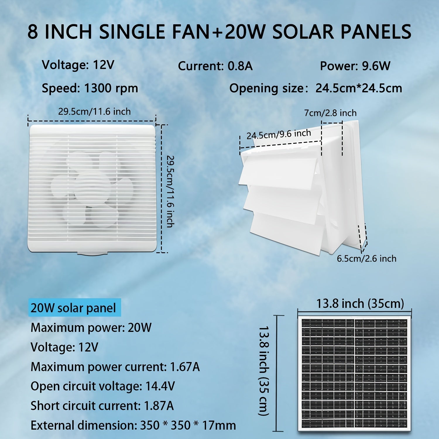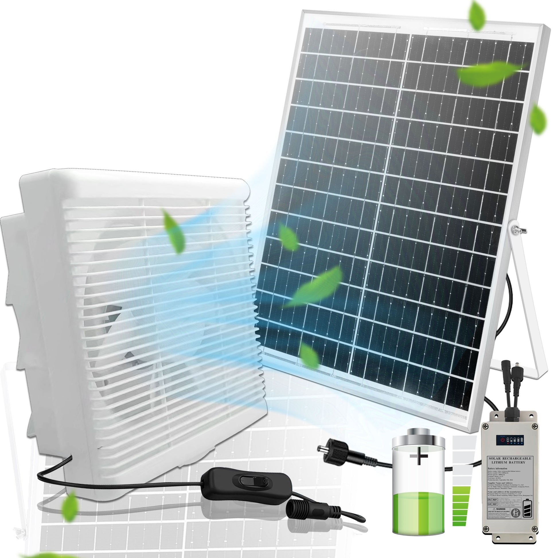 Qayta tiklanadigan batareyali quyoshli ventilyator, 25W quyoshli ventilyator to'plami va 8 dyuymli ventilyator bilan ishlaydi, issiqxona, ichki joylar va kichik binolar uchun mos.