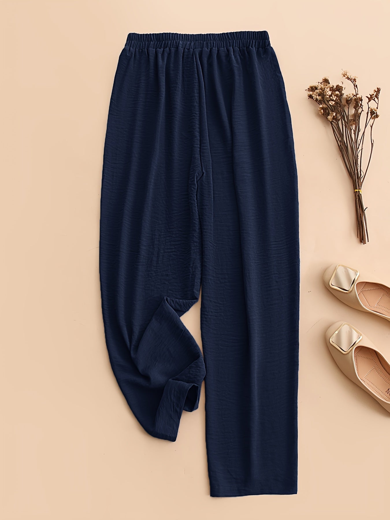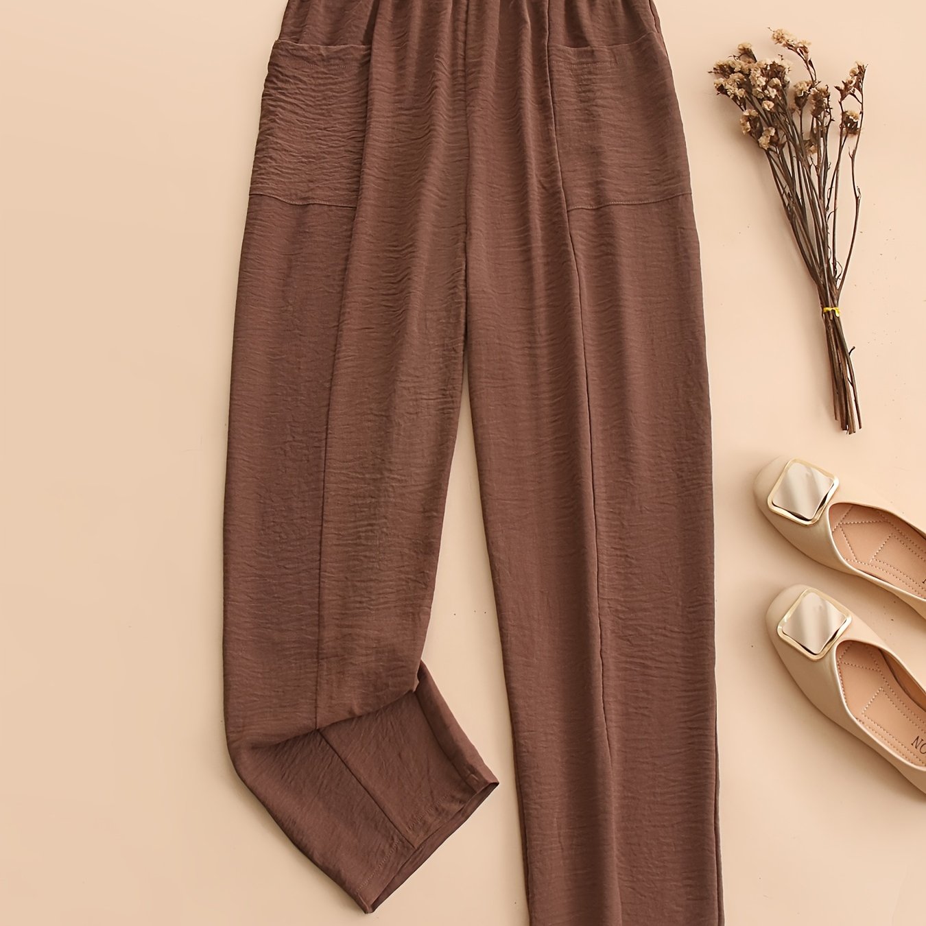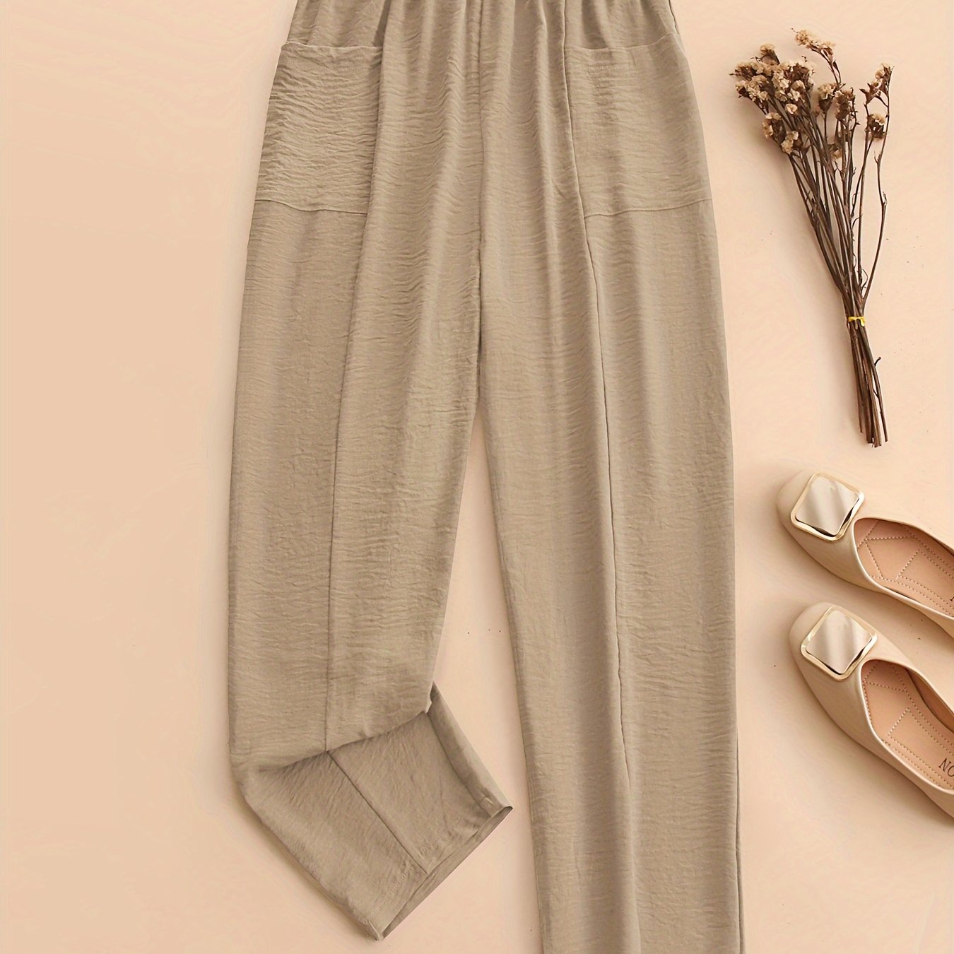 Yoz va bahor uchun ayollar uchun plussiz o'lchamdagi cho'ntakli, elastik belga ega bir rangli plussiz shimlar.