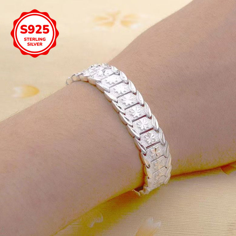 Murakkab erkaklar uchun S925 sterling kumush keng bilaguzuk, Yevropa tangasi dizayni bilan, 12mm o'lchamda. Gippoallergen va har kuni kiyish va maxsus tadbirlar uchun mos, bu bilaguzuk retro va fransuz ilhomlangan uslubni aks ettiradi. Perfect gift for