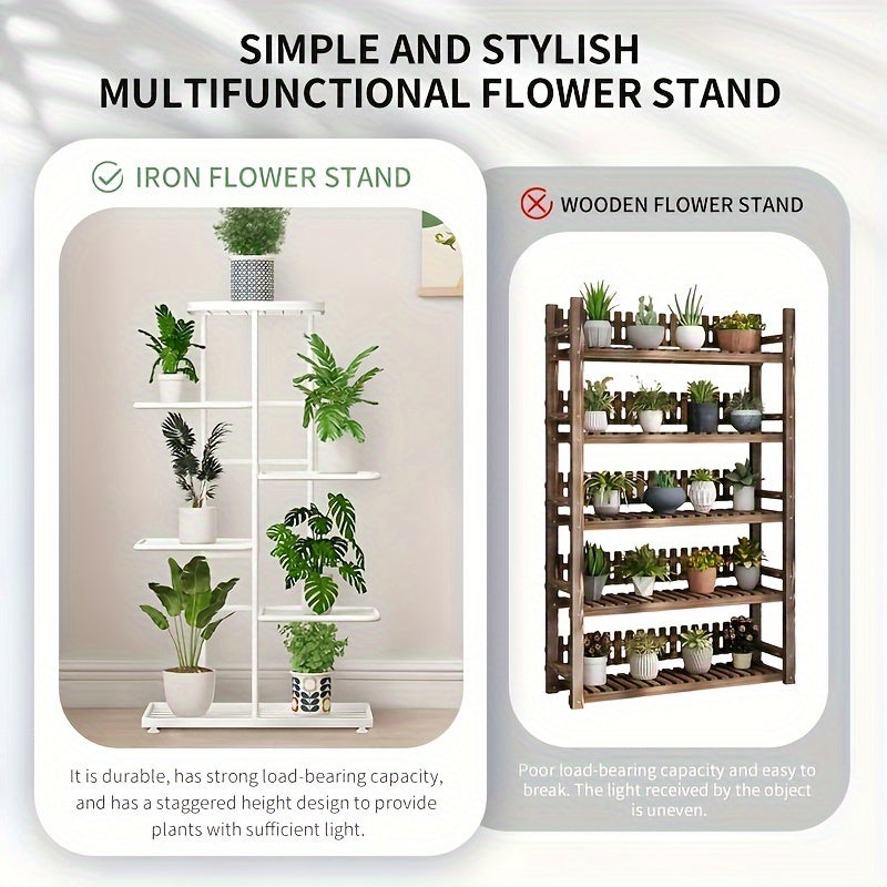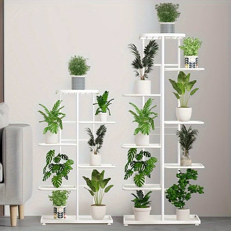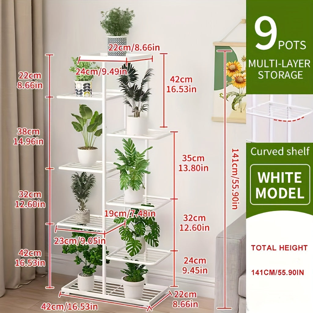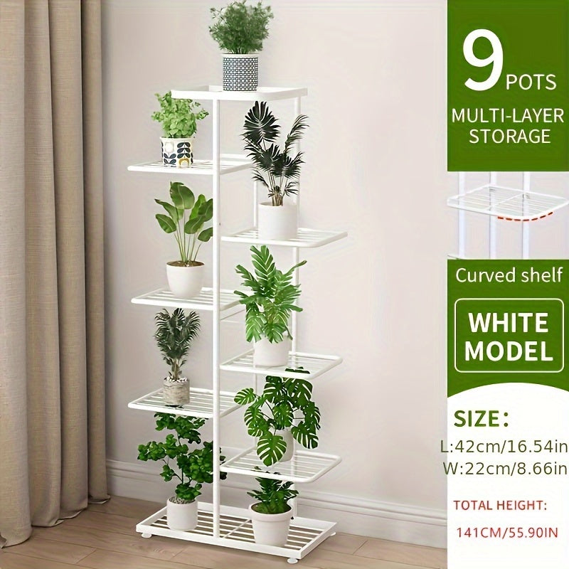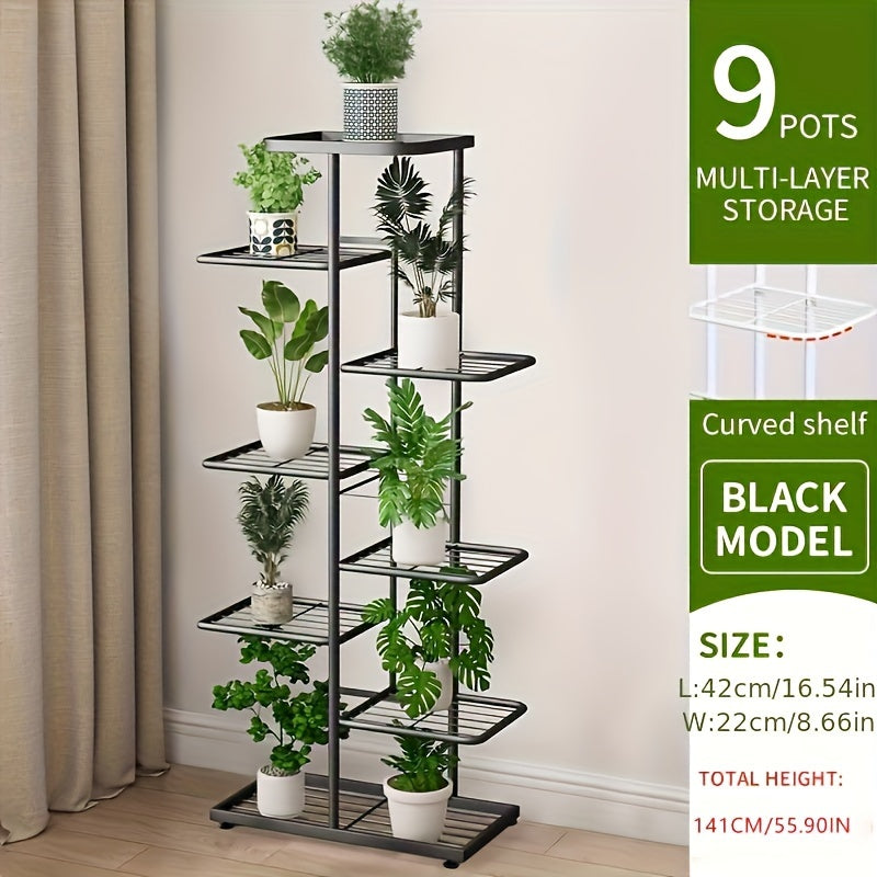 8 qavatli qora metall o'simlik stendi ichki va tashqi foydalanish uchun mo'ljallangan, 9 ta potta o'simlikka chidamli