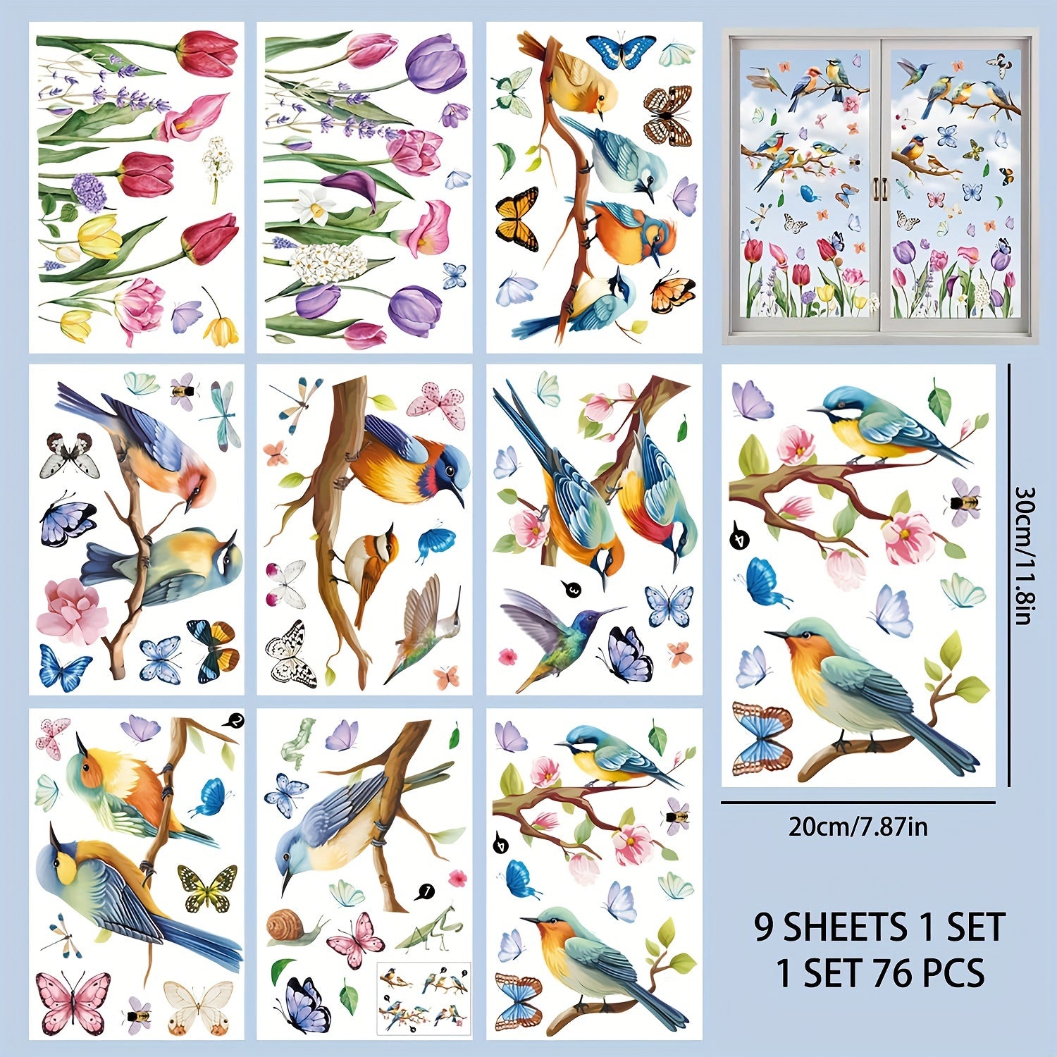 Bahor Deraza Qoplamalari - Ikkala Tomonlama Qush Gel Stikerlari - 9 Varak - Uy, Ofis, Maktab, Do'kon yoki Partiya uchun Shisha Derazalar uchun Ideal - Mukammal Bahor va Yoz Dekoratsiya Ta'minotlari