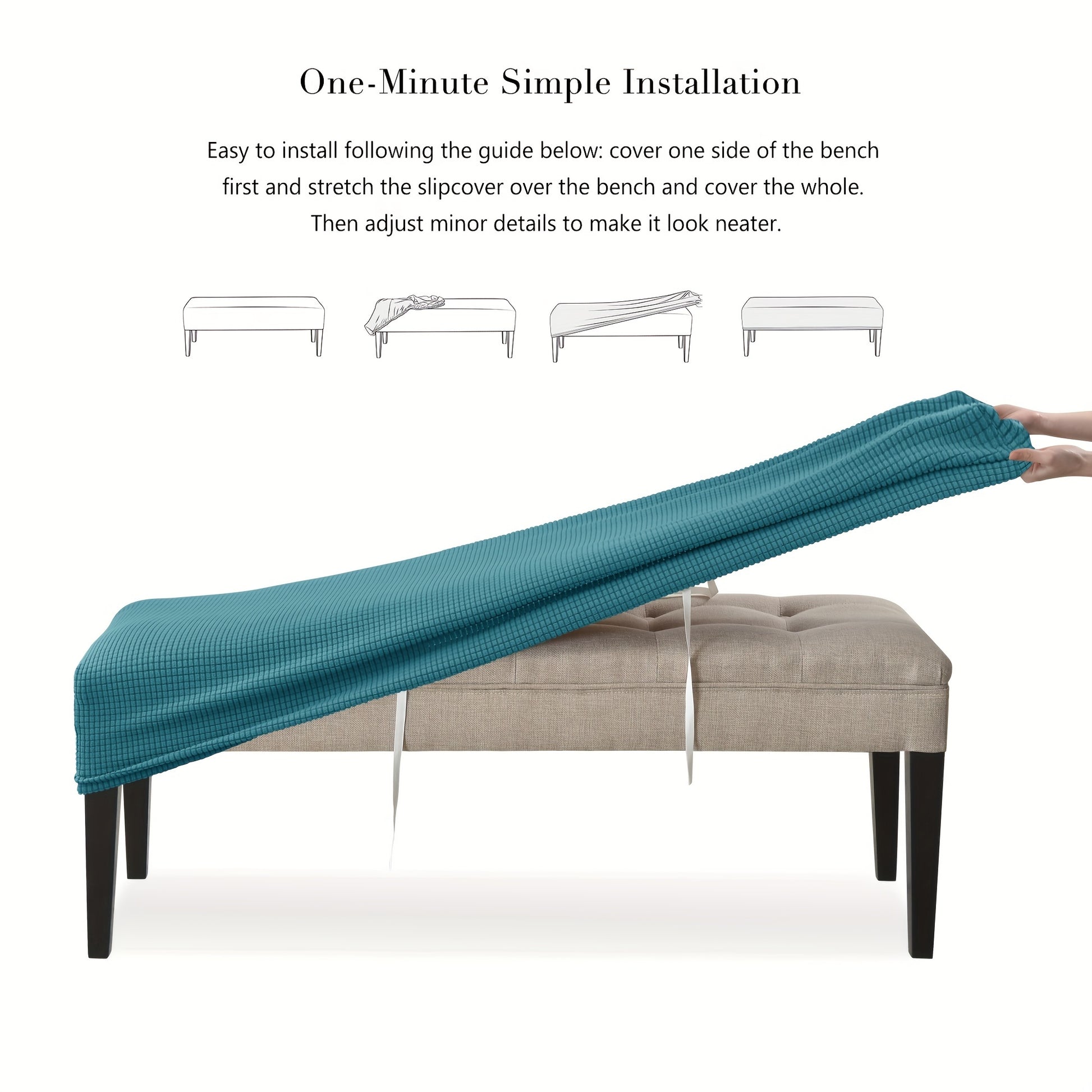 Elastik tasma bilan bir daqiqada oson o'rnatish uchun cho'ziluvchan teal makkajo'xori velur skameyka qoplamasi. Zamonaviy uslub va uy bezatish uchun mashinada yuvilishi mumkin.