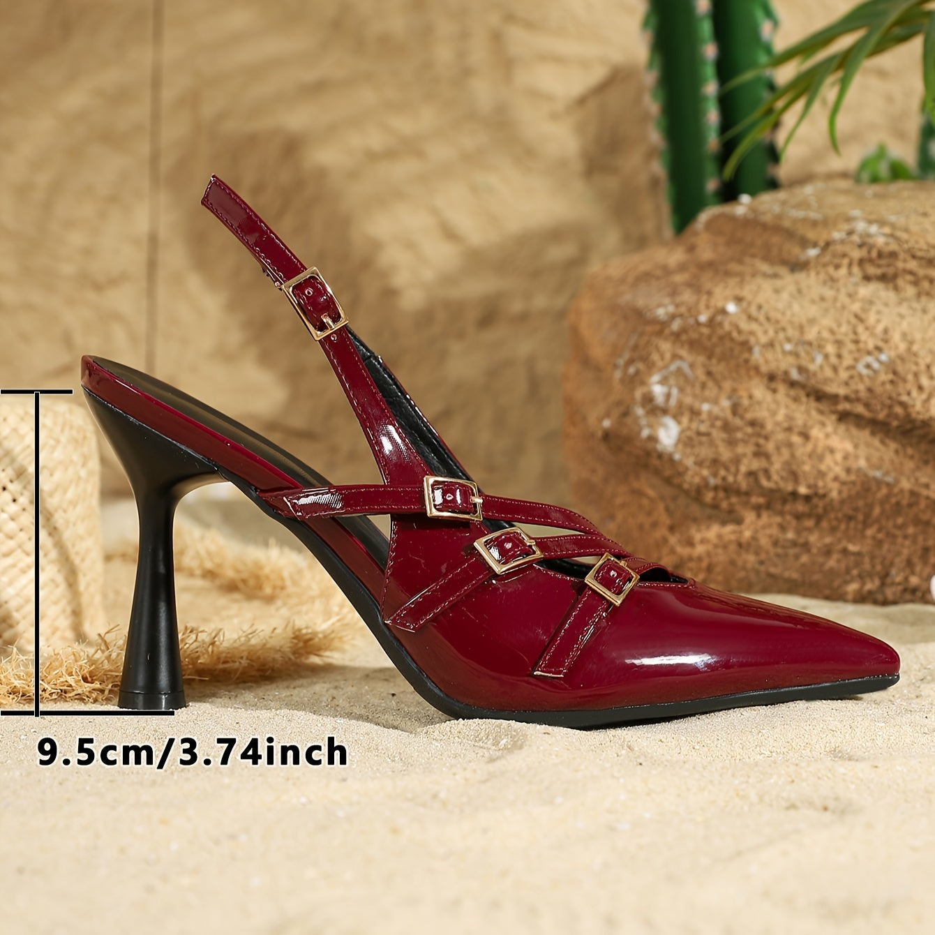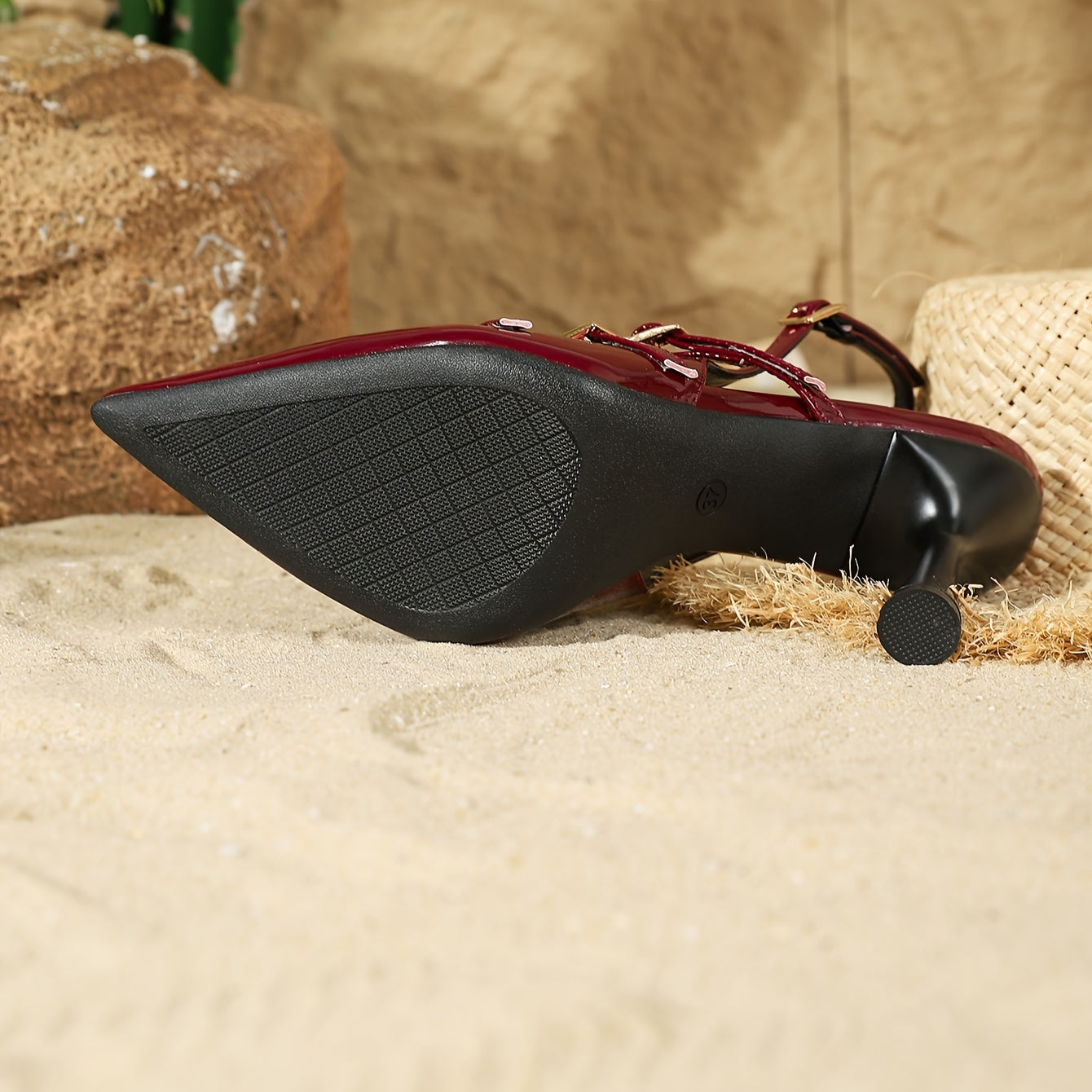 Partiyalar uchun zamonaviy bilak strapli stiletto to'pi, uchli barmoq va tokali tafsilotlar bilan.