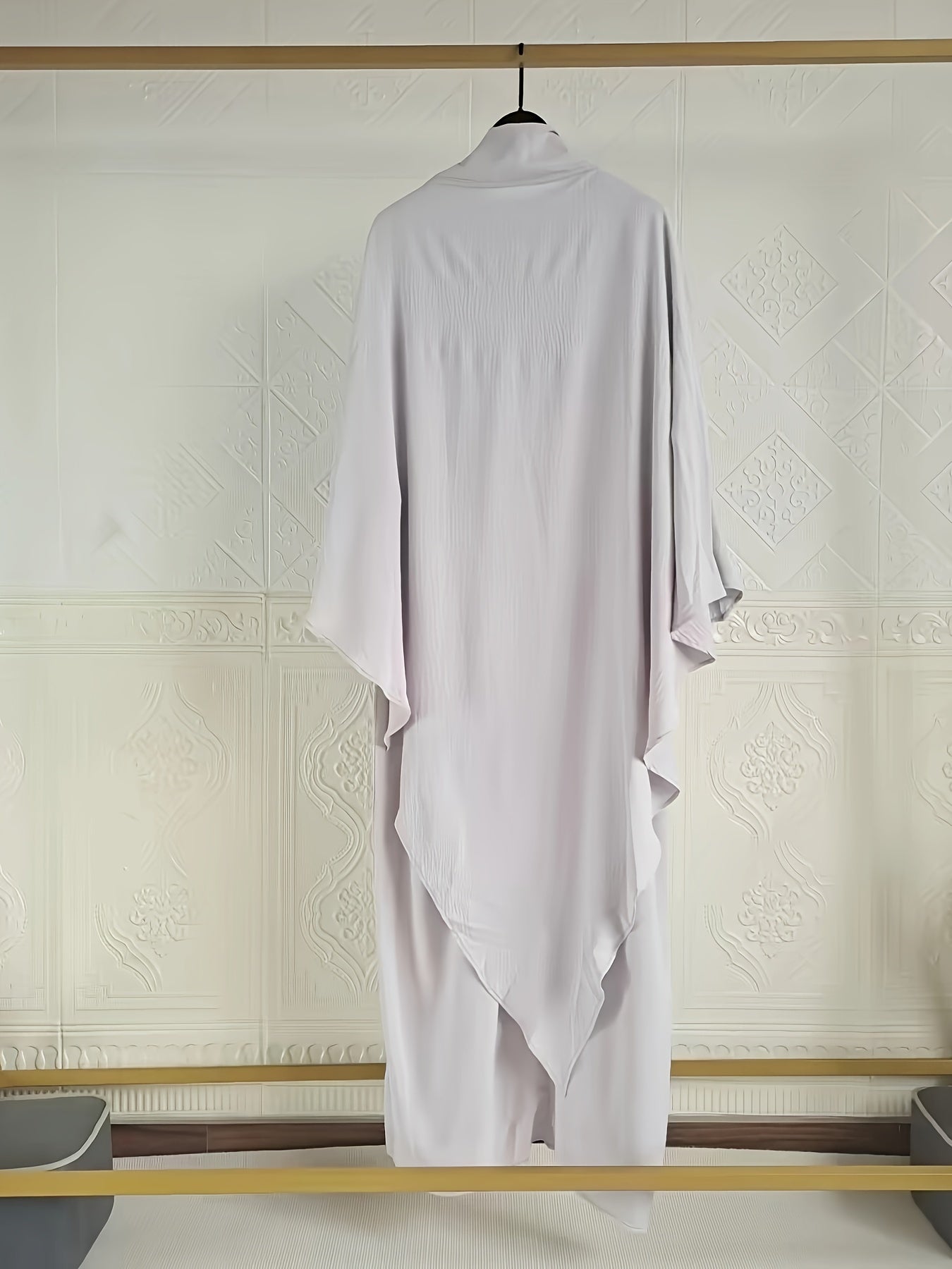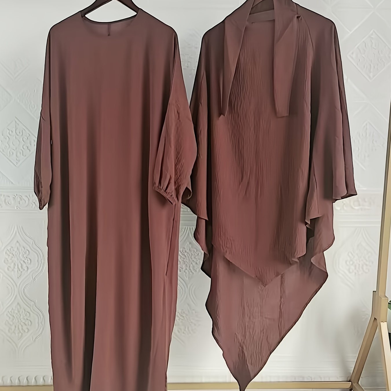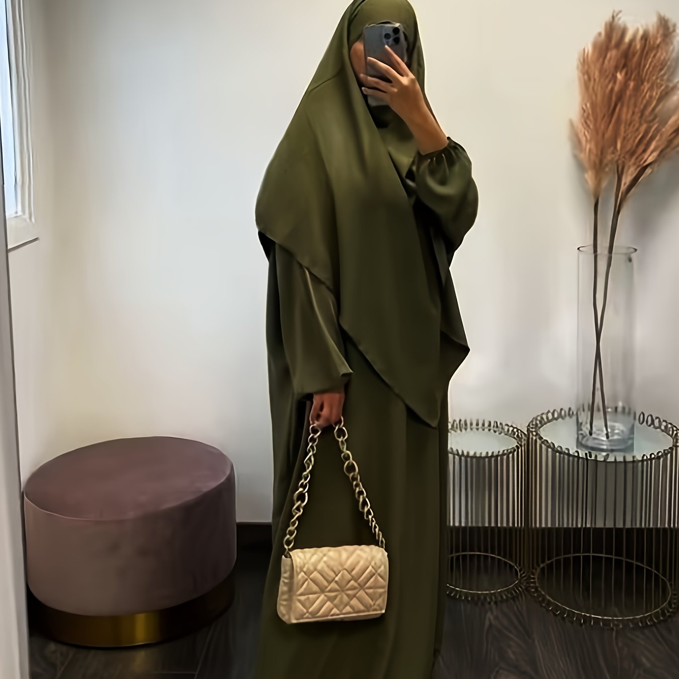 Usmon rangidagi zamonaviy qushqon yengli Ramazon ro'be, musulmon ayollar uchun katta o'lchamda.