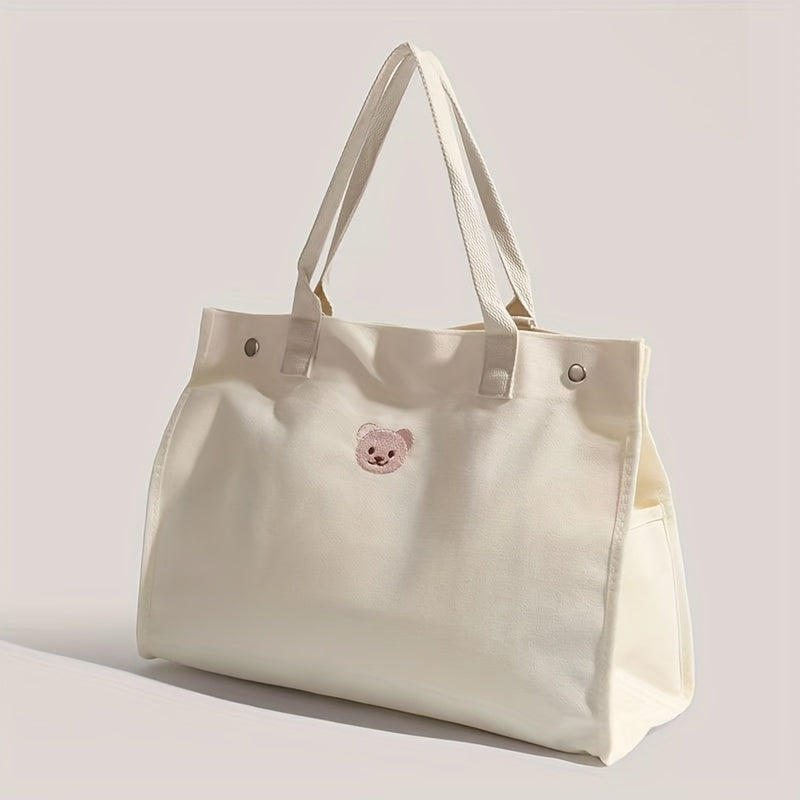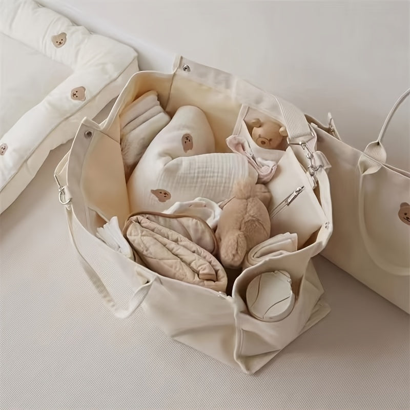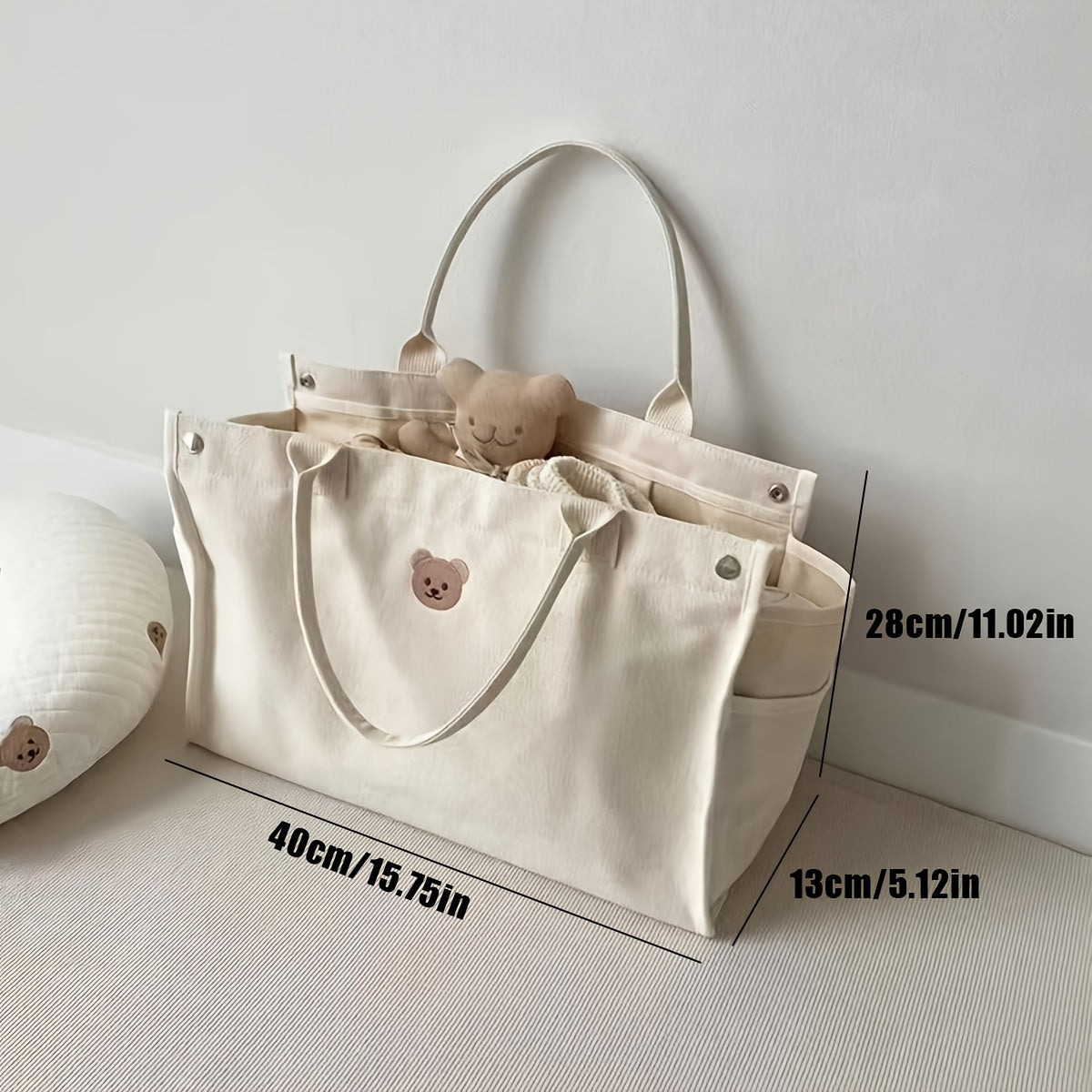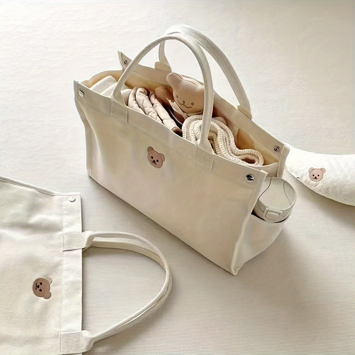 Zarif ayiq mavzusidagi to'plam sumkasi, mustahkam polyesterdan tayyorlangan, tozalash oson va oq rangda, pampers va kundalik zaruriy buyumlarni tashish uchun ideal.