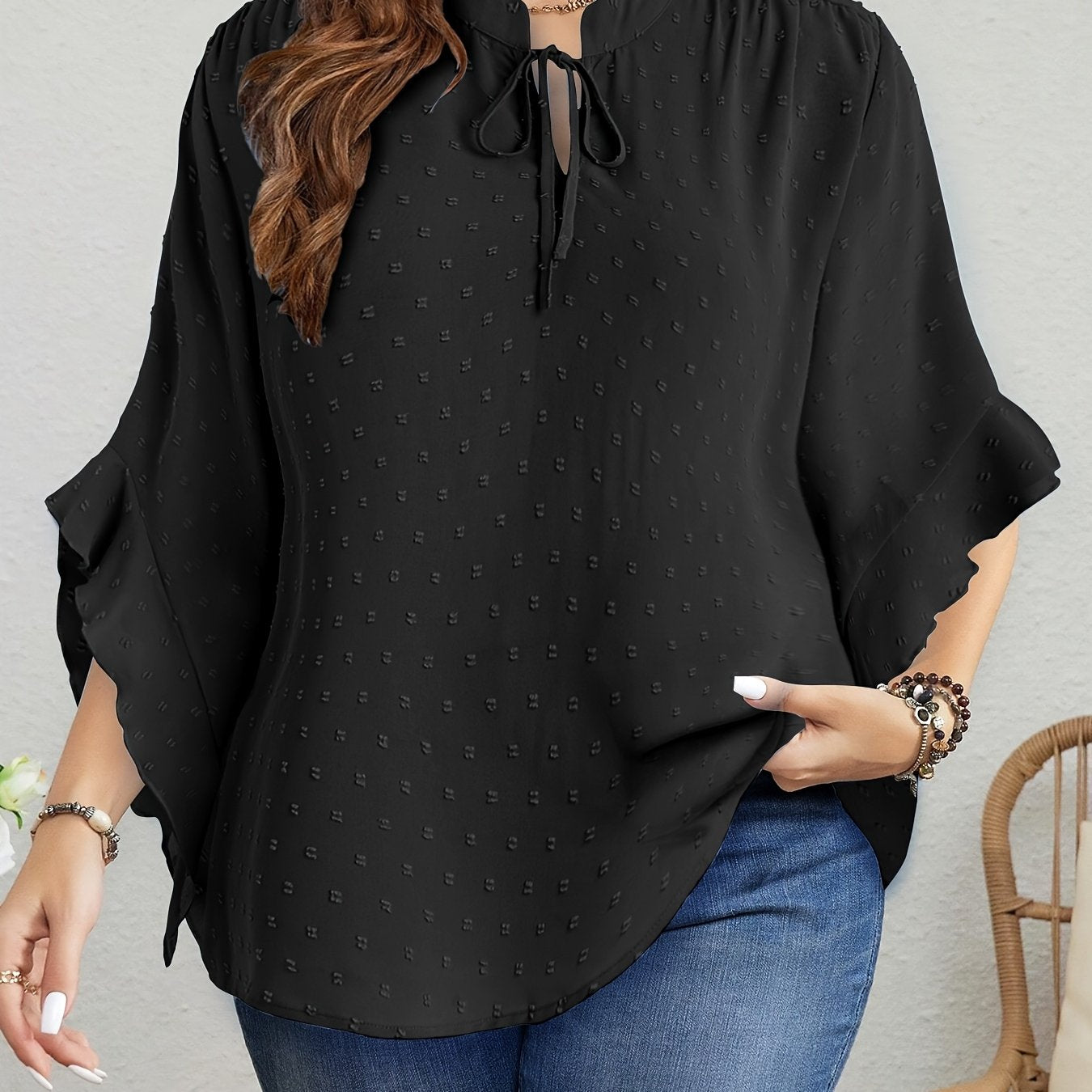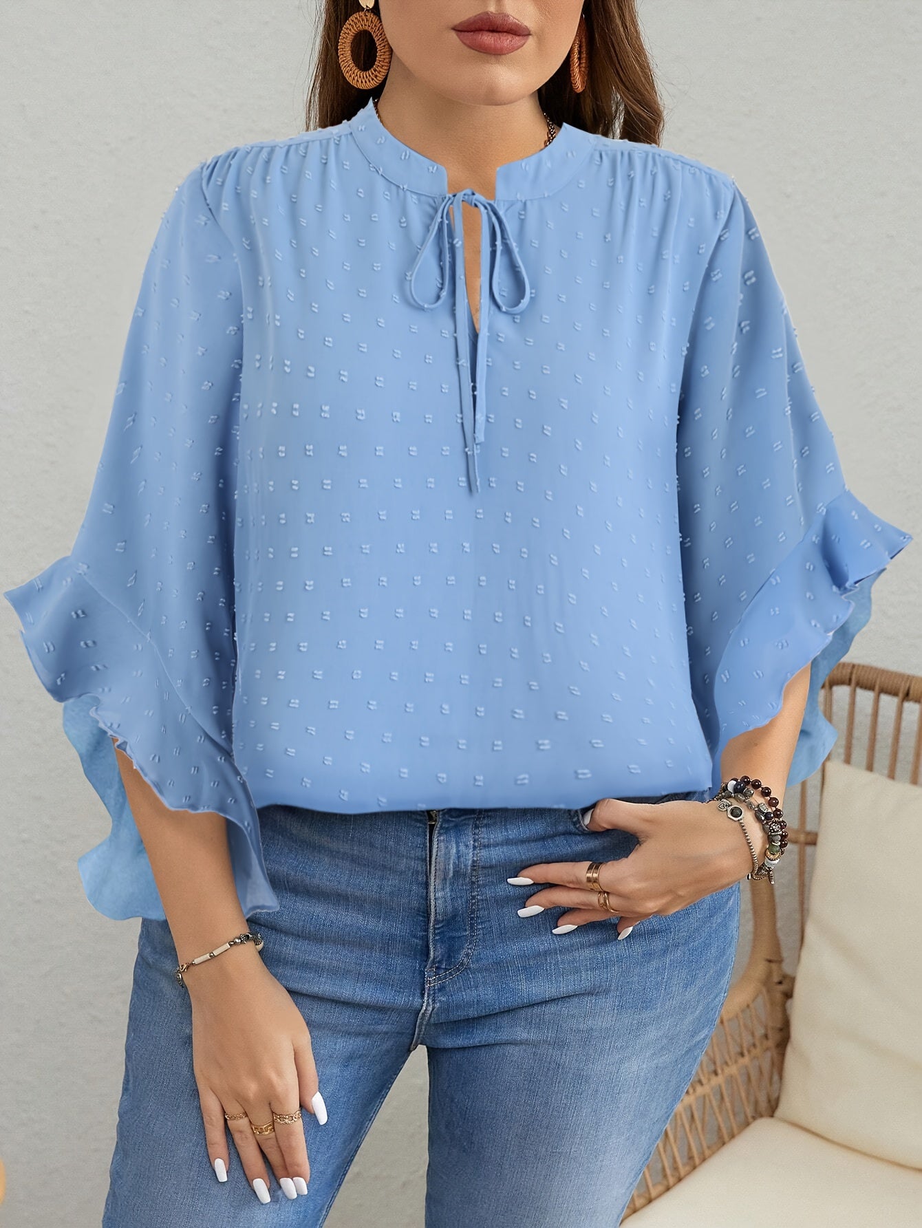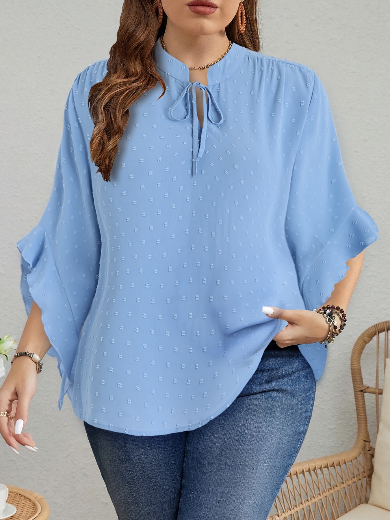 Bej Shveytsariya nuqtali bluz, ruffle bilan bezatilgan, bog'lamali bo'yin, uzun qo'lli, kuz vintage uslub