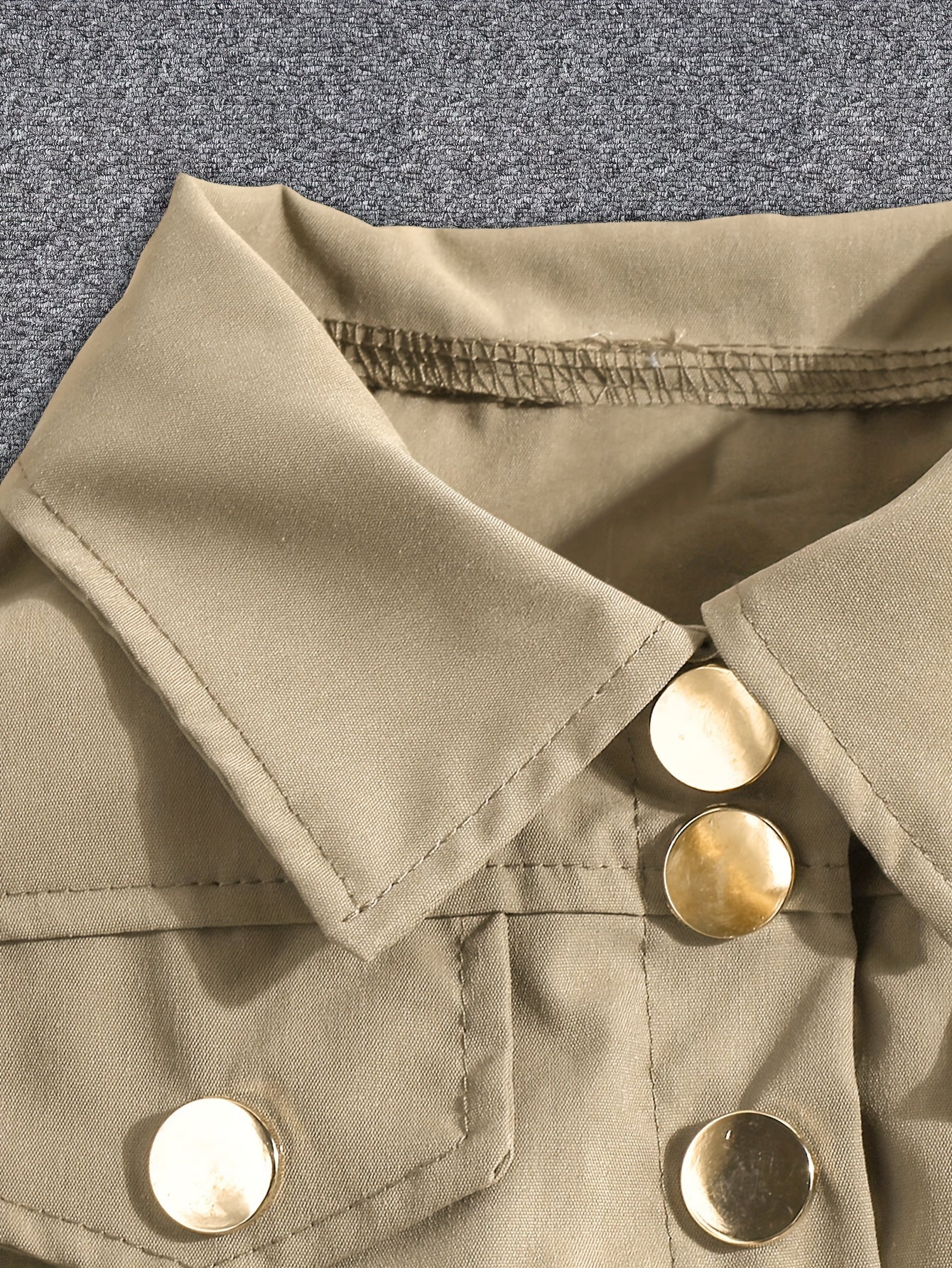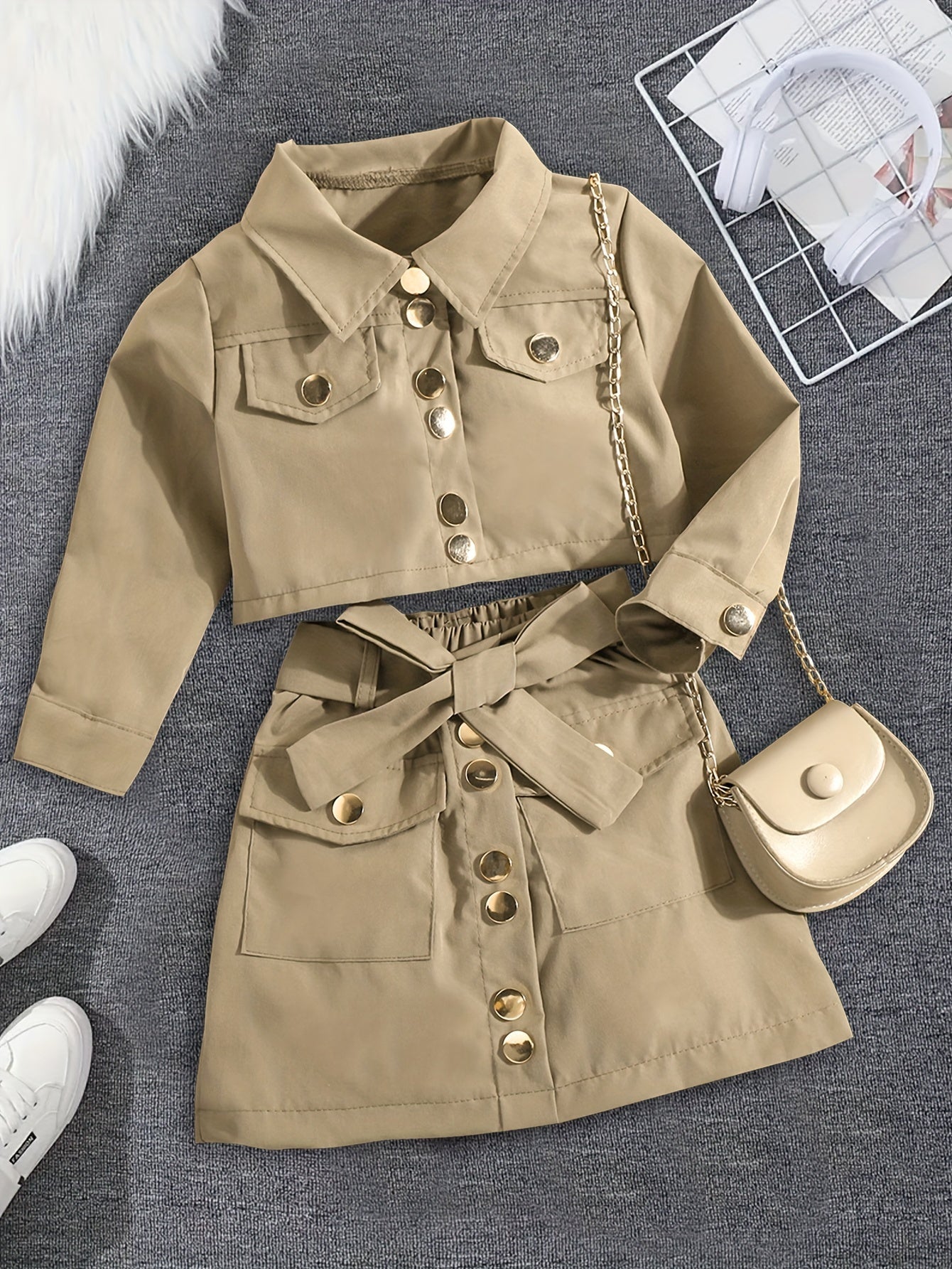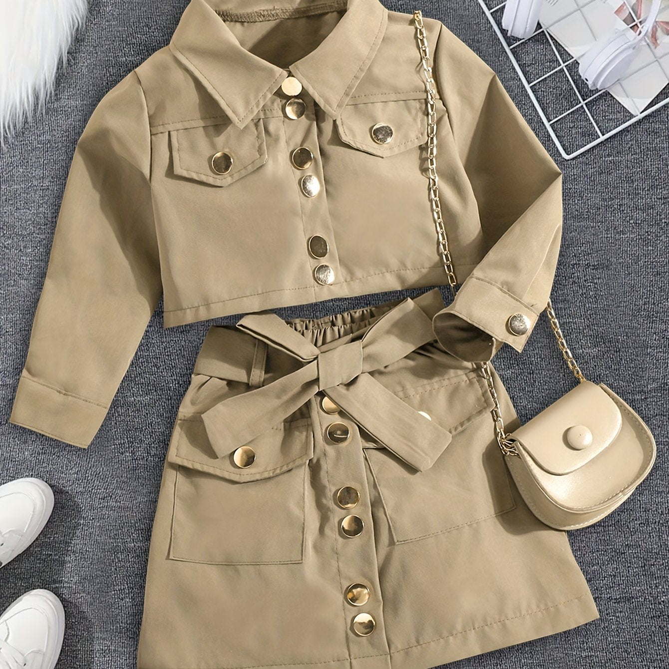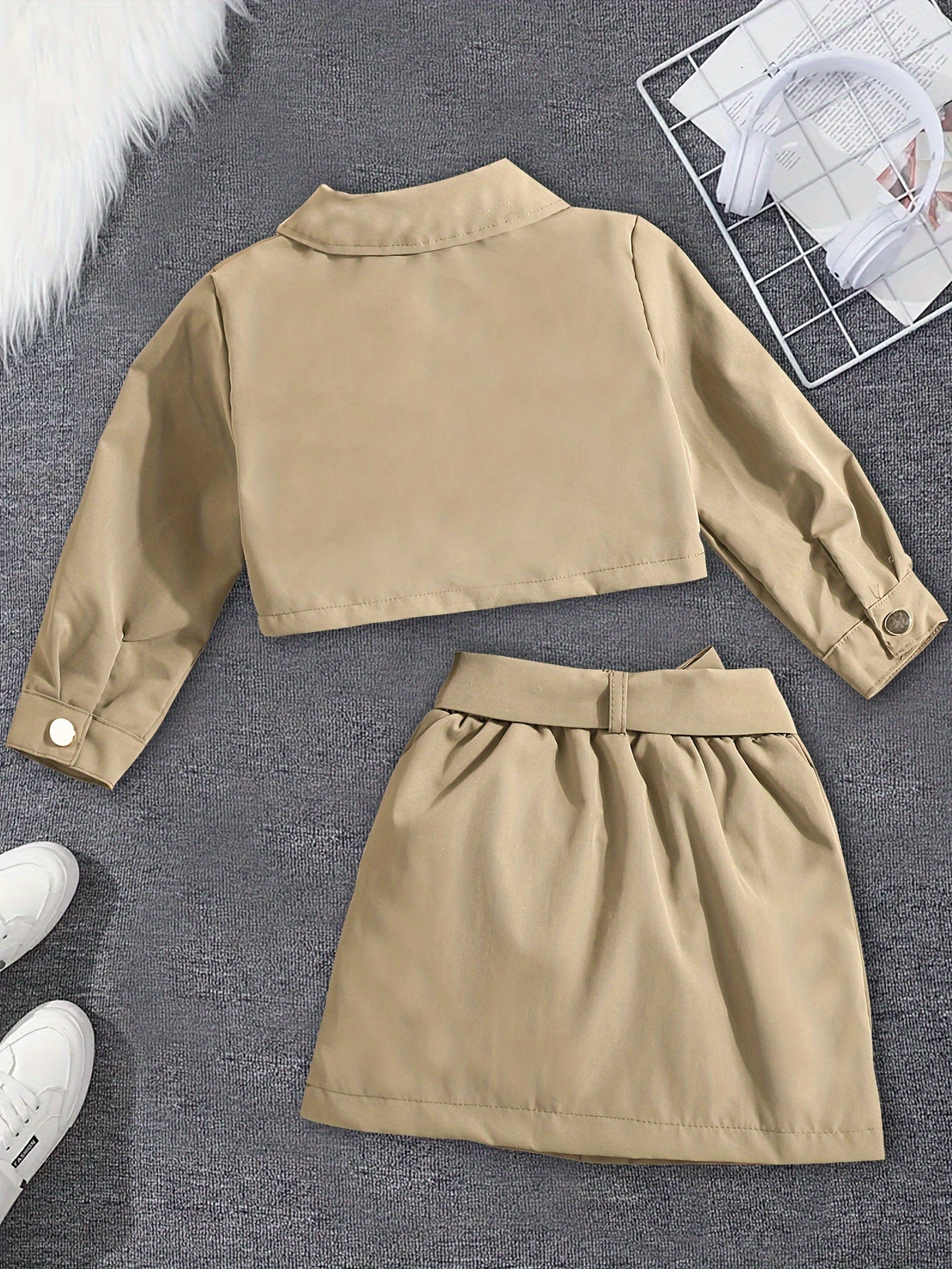 Yozgi/qishki mavsum uchun ideal, tugma tafsiloti, kamar va bir xil rangga ega bo'lgan zamonaviy qizlar uchun bluzka va yubka to'plami.