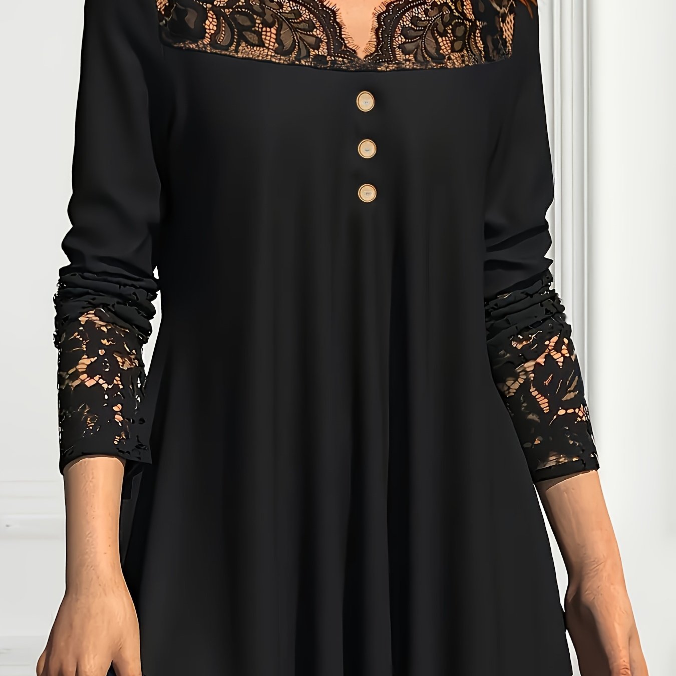 Katta o'lchamlar uchun zamonaviy dantel qirralar bilan V-shaklidagi tunika, uzun yenglar, cho'ziluvchan yarim shaffof mato, rang blokli dizayn va erkin kesim.