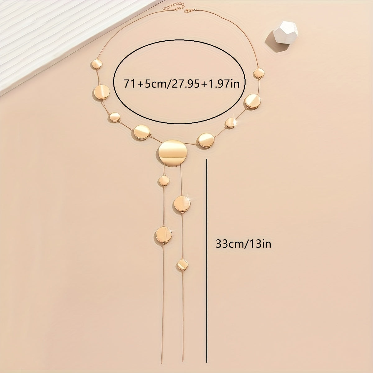 Zarif oltin ranglarida uslubiy uzun Y-shaklidagi marjon, geometrik dumaloq toshlar bilan - osonlik bilan zamonaviy va modali, har kuni kiyish uchun ideal.