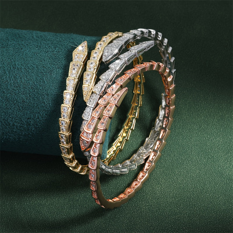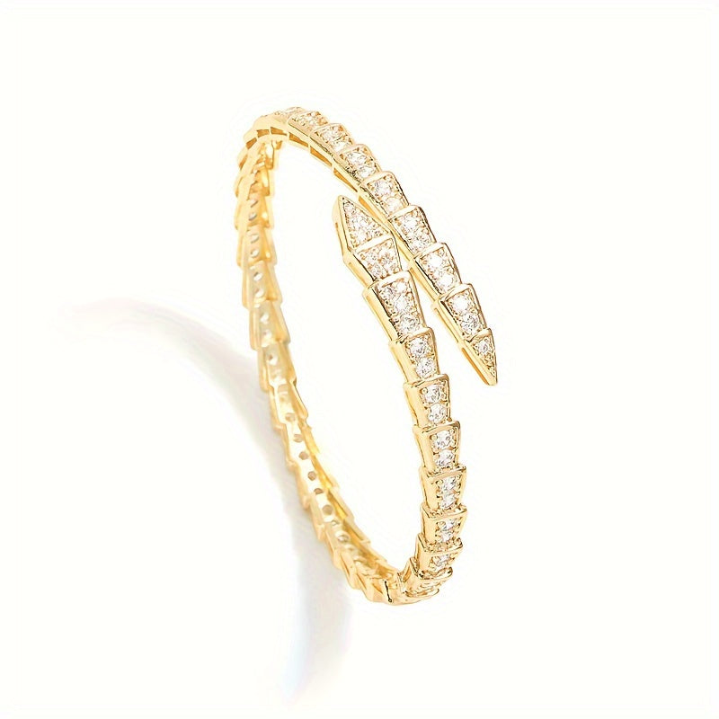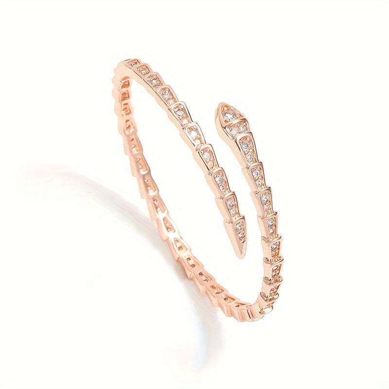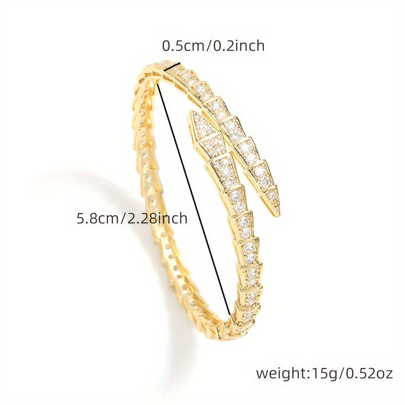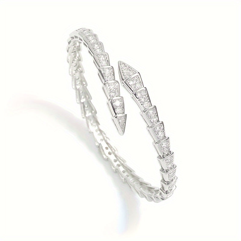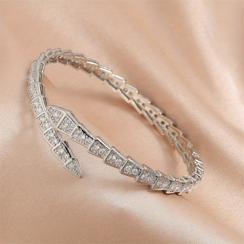 "Ilon shaklidagi zamonaviy ochiq bilaguzuk, porloq kubik zirkonlar bilan bezatilgan - ayollarning tasodifiy kiyimlari uchun oddiy, lekin nafis moda aksessuar"