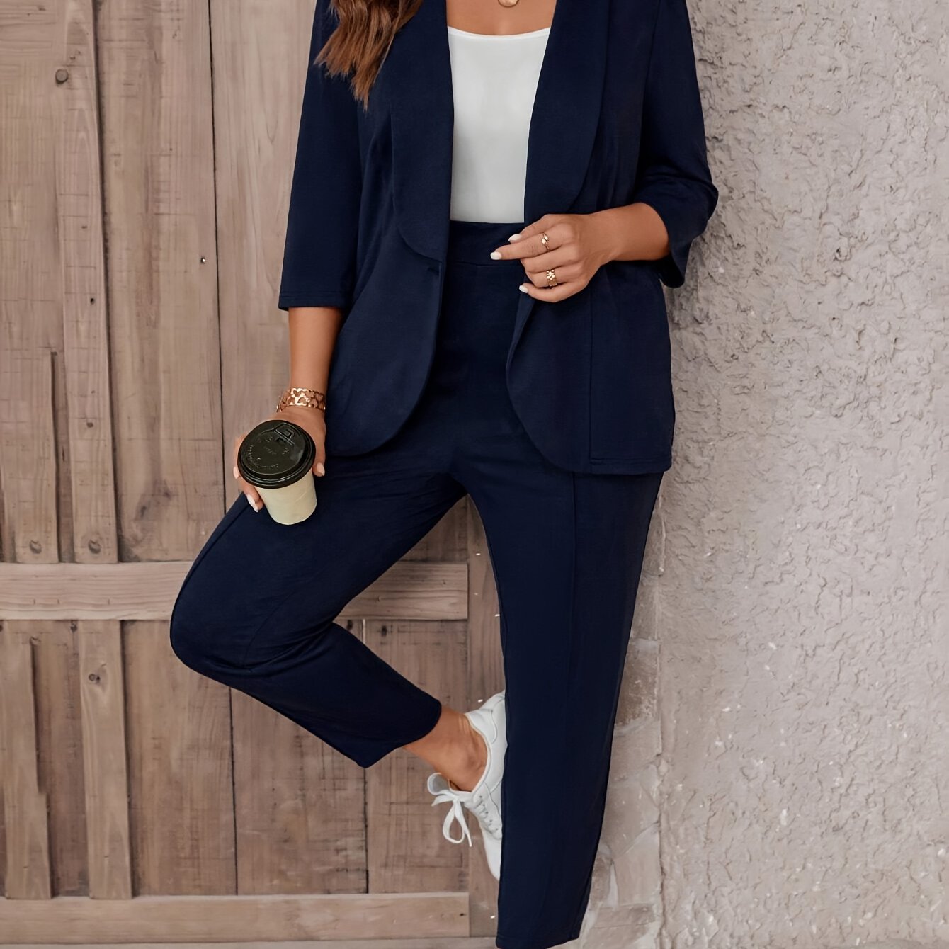 Zamonaviy ayollar uchun uslubiy katta o'lchamli geometrik kostyum; qora va oq naqsh, yengsiz blazer, yengli yaka, mashinada yuvish mumkin bo'lgan polyester mato.
