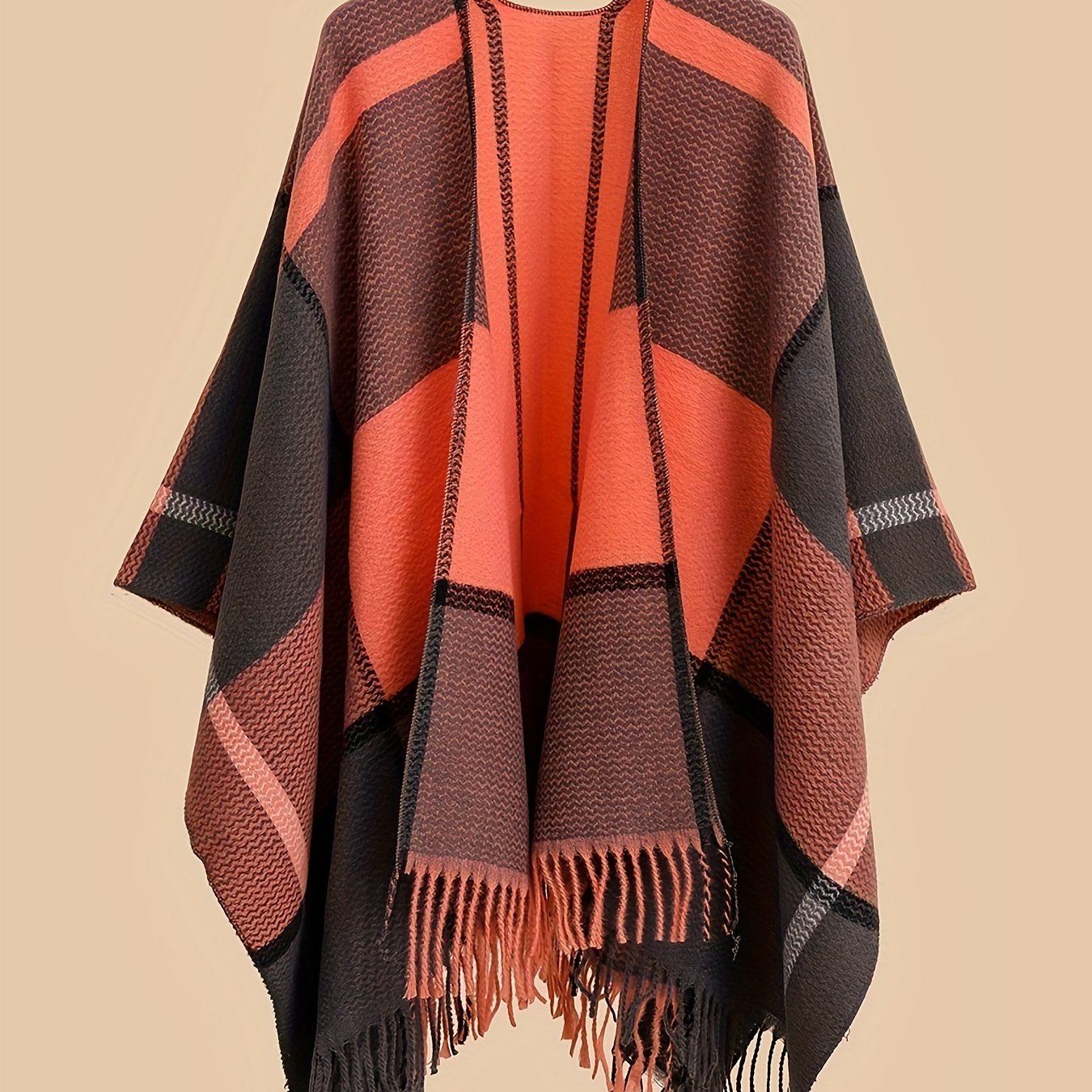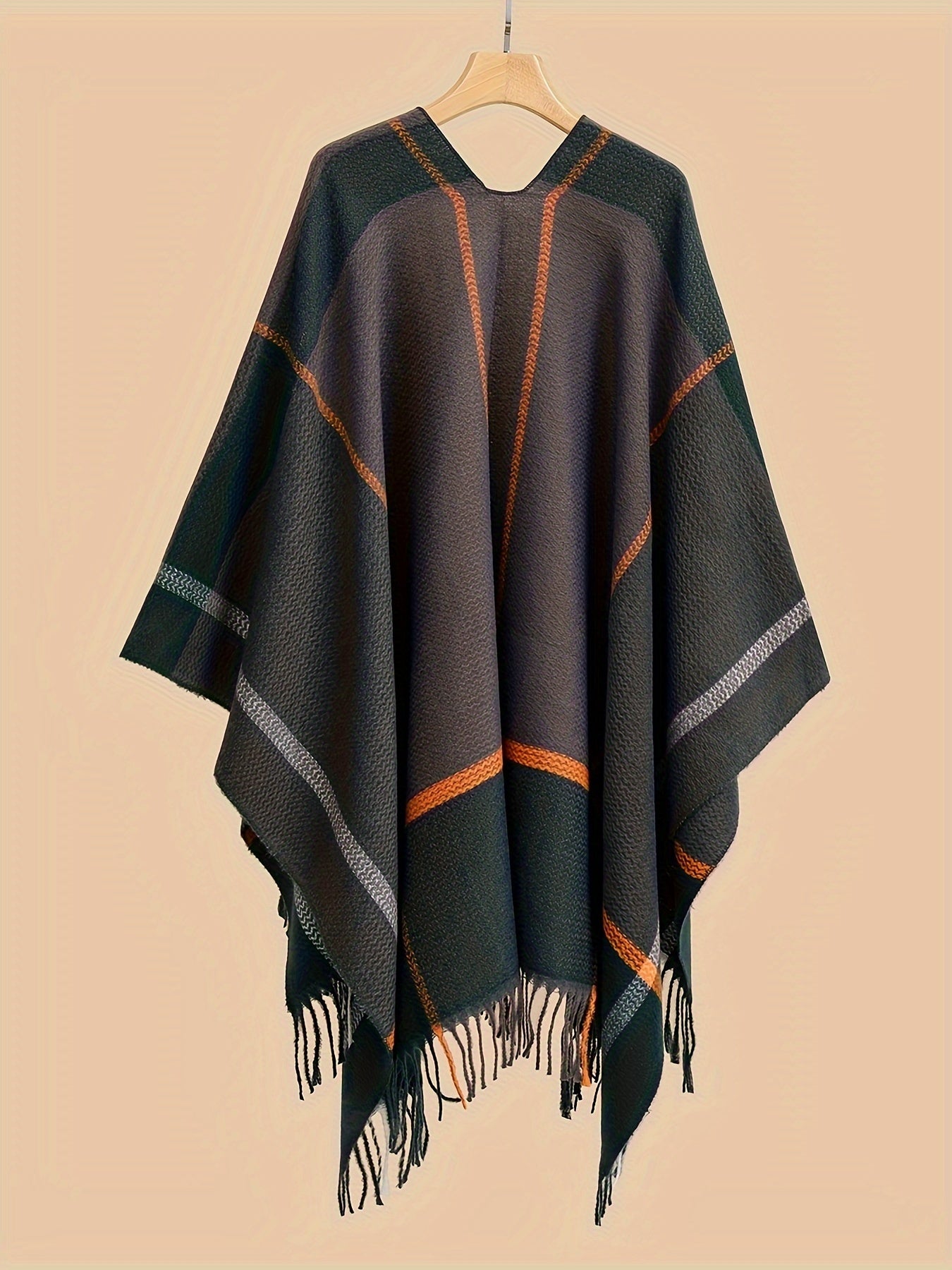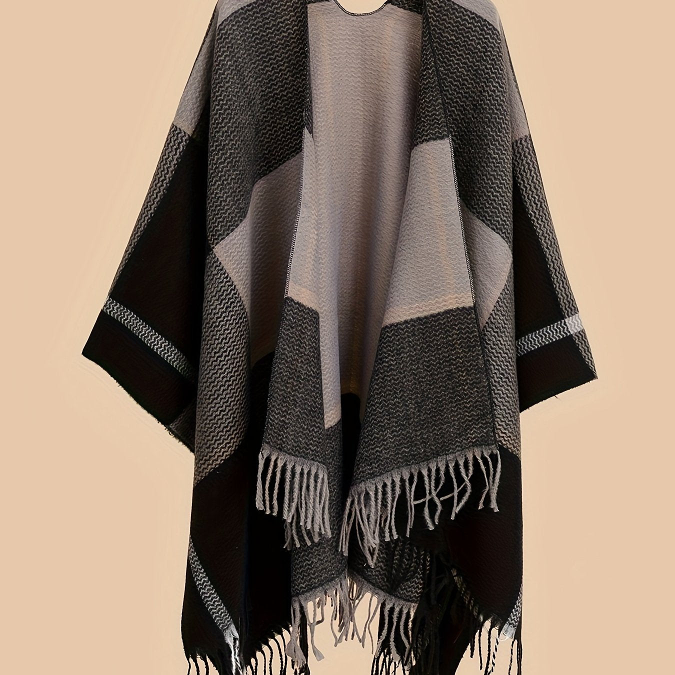 Kiyim-kechak uchun zamonaviy kattalar o'lchamidagi shal qopqoq, tassellari bilan kuz/qish partiyalari uchun, V-shakl, asimmetrik pastki qismi va geometrik naqshga ega.