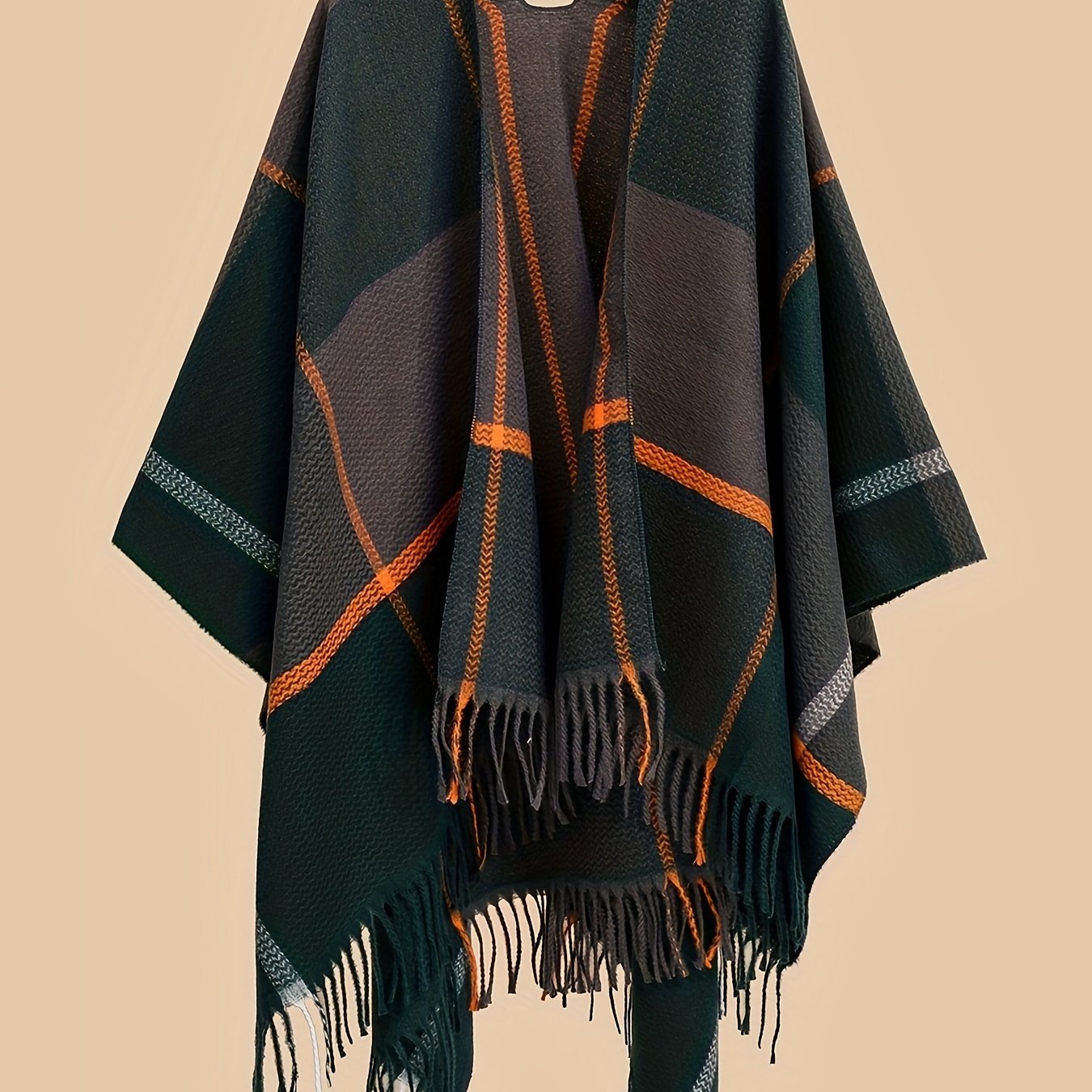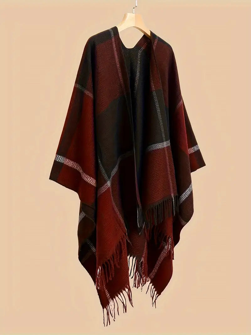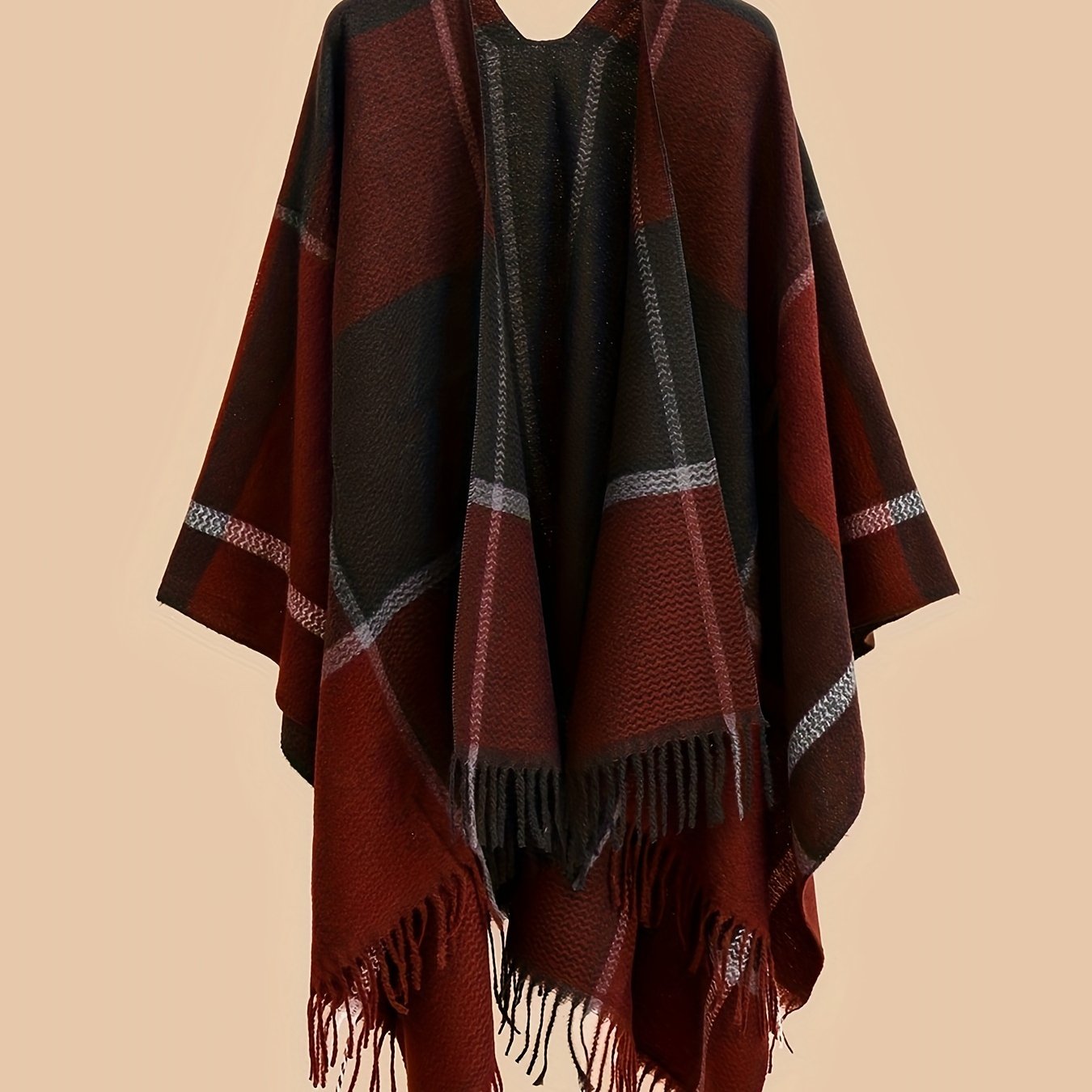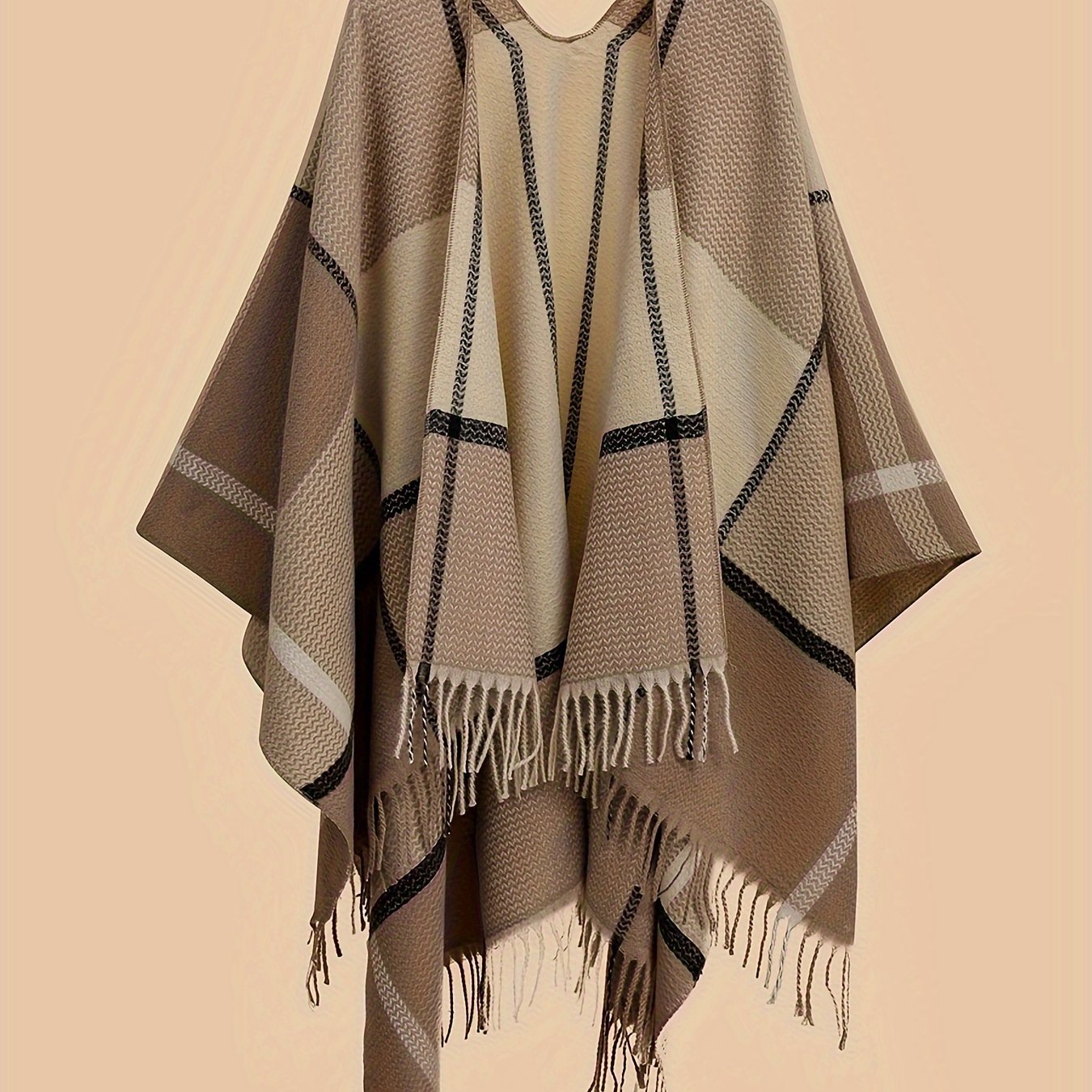 Kiyim-kechak uchun zamonaviy kattalar o'lchamidagi shal qopqoq, tassellari bilan kuz/qish partiyalari uchun, V-shakl, asimmetrik pastki qismi va geometrik naqshga ega.