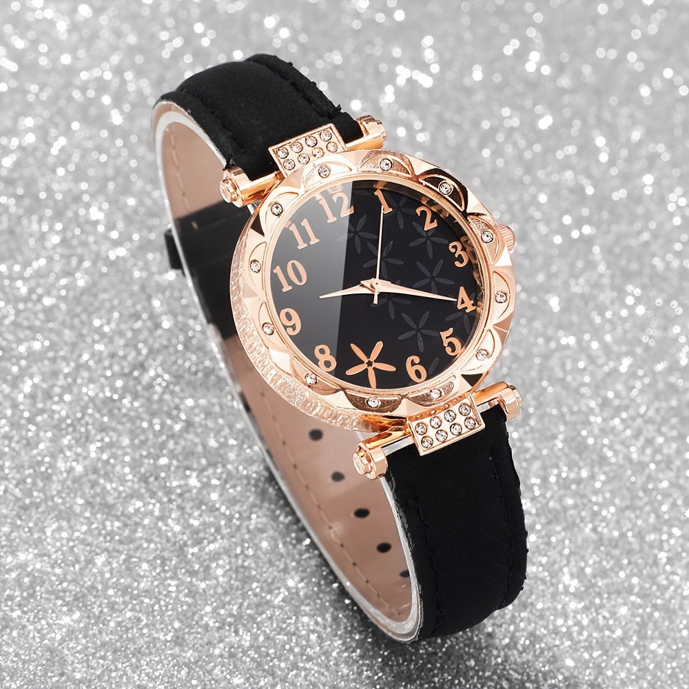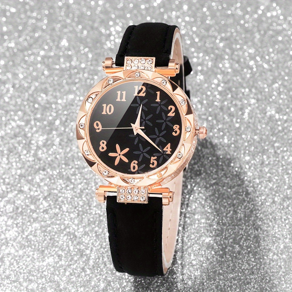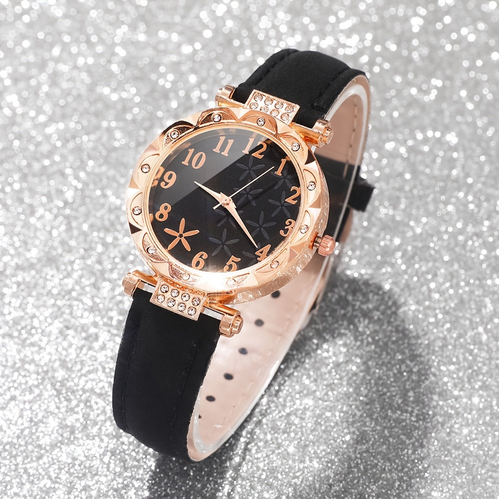 6 ta ayollar moda soatlari va bilakuzuklar to'plami, kvarts, rhinestone, sun'iy charm, gulli qobiq bilan