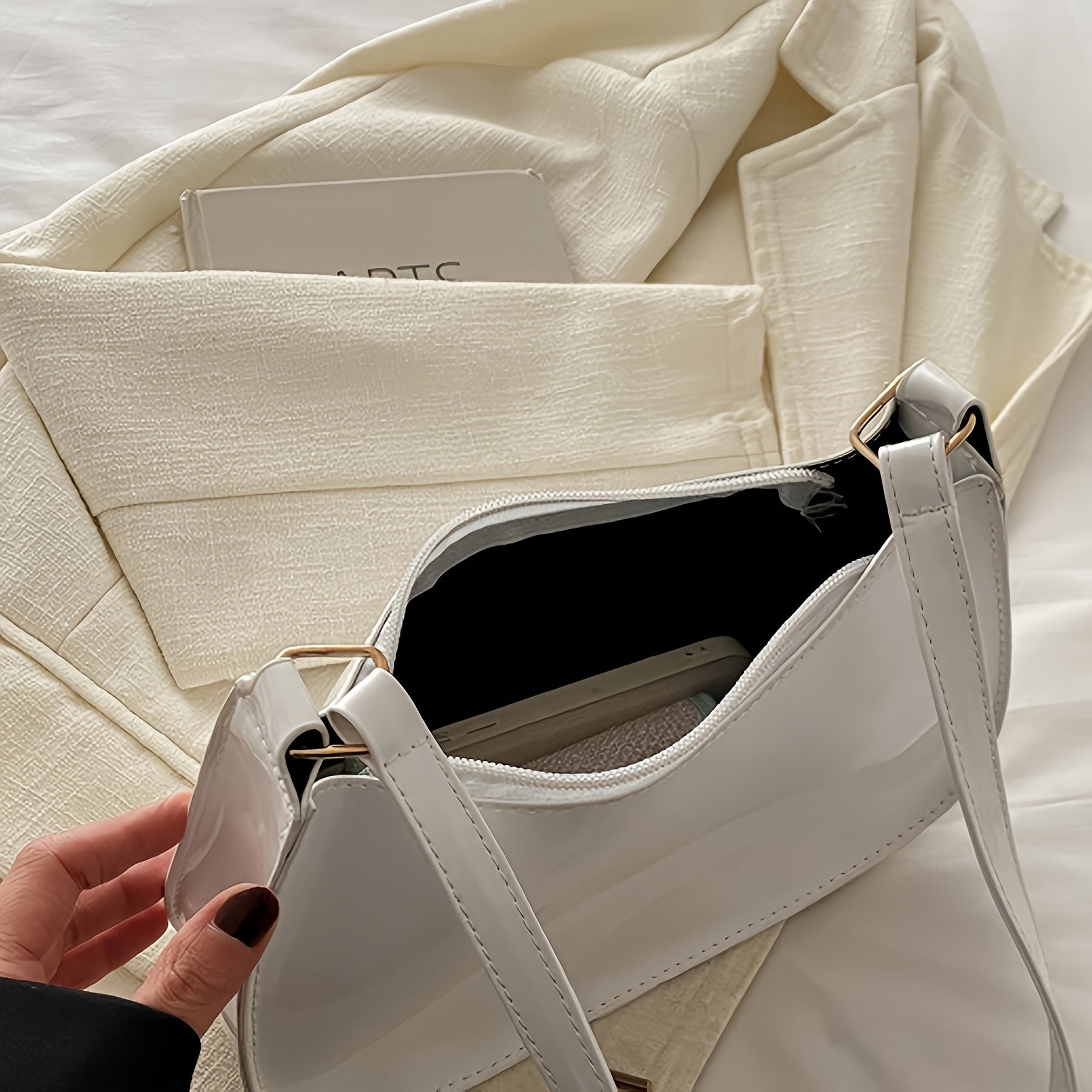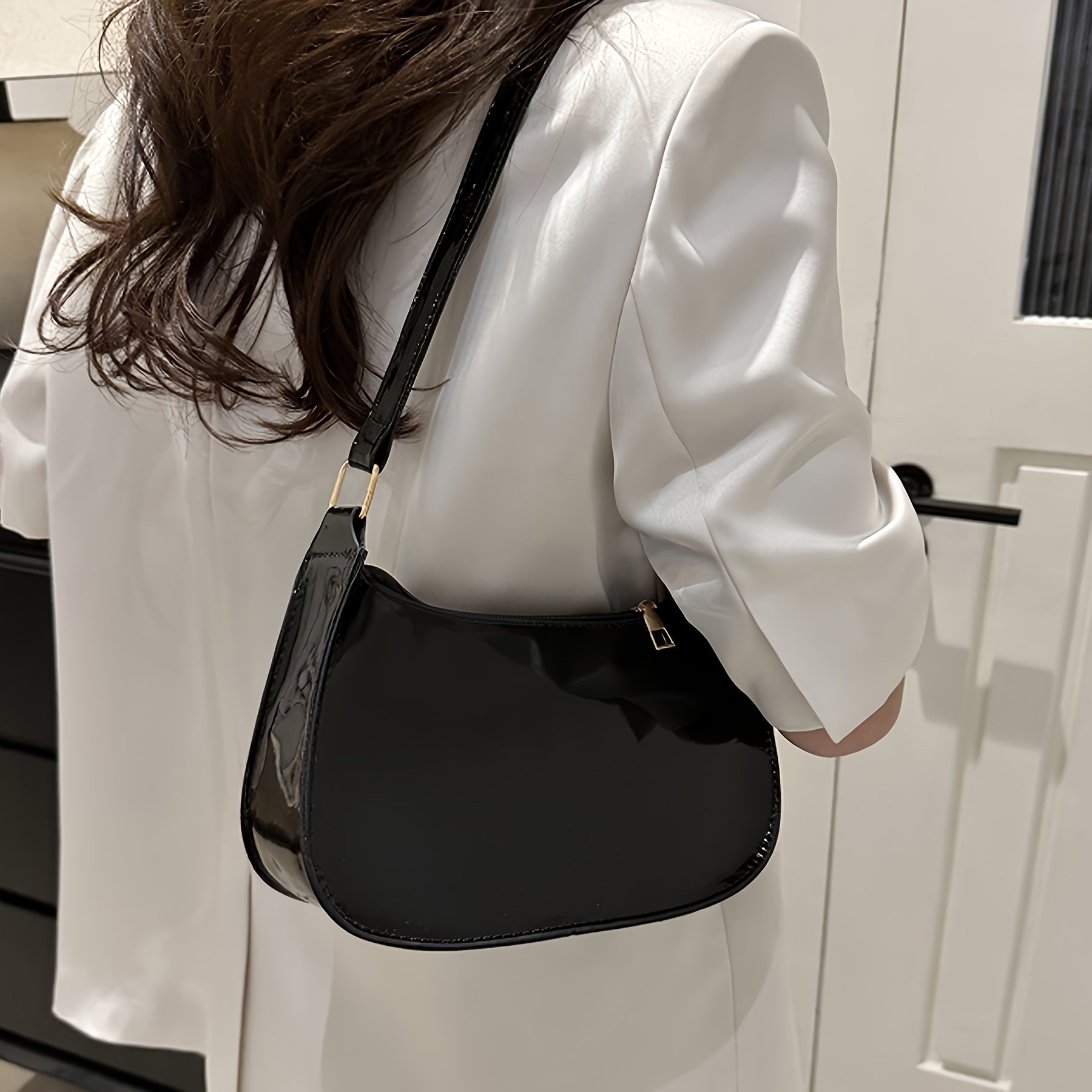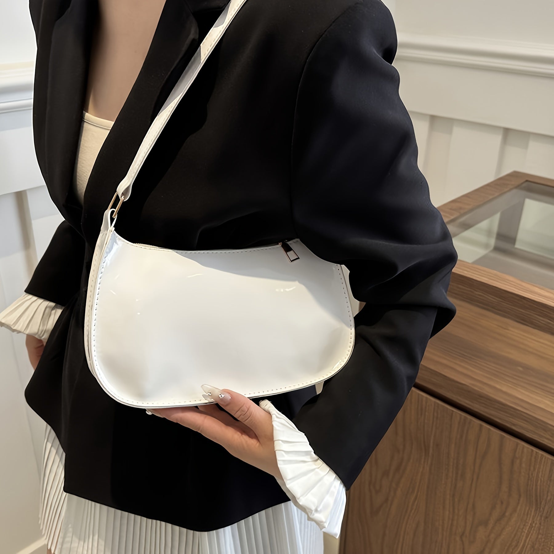 Zipper yopilishi va chet bo'yog'i bilan zamonaviy bir rangli PU yelka sumkasi - kundalik foydalanish, xarid qilish va sovg'a berish uchun mukammal. Qo'l bilan yuvilishi mumkin va ichki qismi yo'q.