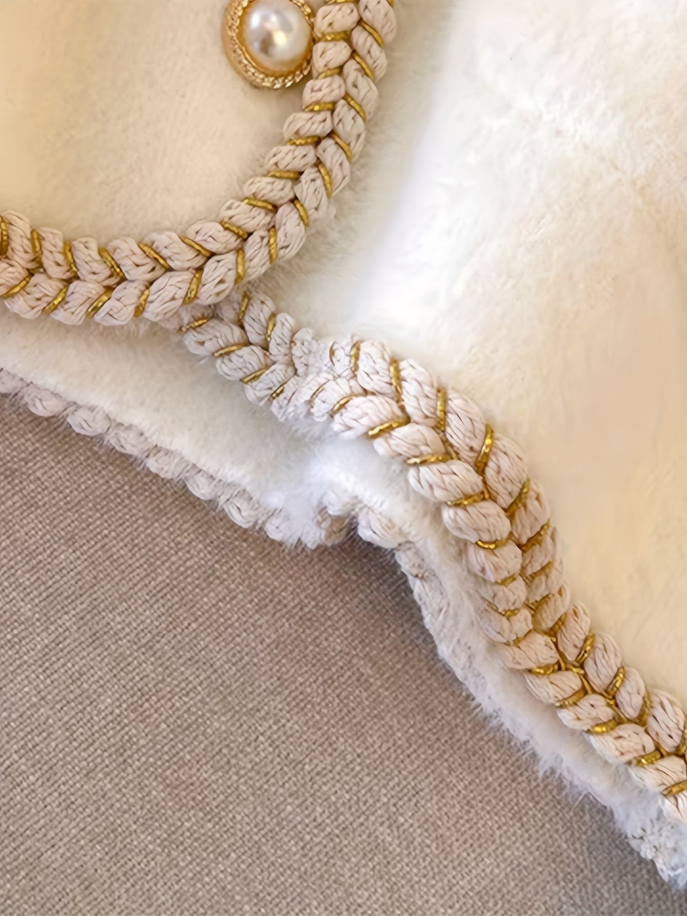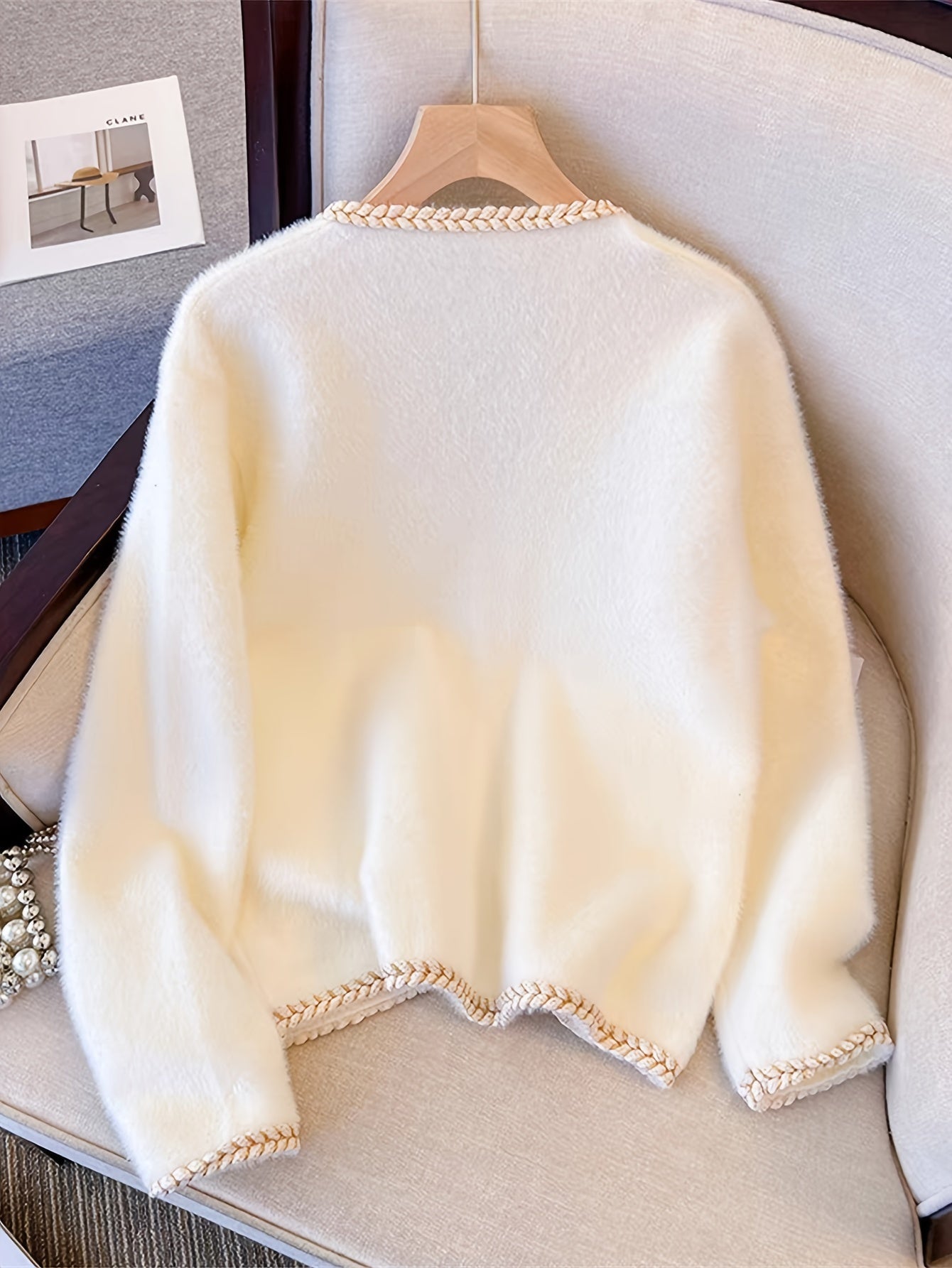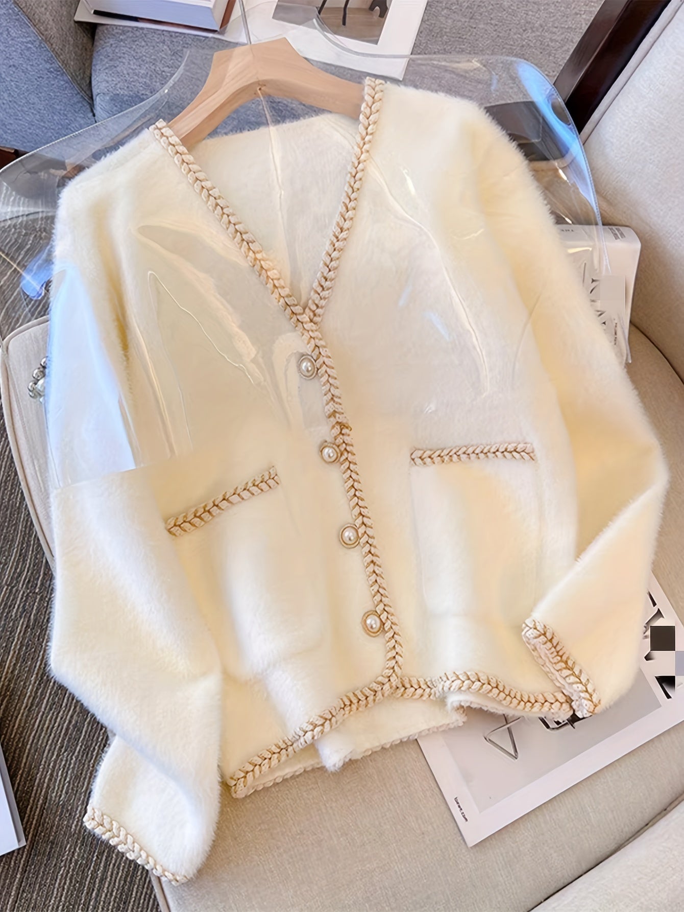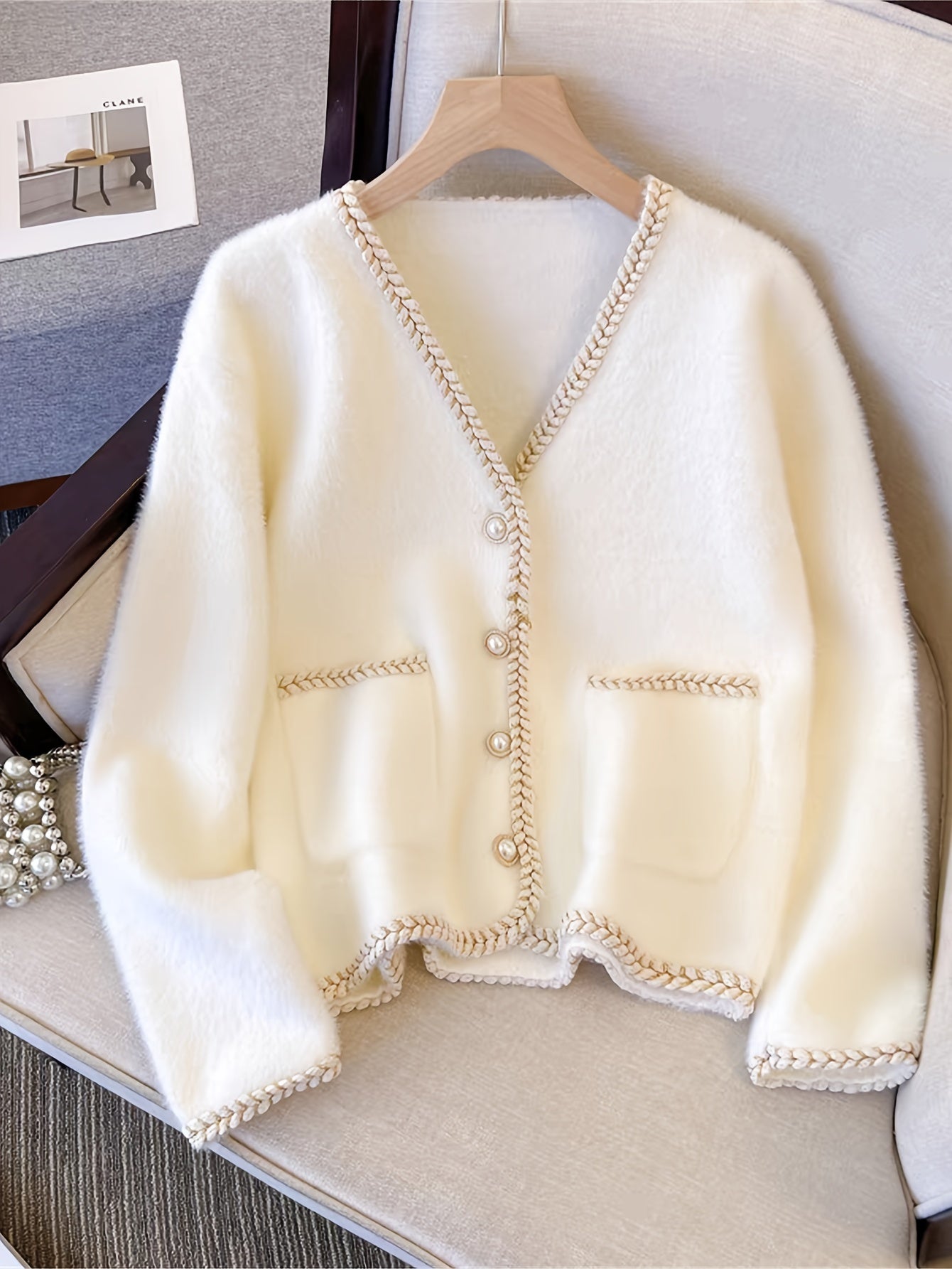 Zarif V-shaklidagi kardigan, soxta marvarid tugmalari bilan, akril va polyester aralashmasidan tayyorlangan, barcha fasllar uchun ideal.