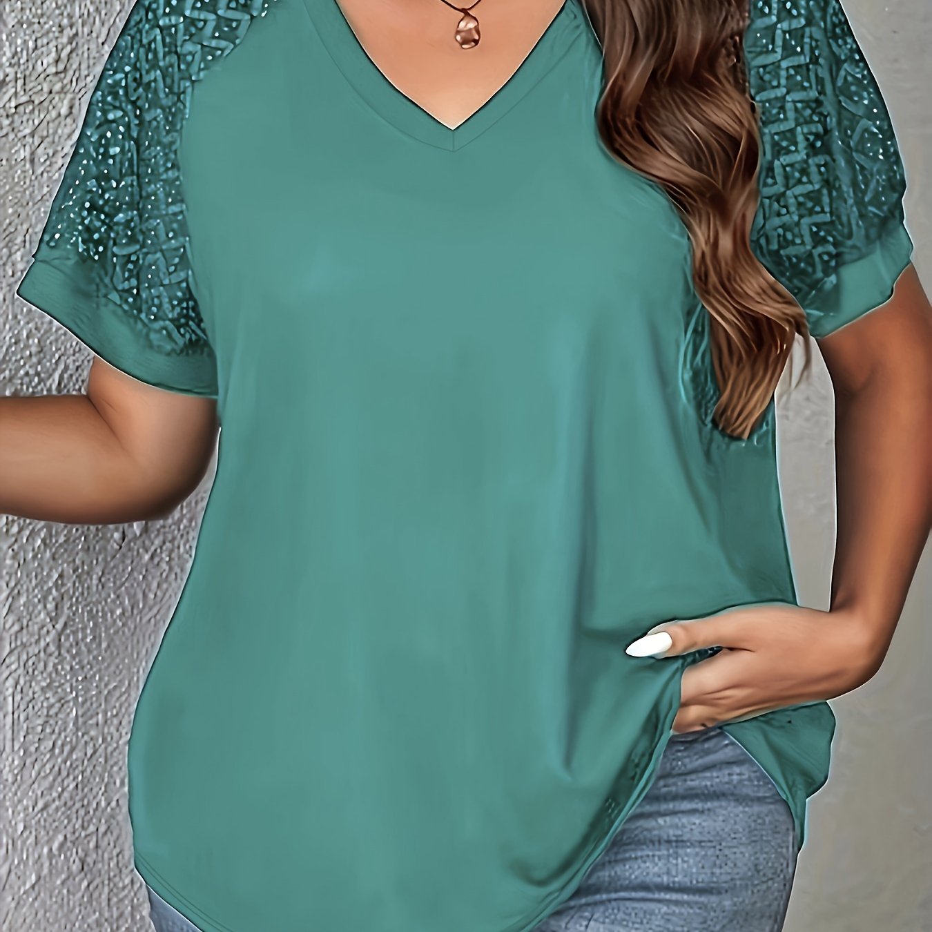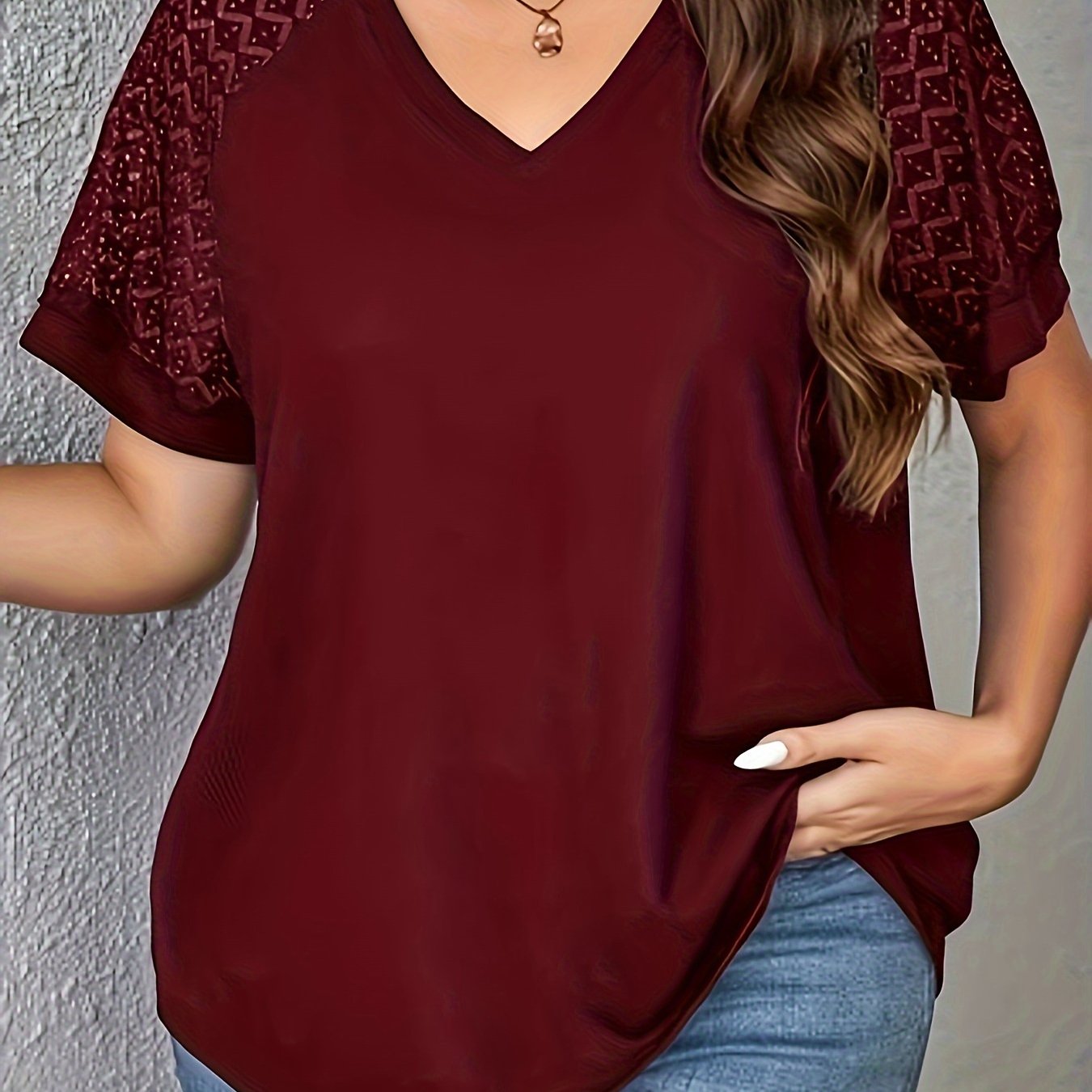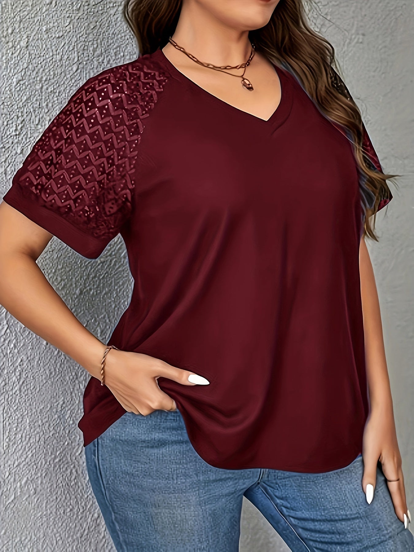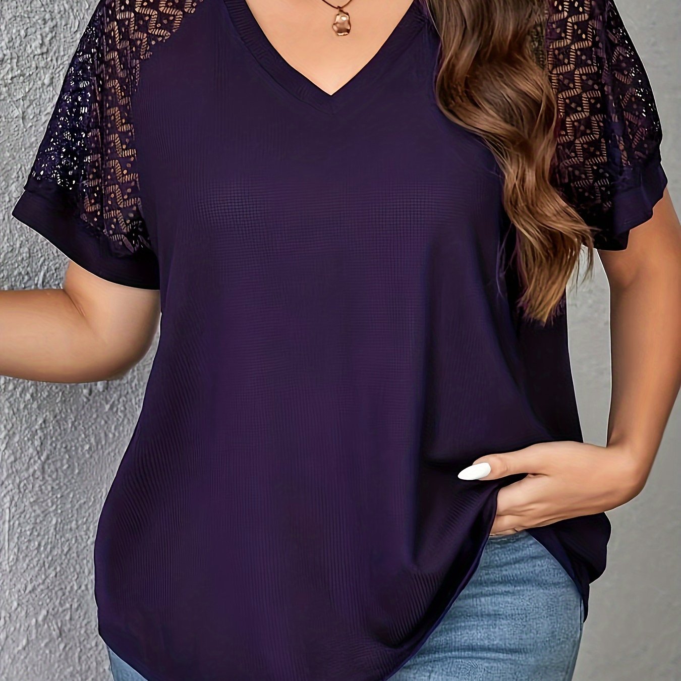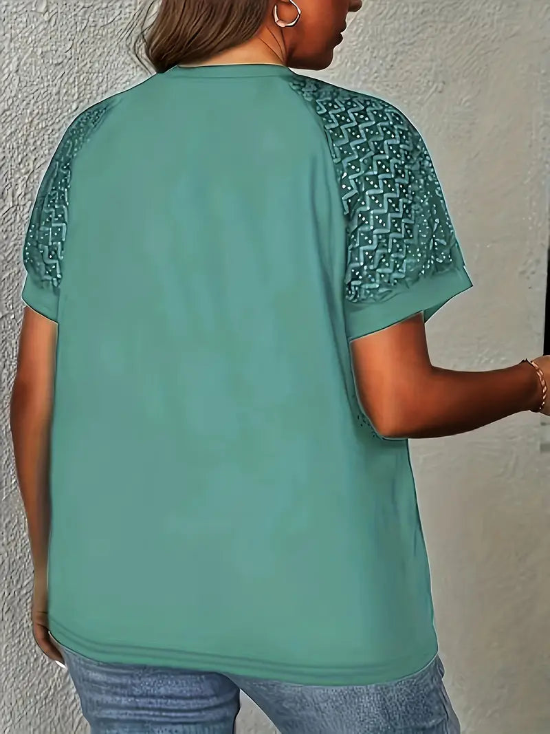 Ayollar uchun zamonaviy V-shaklidagi dantel paneli T-ko'ylagi - Bir rangli, Polyester to'qima, Qisqa yengli tasodifiy yuqori kiyim bahor/yaz uchun