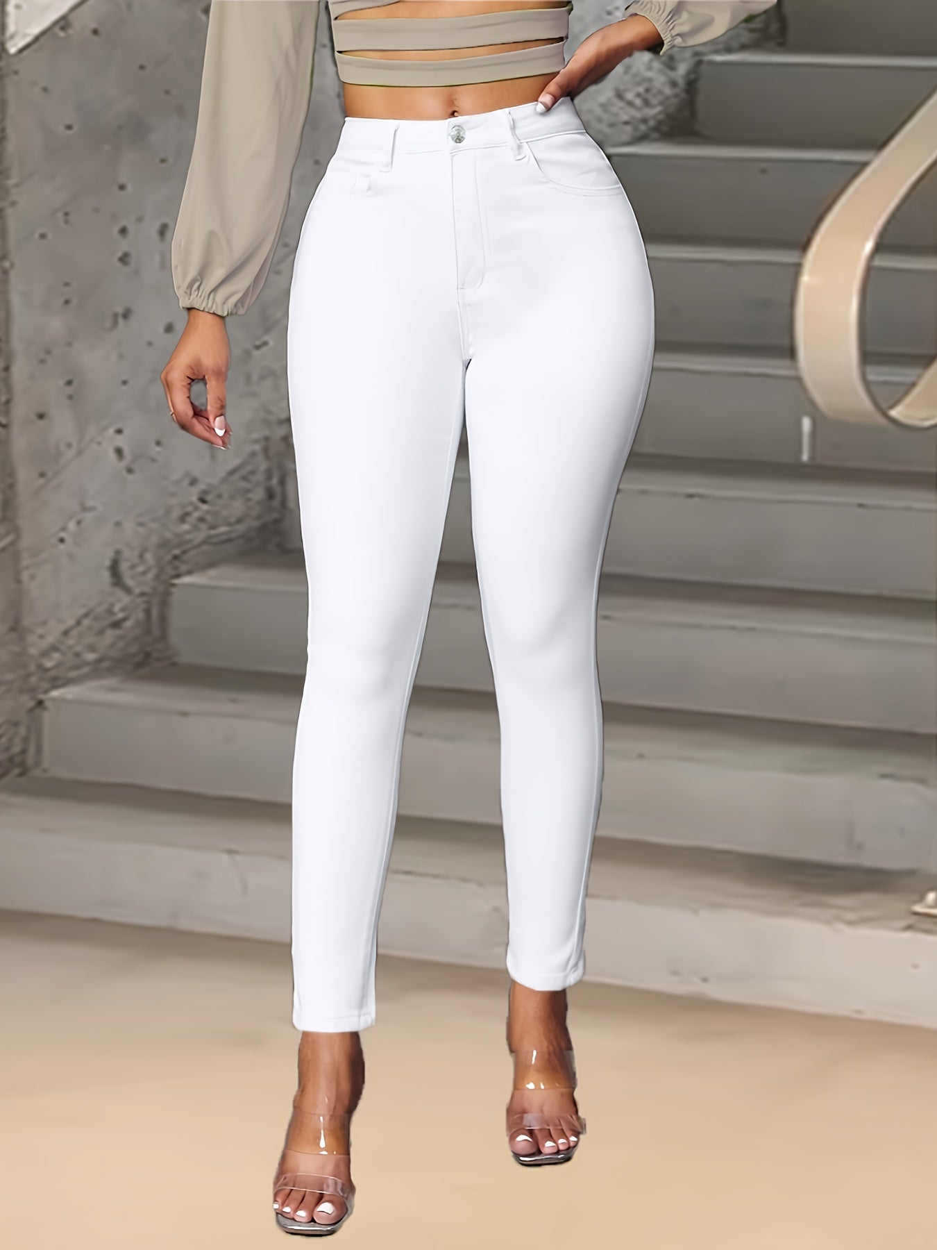 Ayollar uchun zamonaviy oq paxta jinsi shimlar, yuqori elastiklik va uzun uzunlikka ega, mustahkam rang va to'qilgan mato bilan tugma tafsiloti, barcha mavsumlar uchun qulaylikni ta'minlaydi.