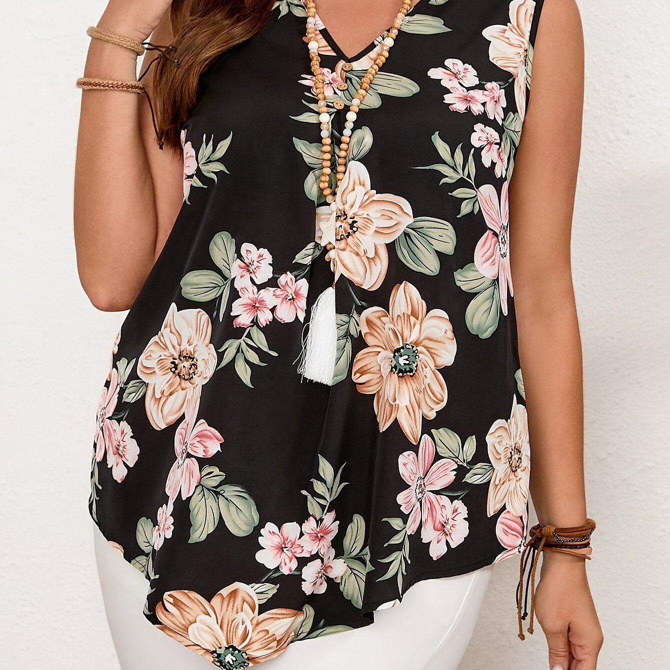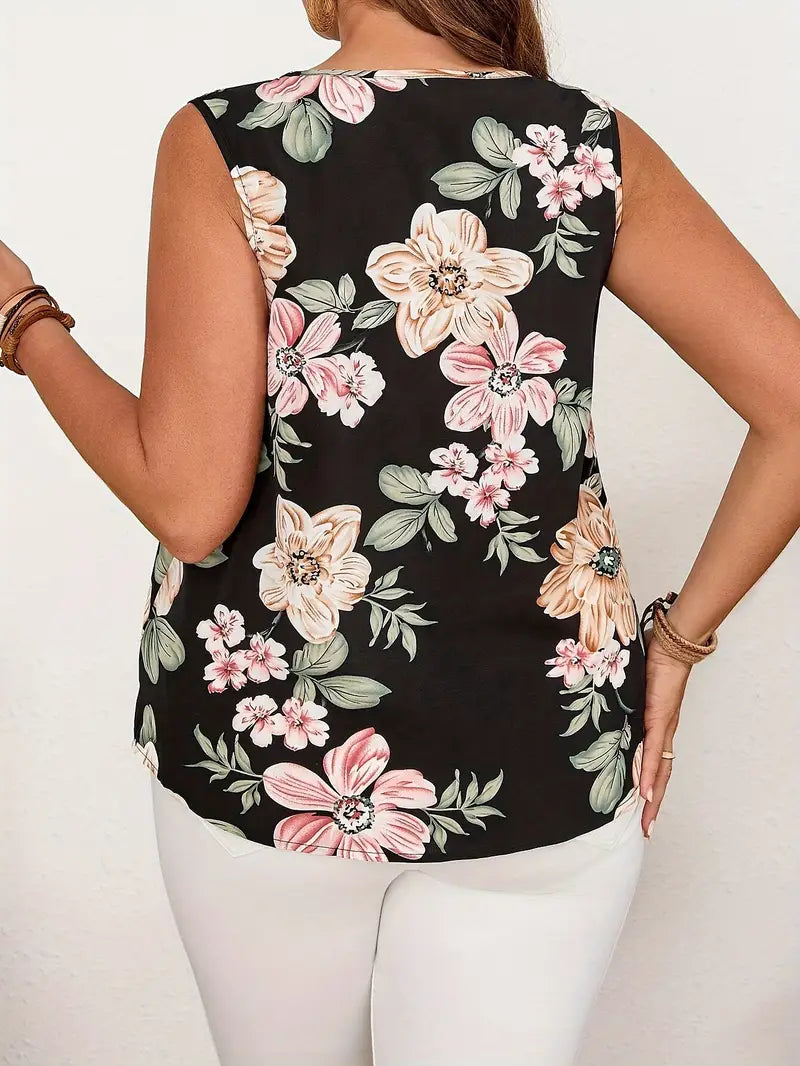 Yozgi 2024 Moda Ayollar V-yoqasi Tank Topi Guli Printi va Soxta Tugma Tafsiloti bilan - Polyester, Mashinada Yuvish Mumkin
