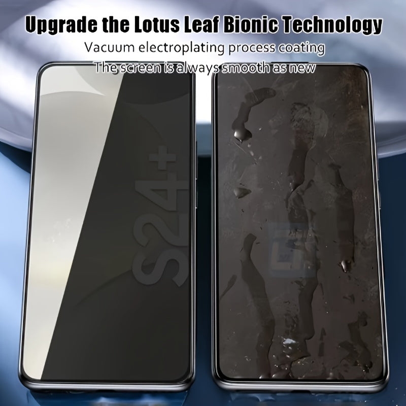 Samsung S25/S24/S23/S22/S21 uchun maxfiylik filtri va porloq qoplama bilan temperlangan shisha ekran himoyachisi. To'liq qoplama, barmoq izlari bilan ochish mosligi va lotus bargi bionik xususiyatlariga ega.