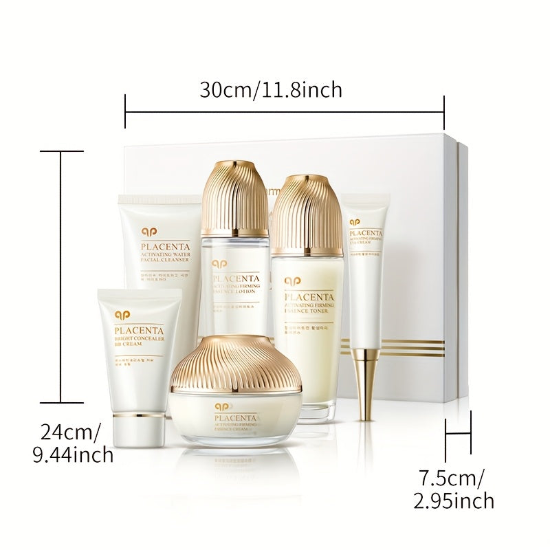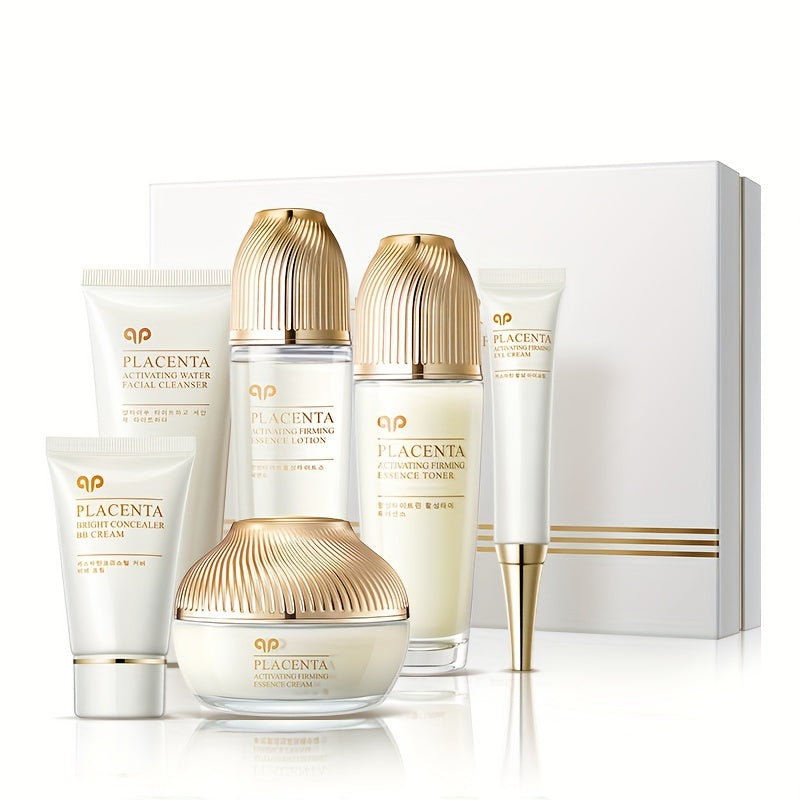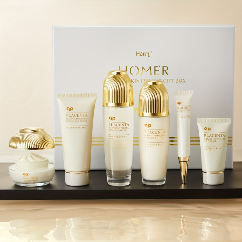 "Terini mustahkamlash va namlantirish uchun 6 ta mahsulotdan iborat bo'lgan Terini parvarish qilish sovg'a qutisi, yuzni namlantiruvchi loson, essensiya suvi, essensiya losoni, essensiya kremi, yuz tozalovchi vosita, ko'z kremi"