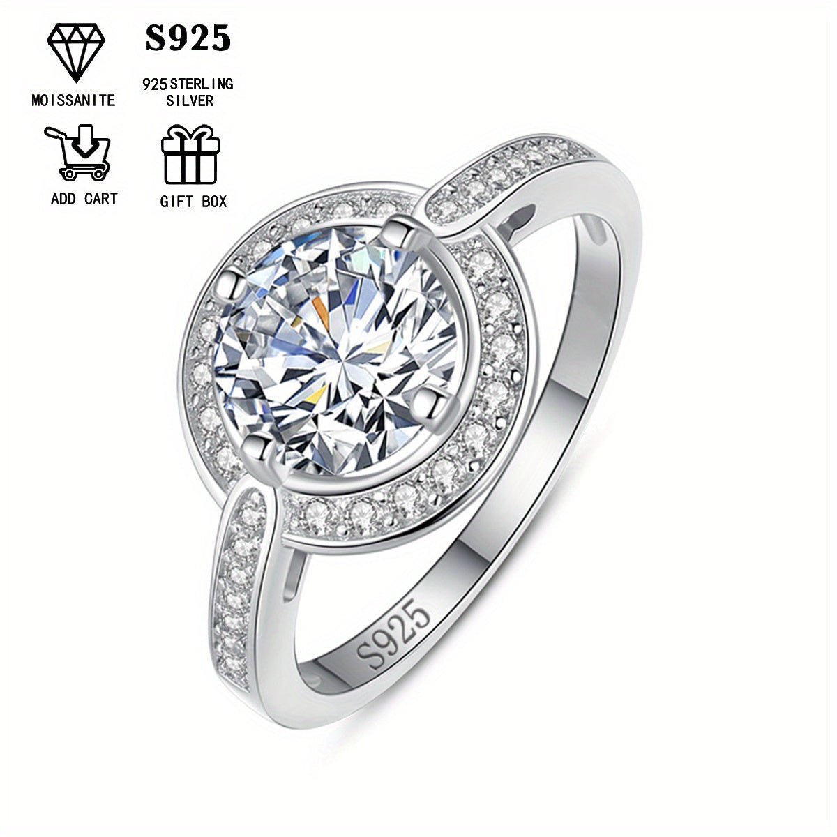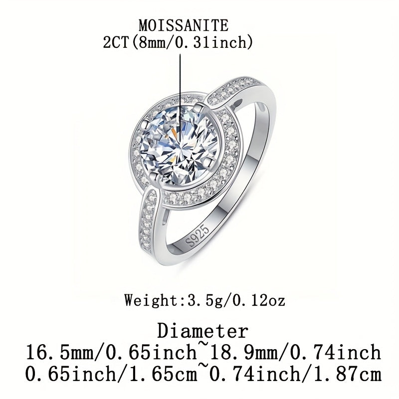 Bu 2ct/3ct Moissanite dumaloq olmosi kesimi dizayni bilan bezatilgan go'zal va ko'p qirrali S925 gipoallergen kumush uzuk. Bu har qanday tadbir uchun, masalan, takliflar, yubileylar, 14-fevral yoki shunchaki kundalik kiyish uchun mukammal sovg'a.
